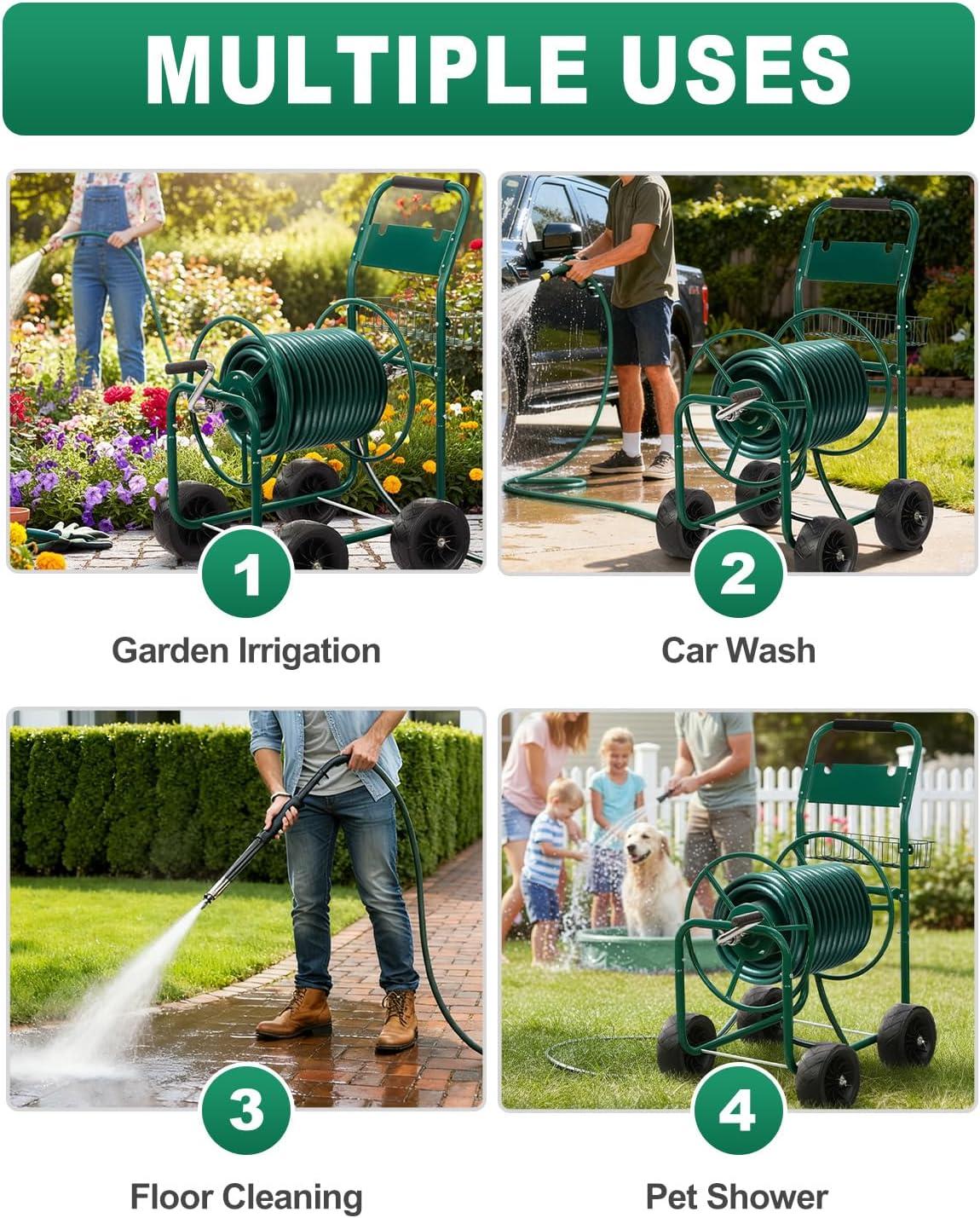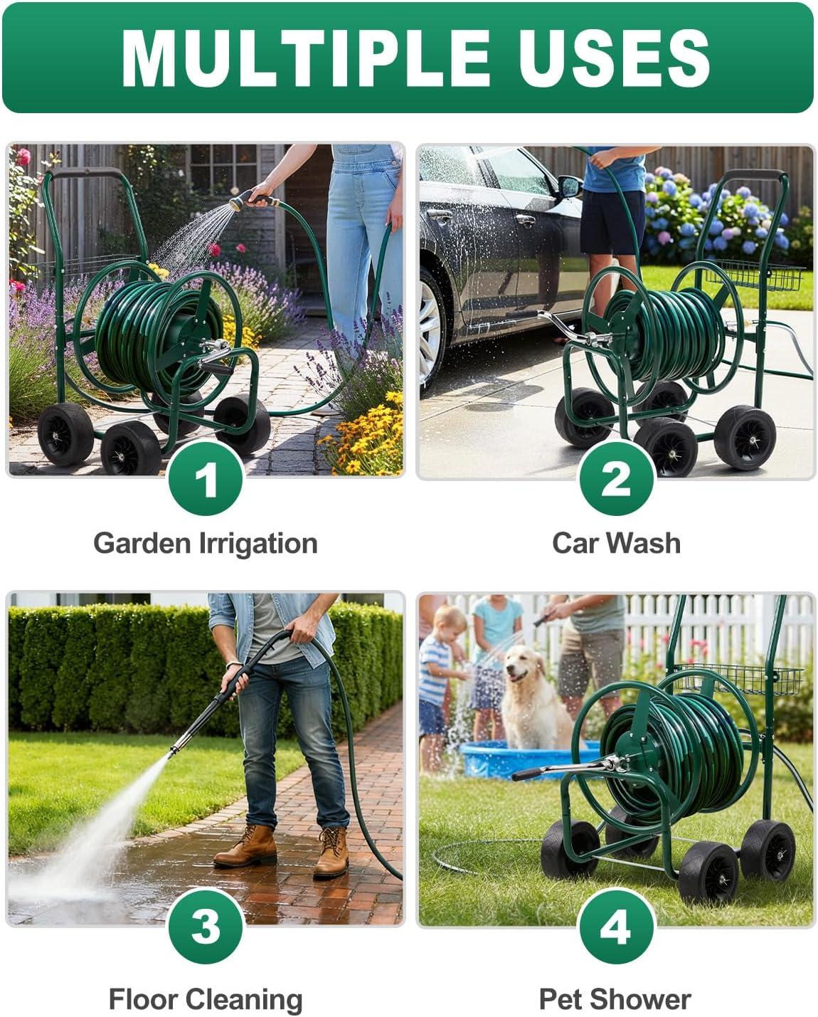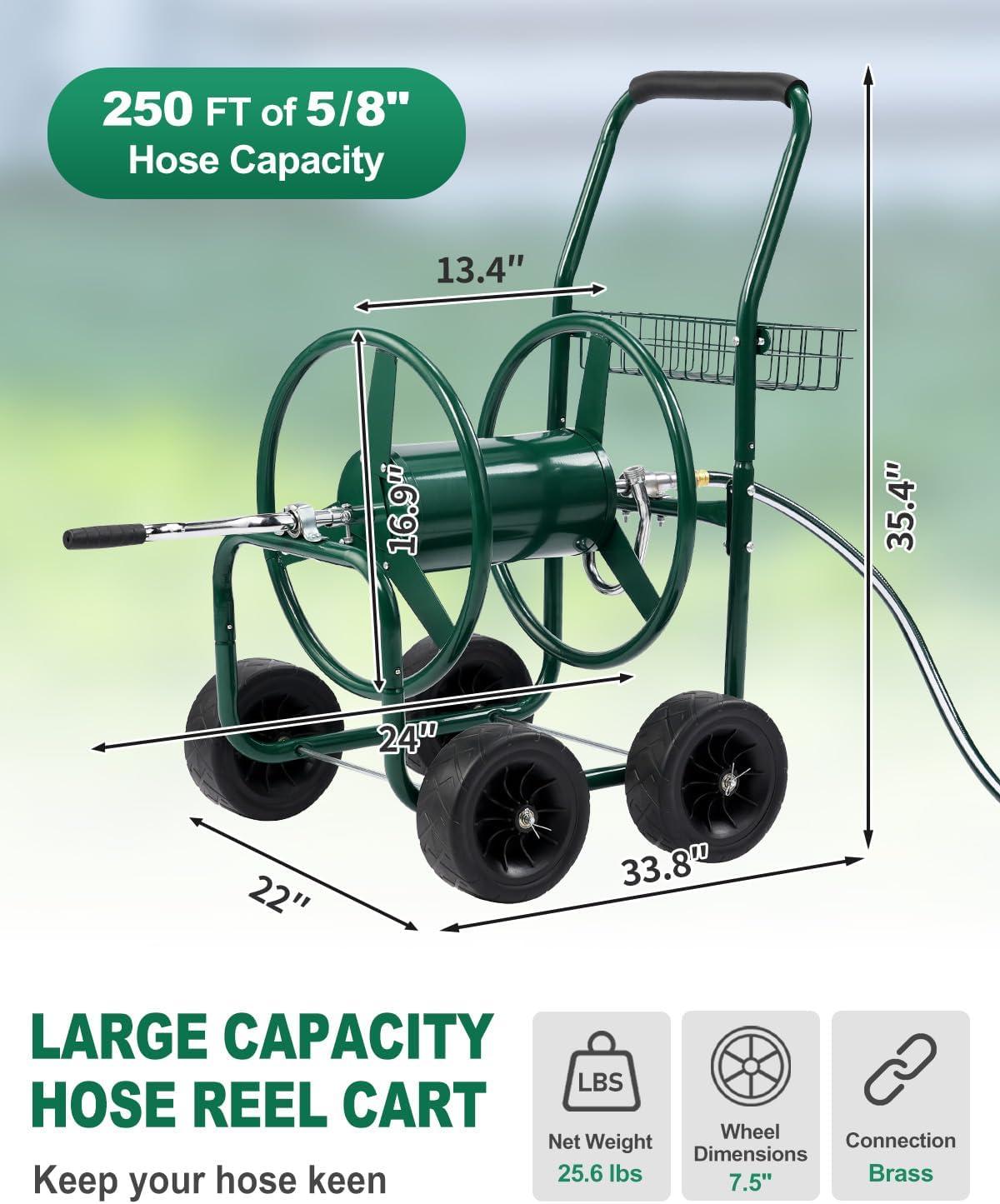 【Large Capacity Hose Reel】 Our hose cart can hold up a 300 ft (5/8″) or 400 ft (1/2″) of hose. The length and capacity of water hose make it suitable for most commercial farms and family gardens. The extra storage basket can store gardening tools or garden irrigation material