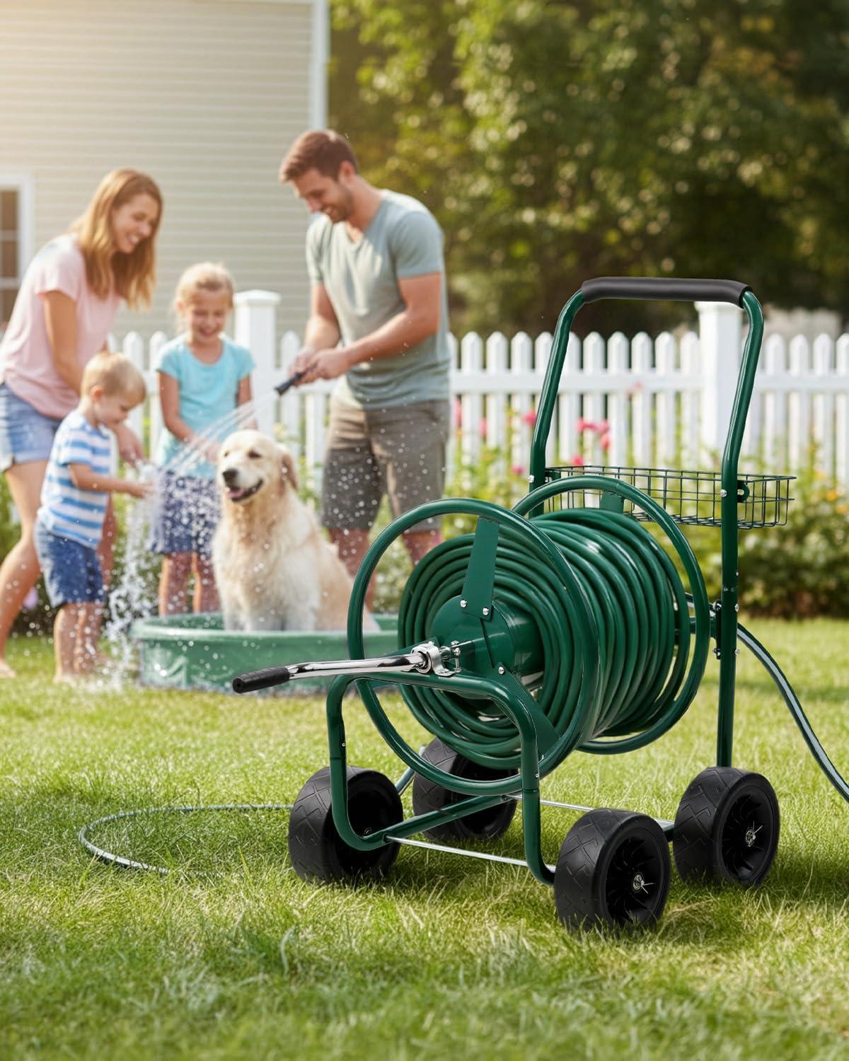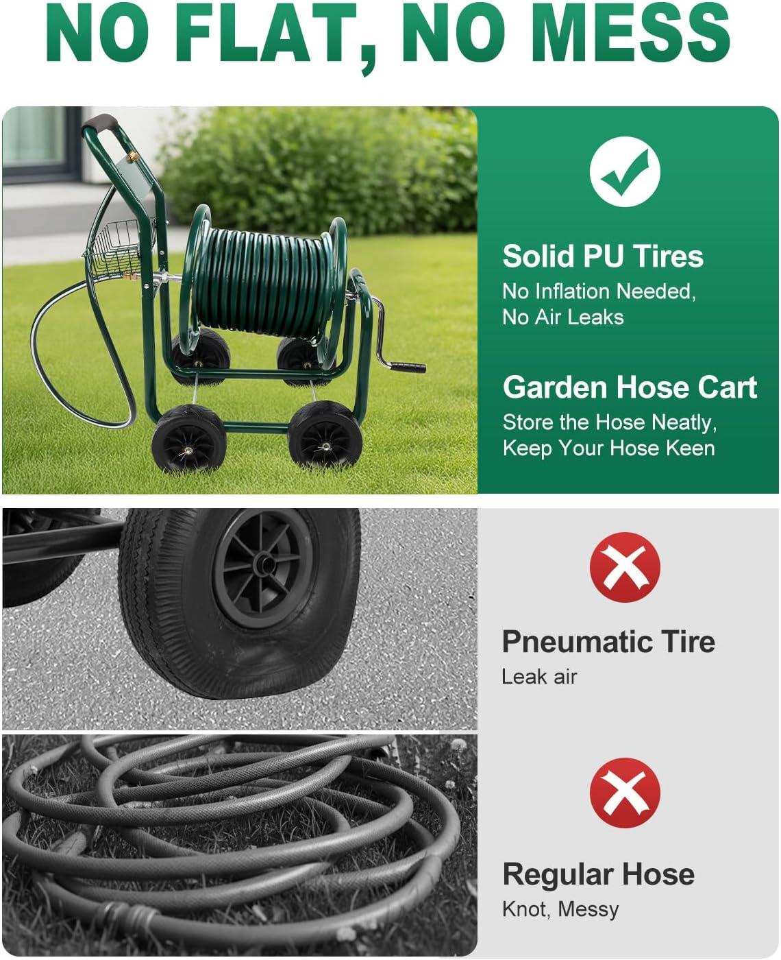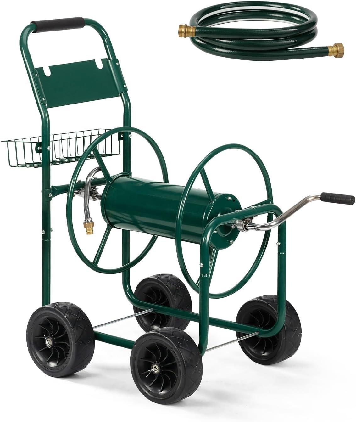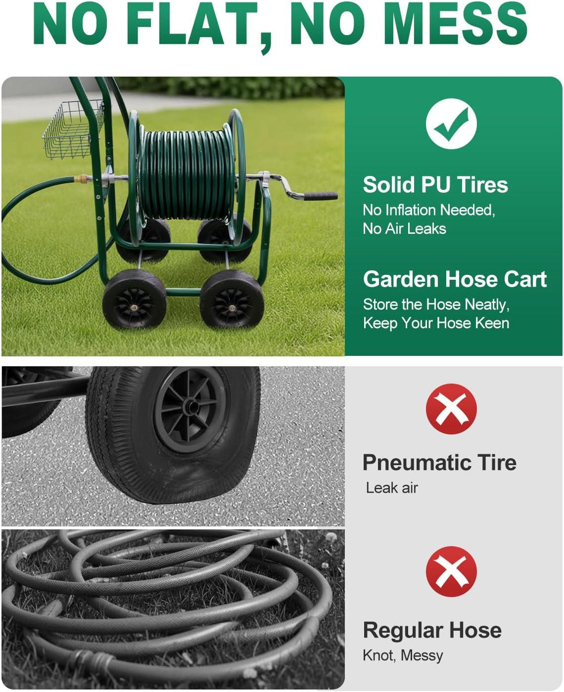 【Large Capacity Hose Reel】 Our hose cart can hold up a 300 ft (5/8″) or 400 ft (1/2″) of hose. The length and capacity of water hose make it suitable for most commercial farms and family gardens. The extra storage basket can store gardening tools or garden irrigation material