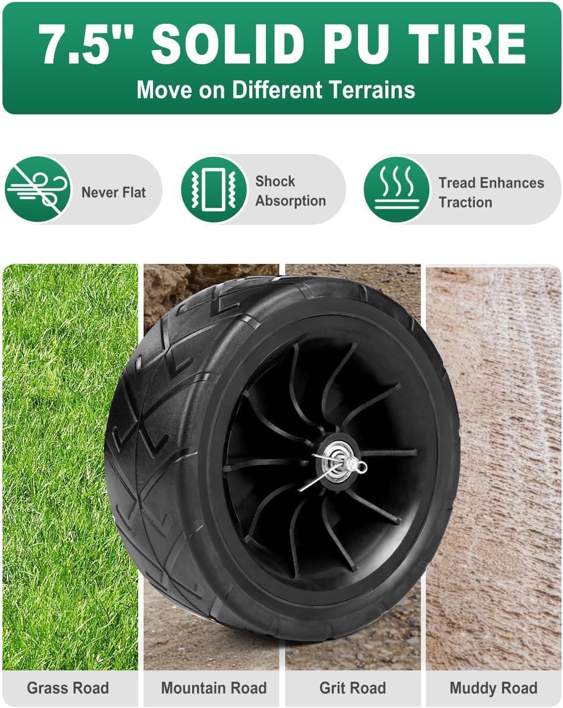 【Easy to Use】The non-slip crank handle is used for winding and unwinding the hose. The ergonomic handlebar allows you to push the hose cart with ease. This garden reel cart has 7.5 inch PU tires and allows for easy mobility over any terrain in your home or other commercial places. The low center of gravity helps prevent tipping