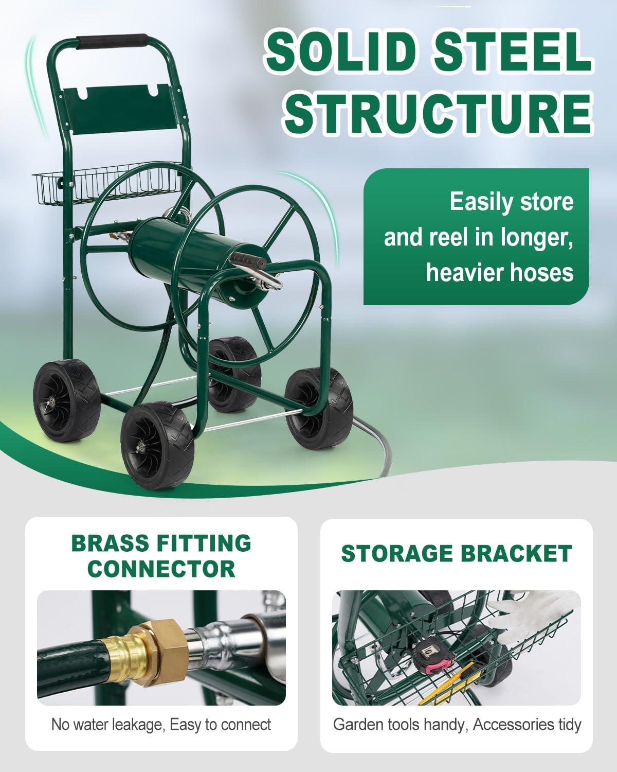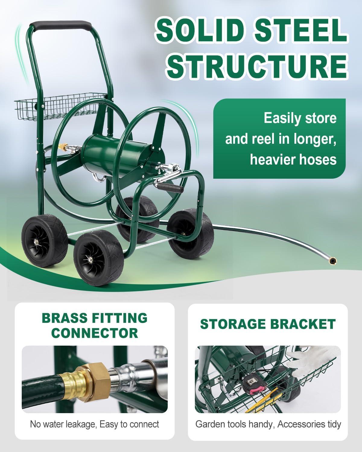 【Heavy Duty Metal Construction】Constructed from heavy duty metal frame, the reel cart is durable and sturdy. With the powder coated finish, the cart could be used for a long time with good weather resistance. In addition, the connection of the inlet hose is made of premium brass that prevents leaking