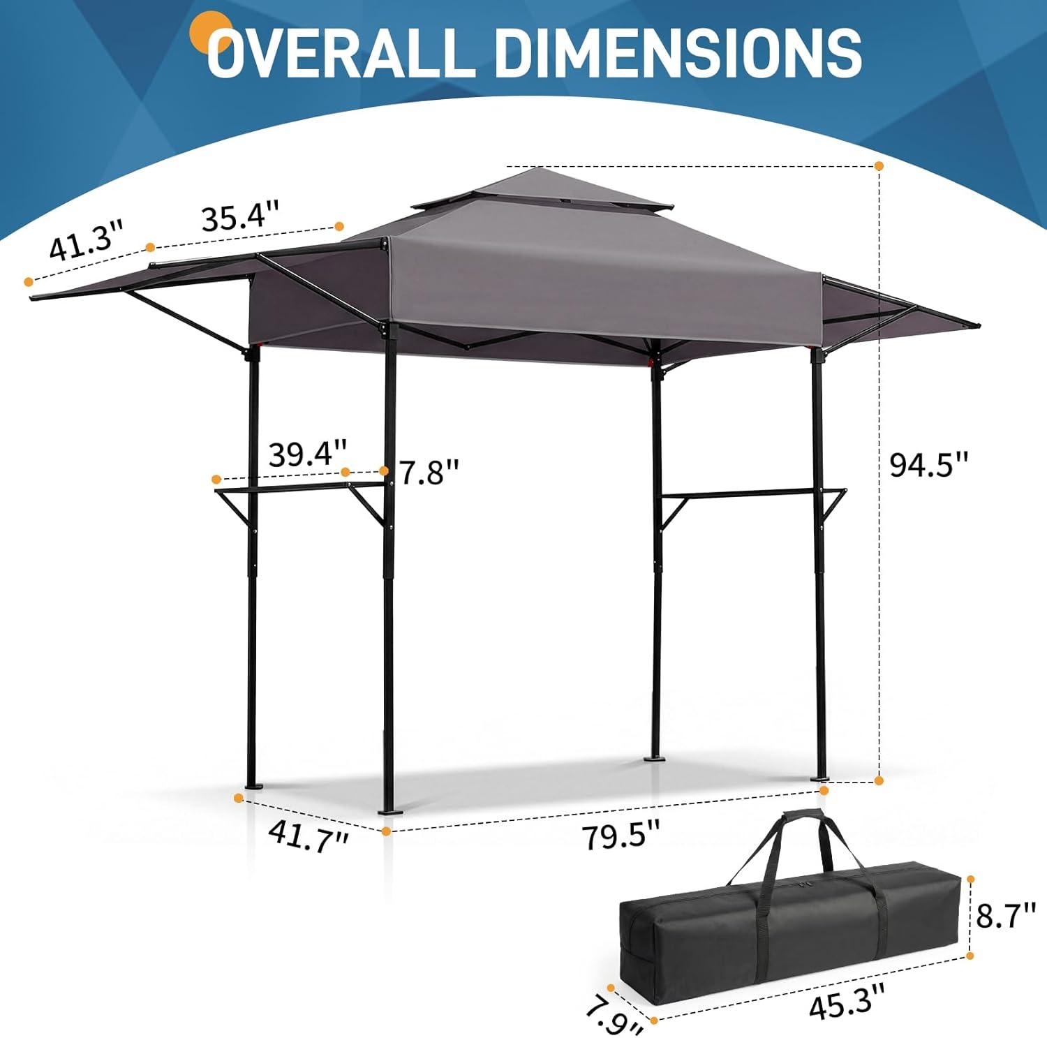 Outvita Grill Canopy for Outdoor BBQ, 80 * 40in Portable Canopy Tent with BBQ Shelf, Carry Bag and Ventilation Opening for Patio Garden Events Picnic Grilling(Grey-with side awning)