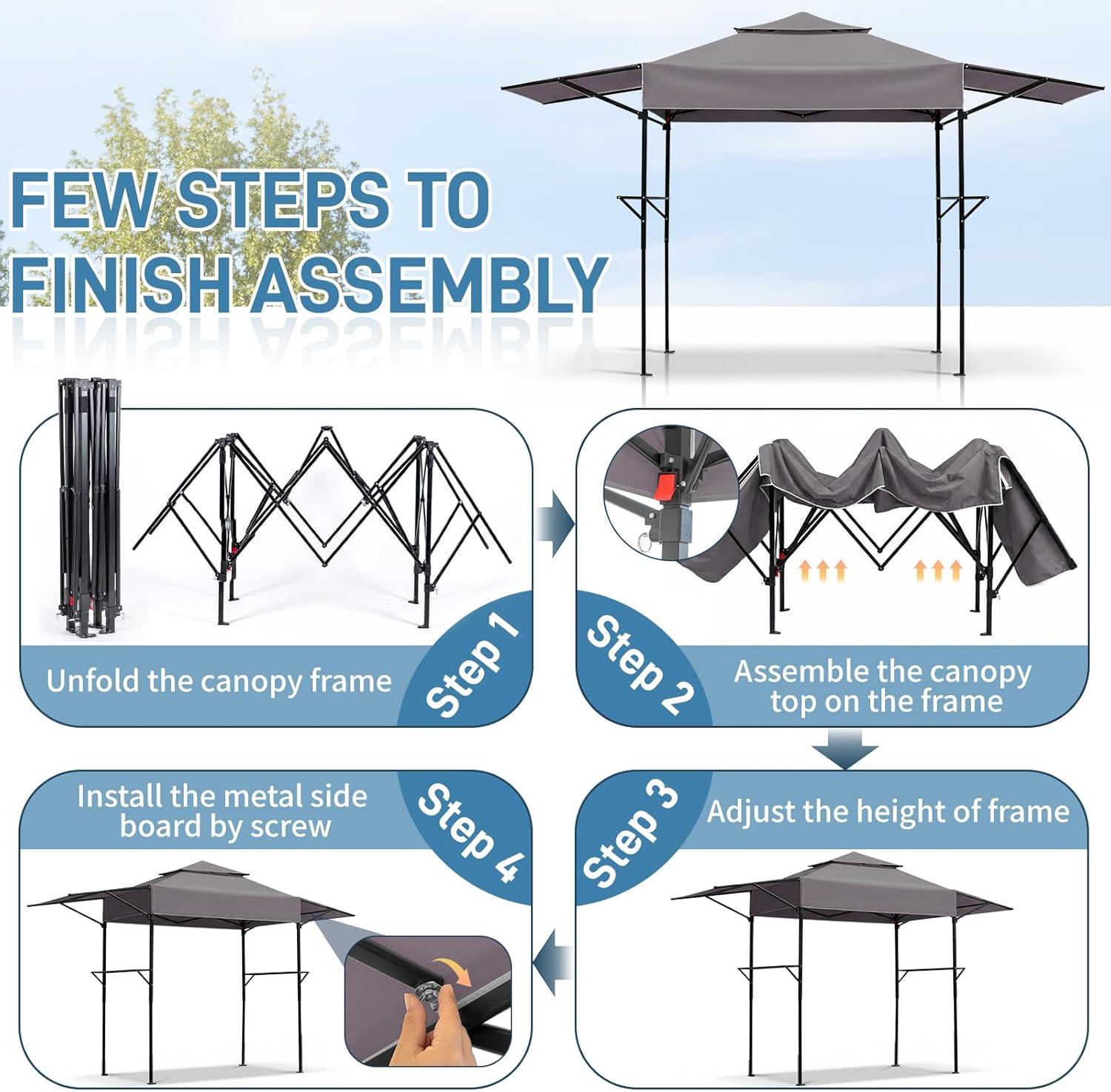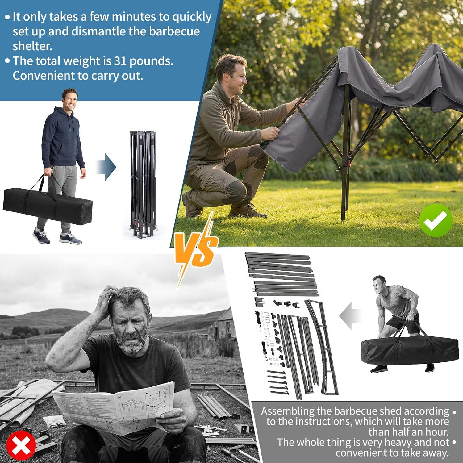 Effortless 5-Minute Setup: Say goodbye to complicated assembly! This pop-up gazebo for your outdoor grill unfolds and sets up in just 5 minutes. Spend less time building and more time enjoying your backyard barbecue under your very own grill gazebo canopy.