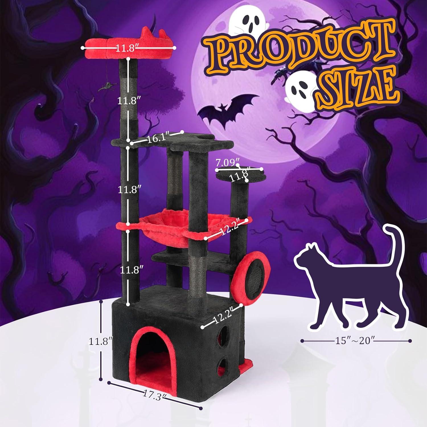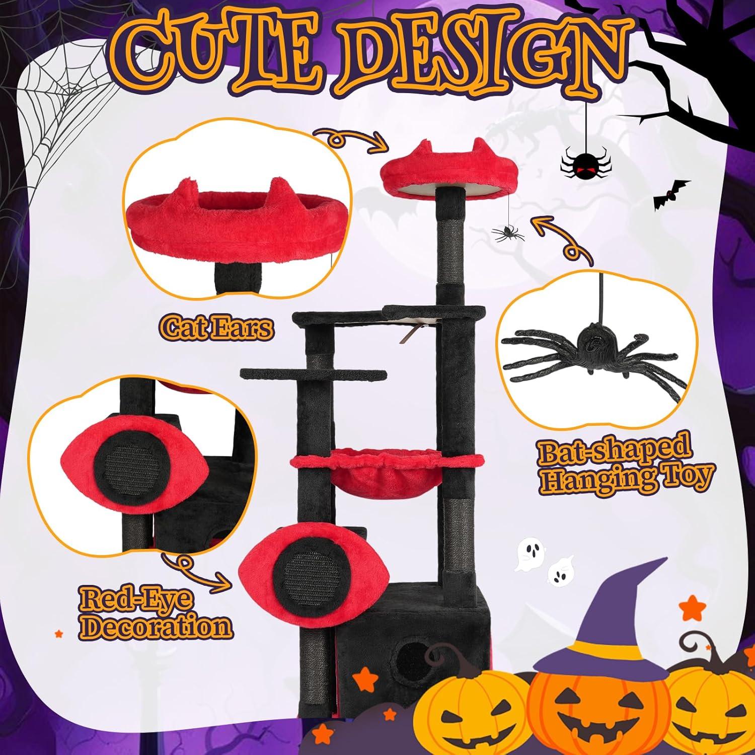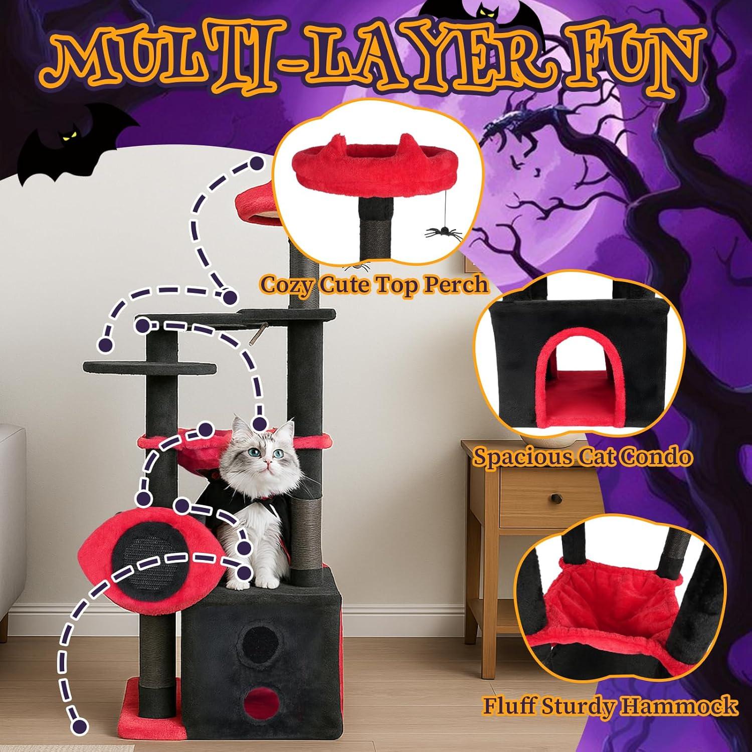 Outvita Halloween Cat Tree, 44″ Cat Tower with Spacious Cat Condo, Gothic Scratching Posts with 1 Padded Perches, Large Platform, Cat Activities Furniture, Red & Black(57″)