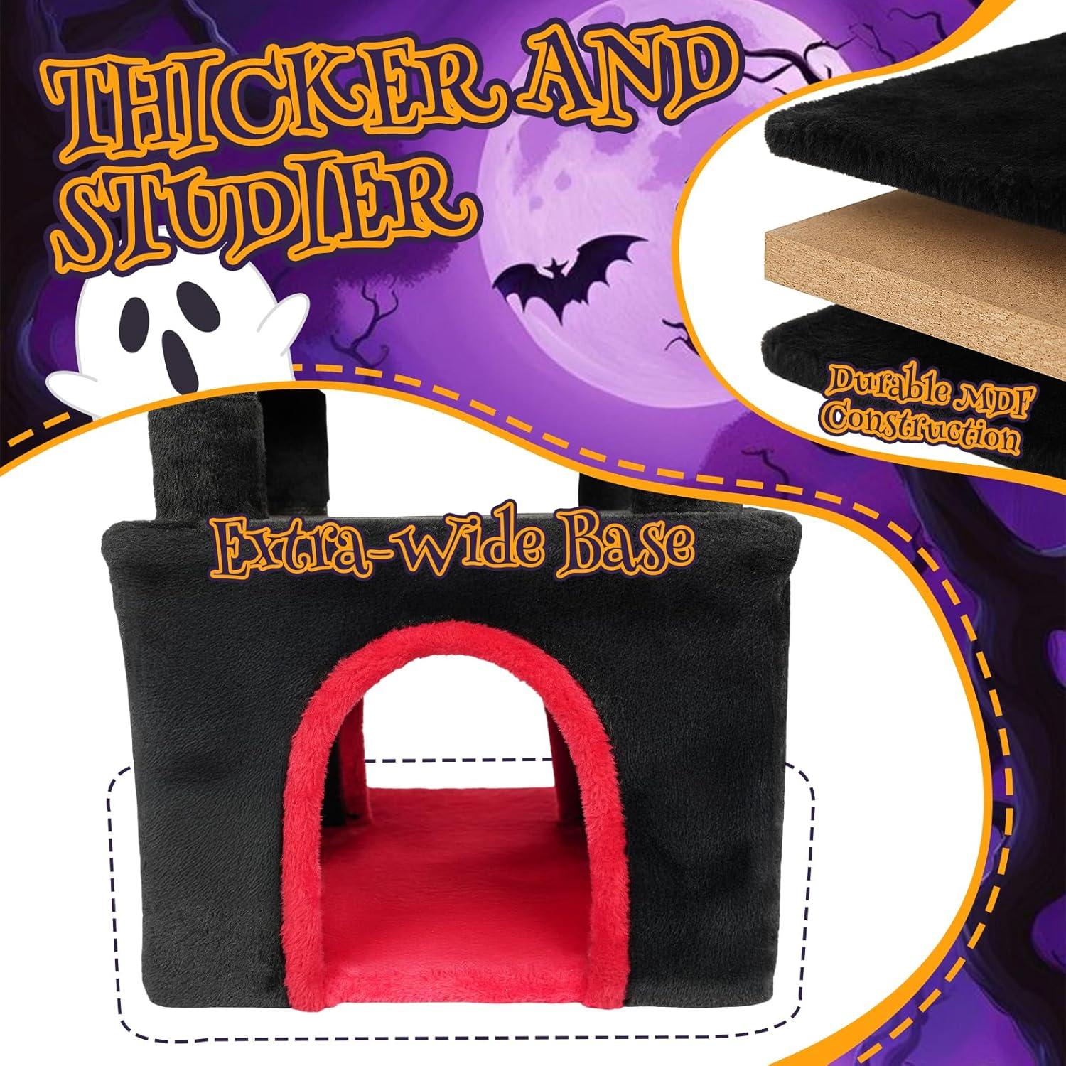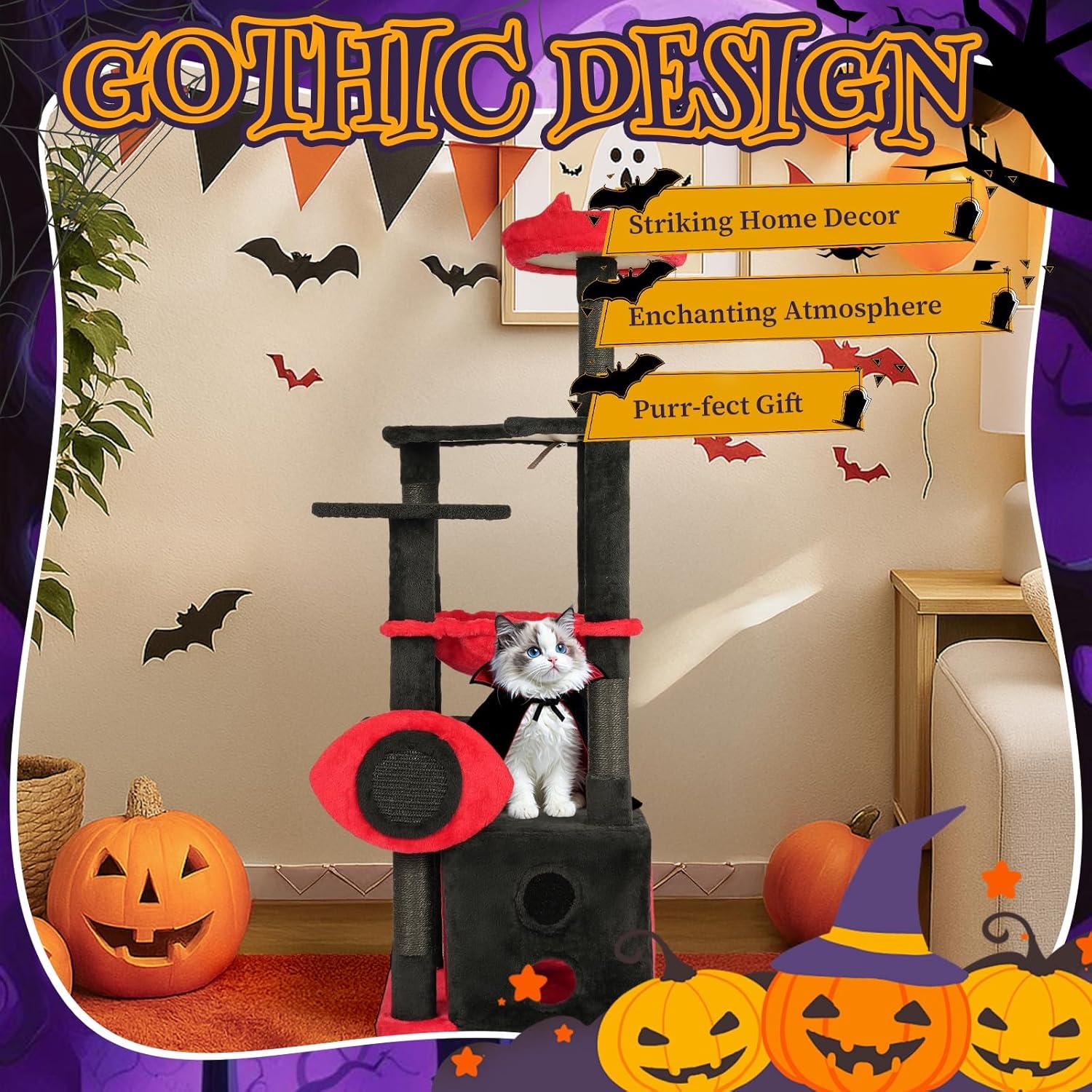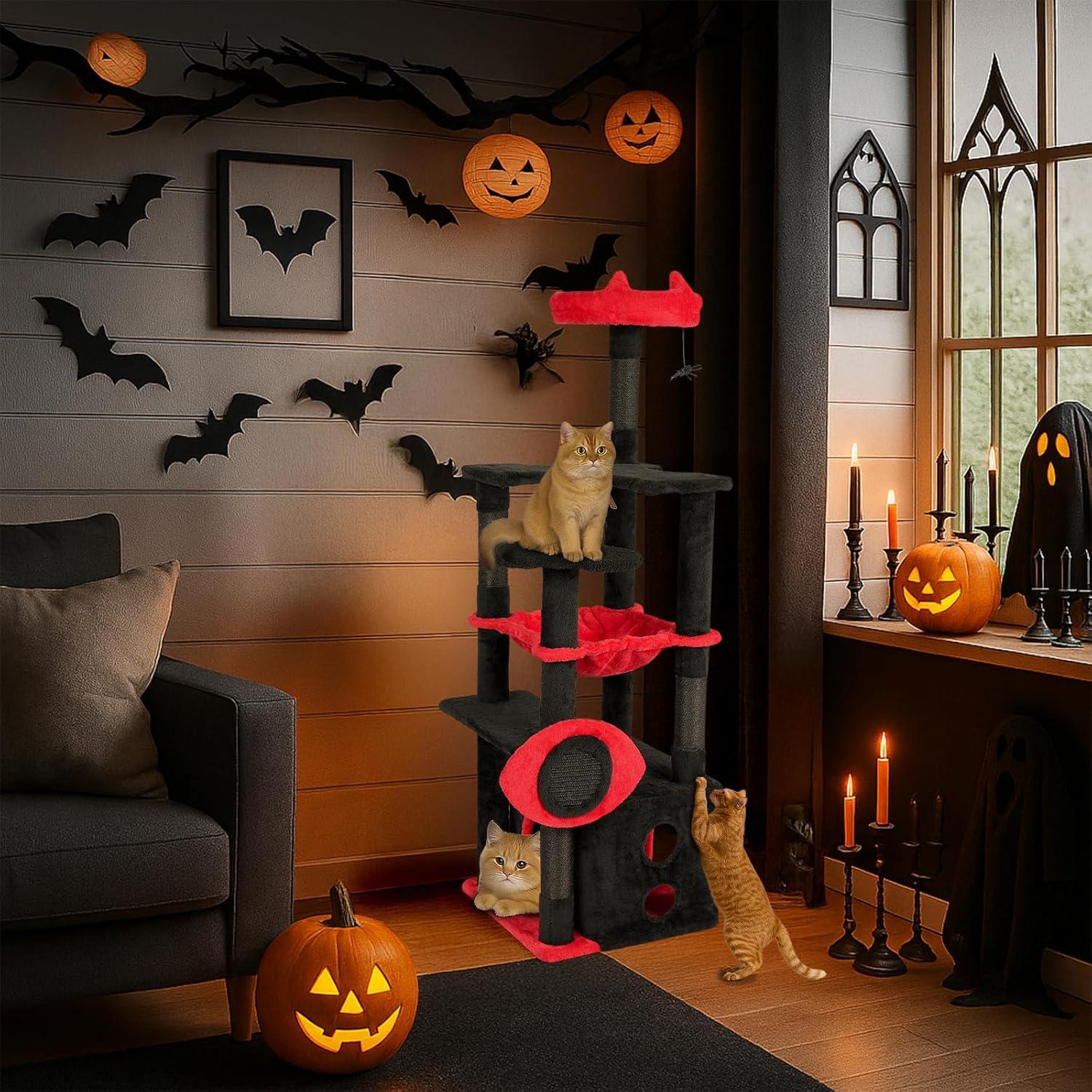 Outvita Halloween Cat Tree, 44″ Cat Tower with Spacious Cat Condo, Gothic Scratching Posts with 1 Padded Perches, Large Platform, Cat Activities Furniture, Red & Black(57″)