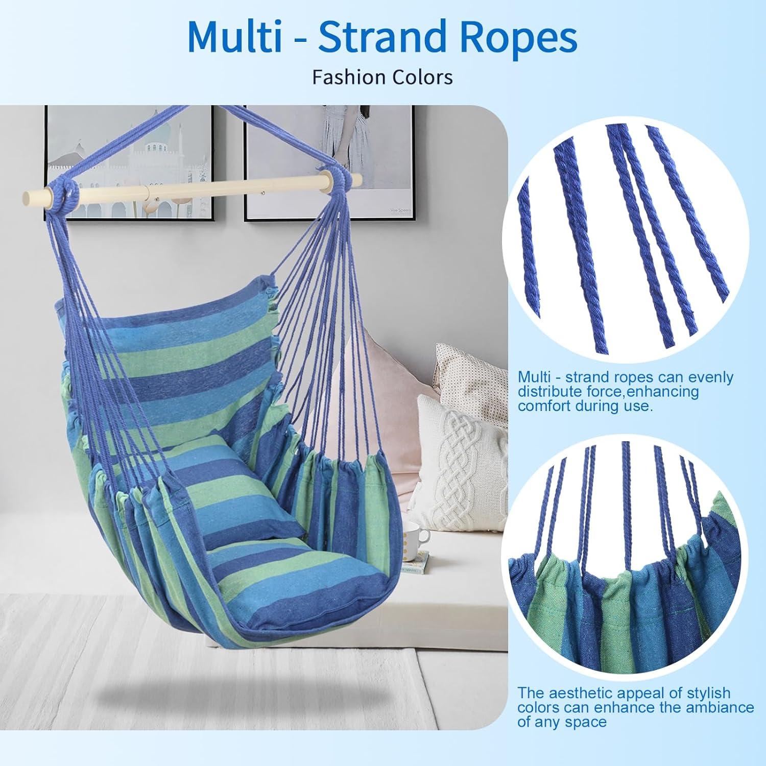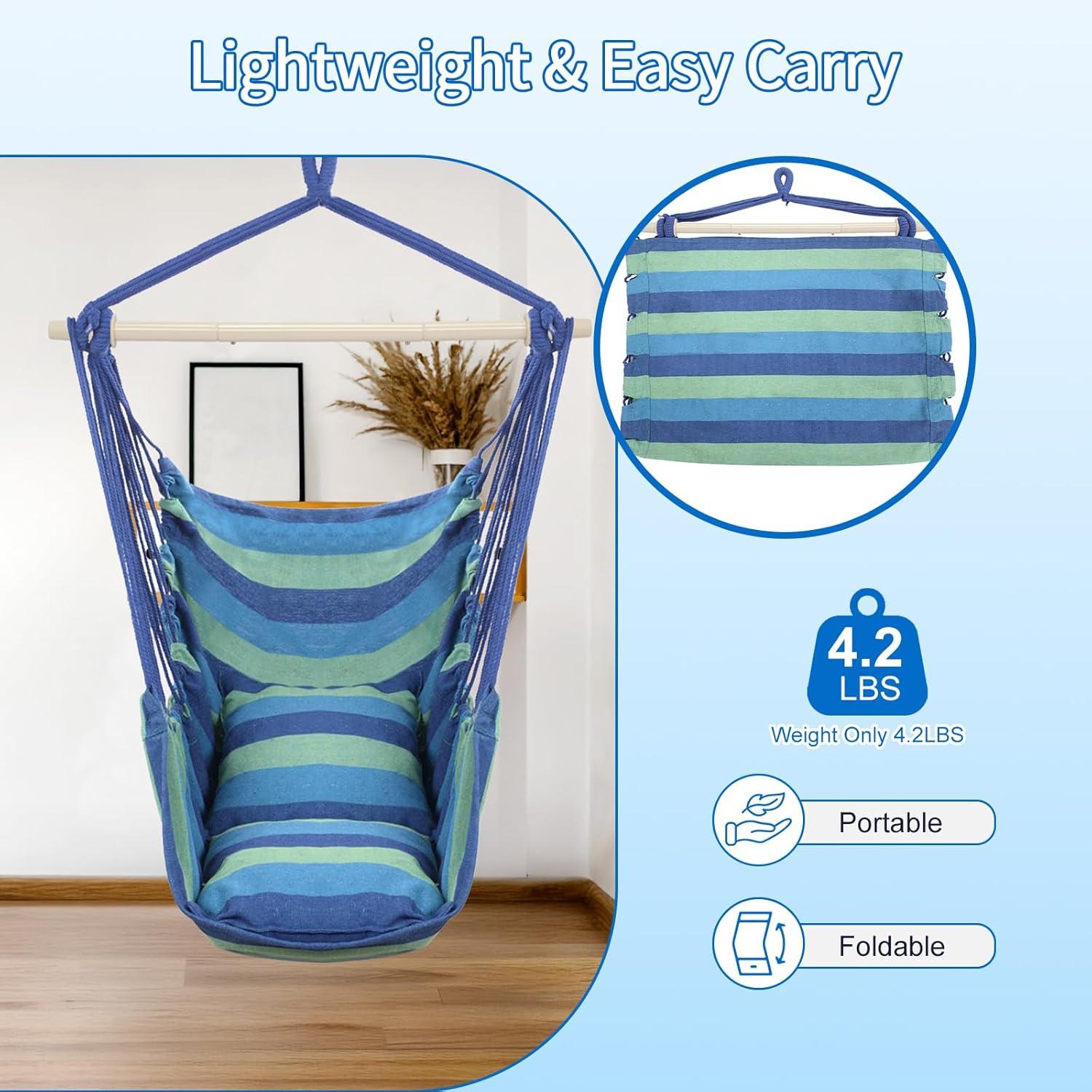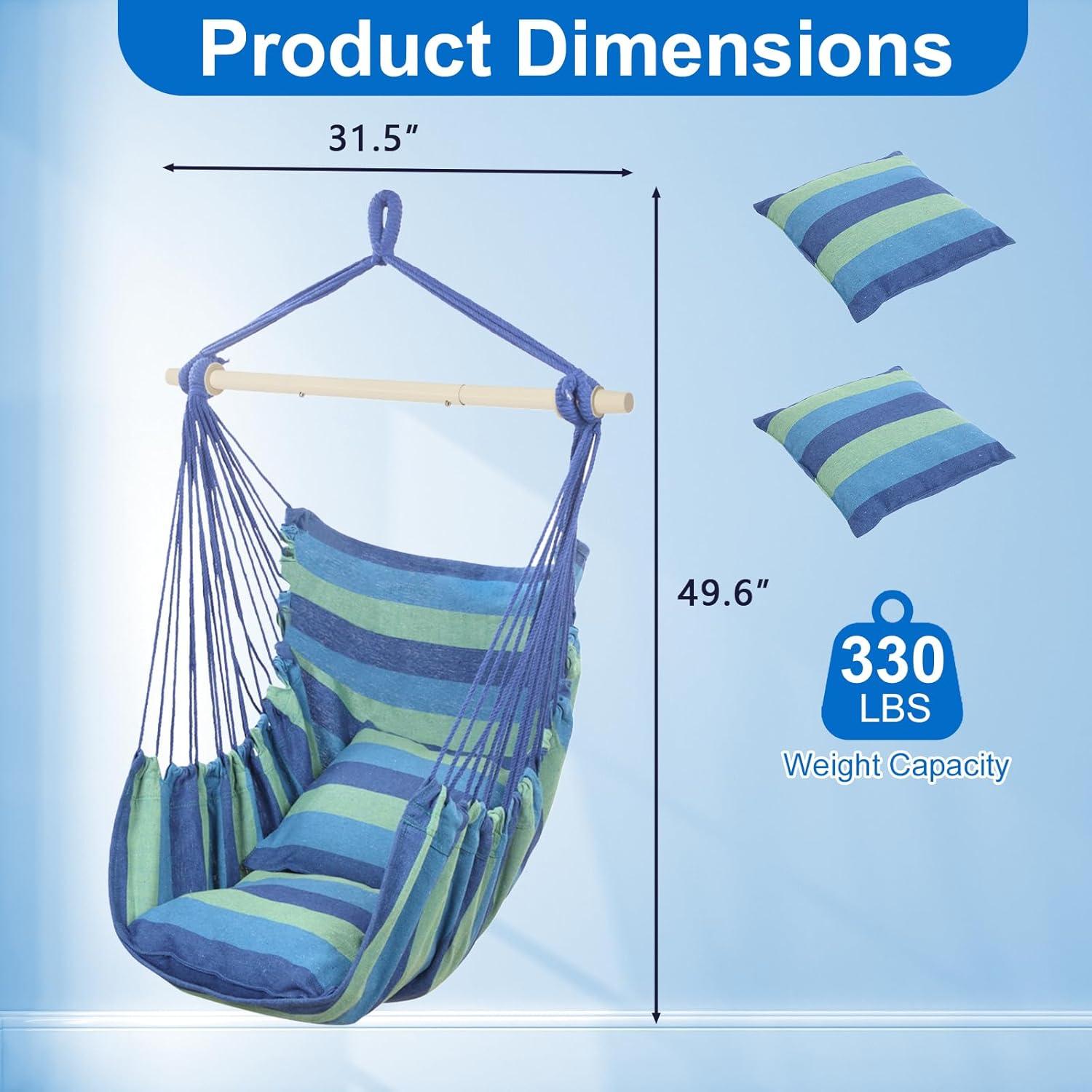 Outvita Hammock Chair Hanging Rope Swing, Galvanized Steel Pole with Non-Slip Ring, Includes 2 Fluffy Pillows, Maximum Weight Capacity 500 lbs for Indoor, Patio, Backyard Hanging, Mix Color Stripe(Blue Stripe)