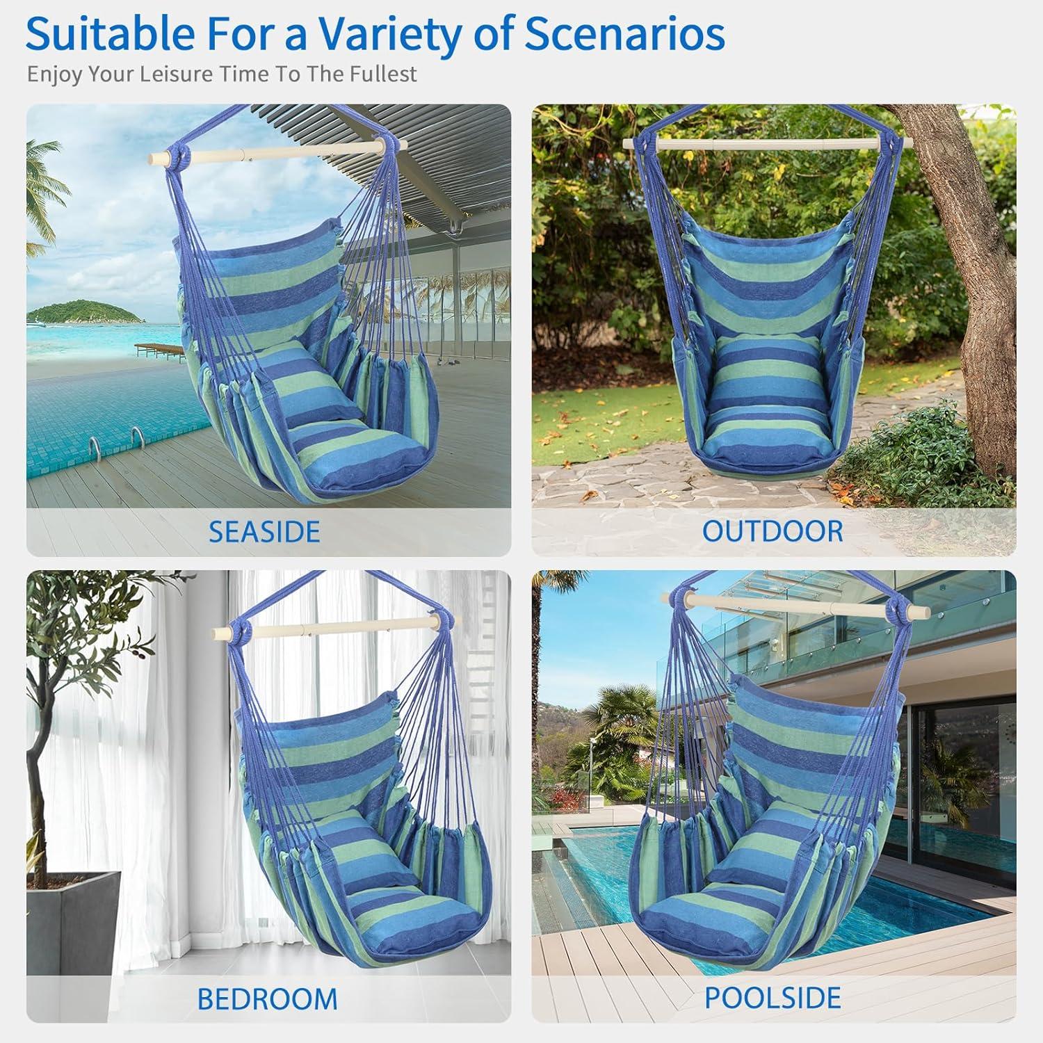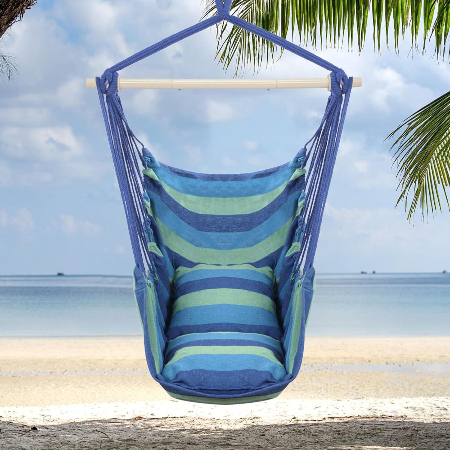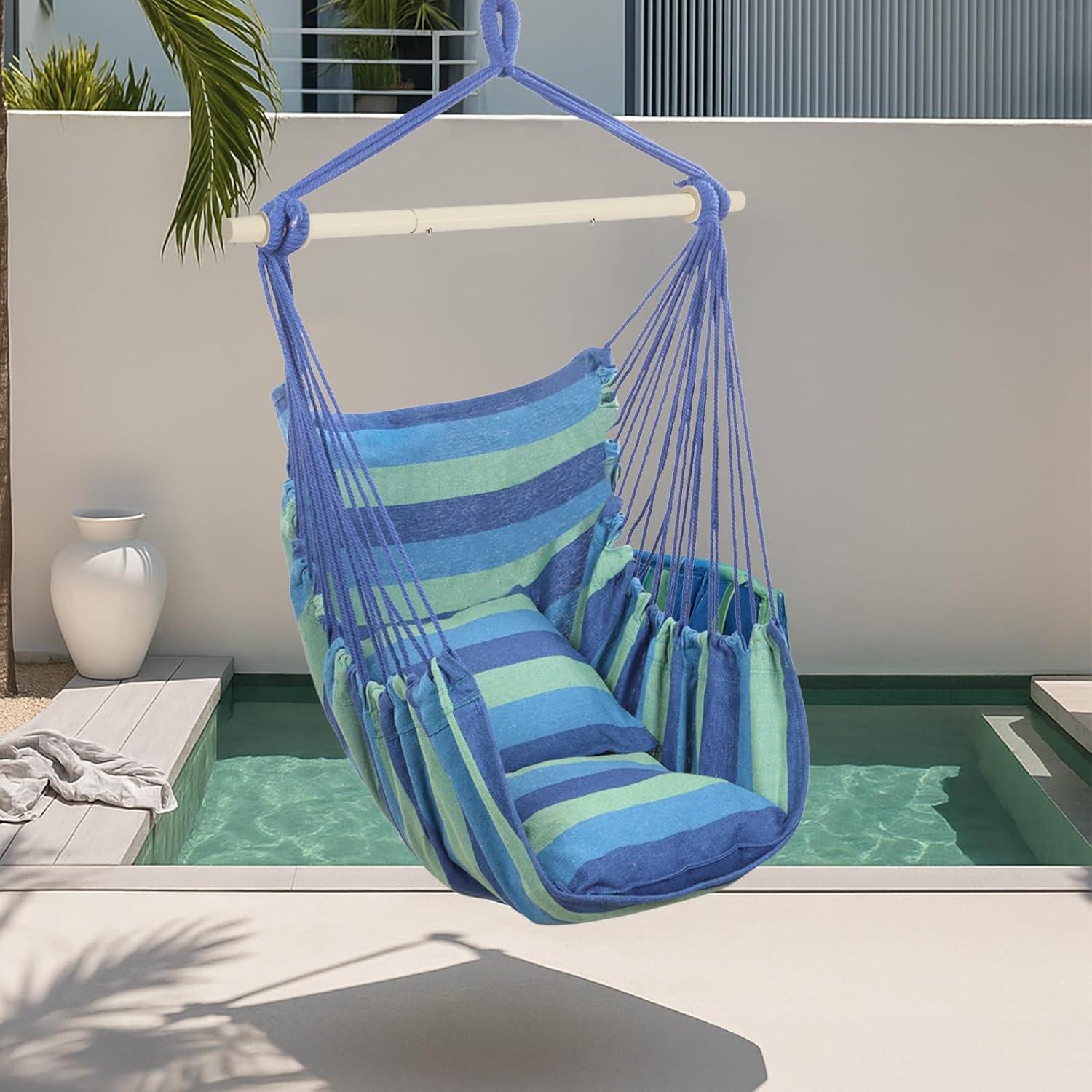 Outvita Hammock Chair Hanging Rope Swing, Galvanized Steel Pole with Non-Slip Ring, Includes 2 Fluffy Pillows, Maximum Weight Capacity 500 lbs for Indoor, Patio, Backyard Hanging, Mix Color Stripe(Blue Stripe)
