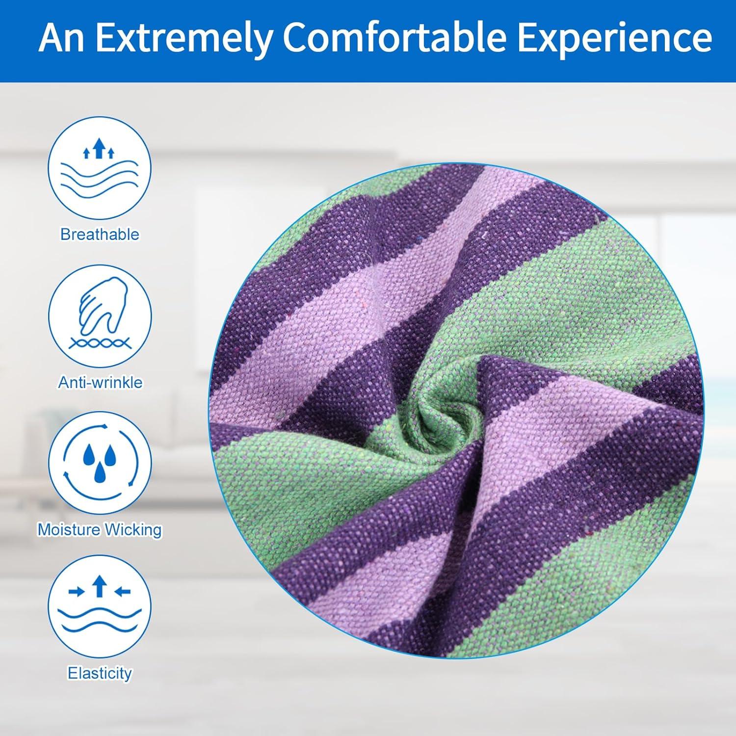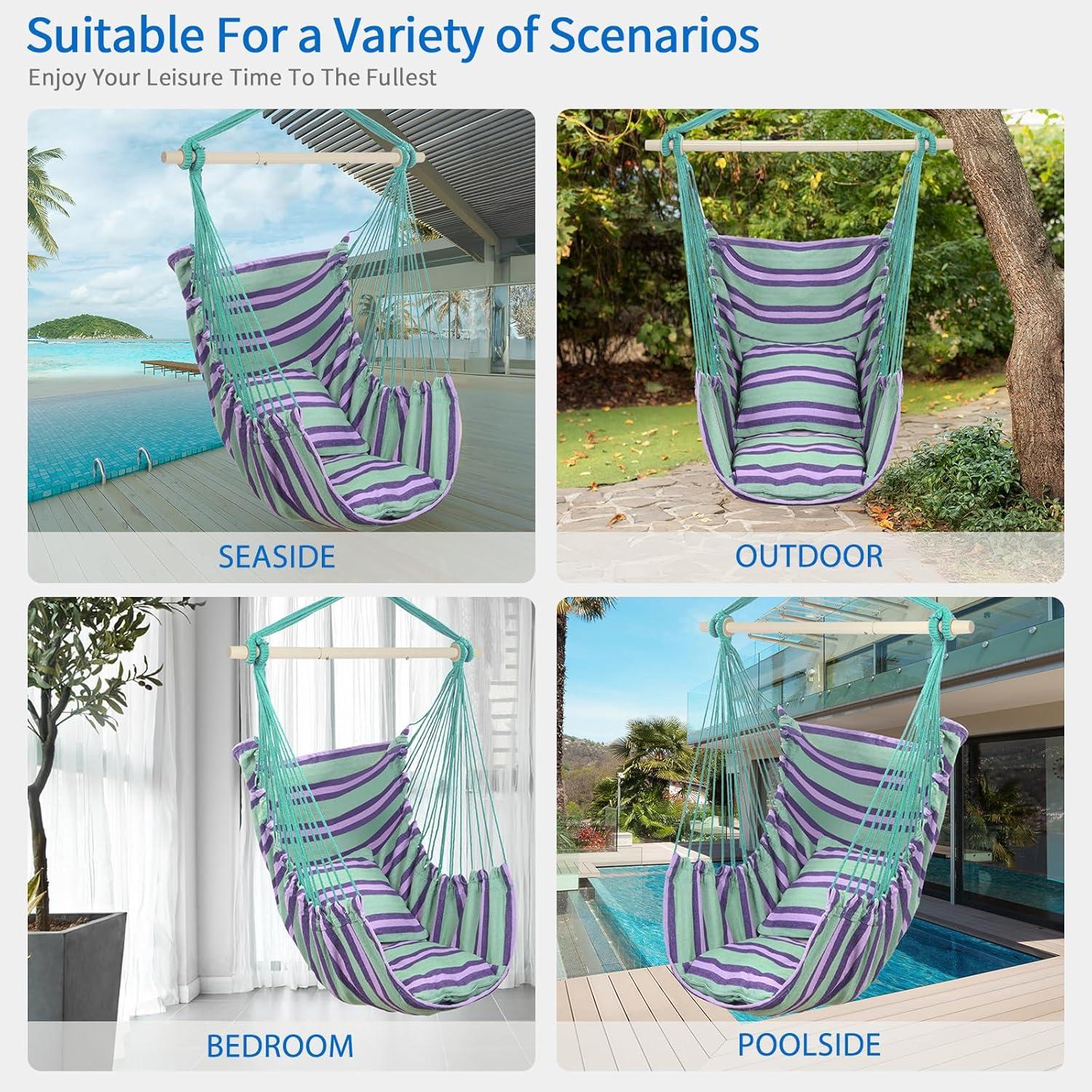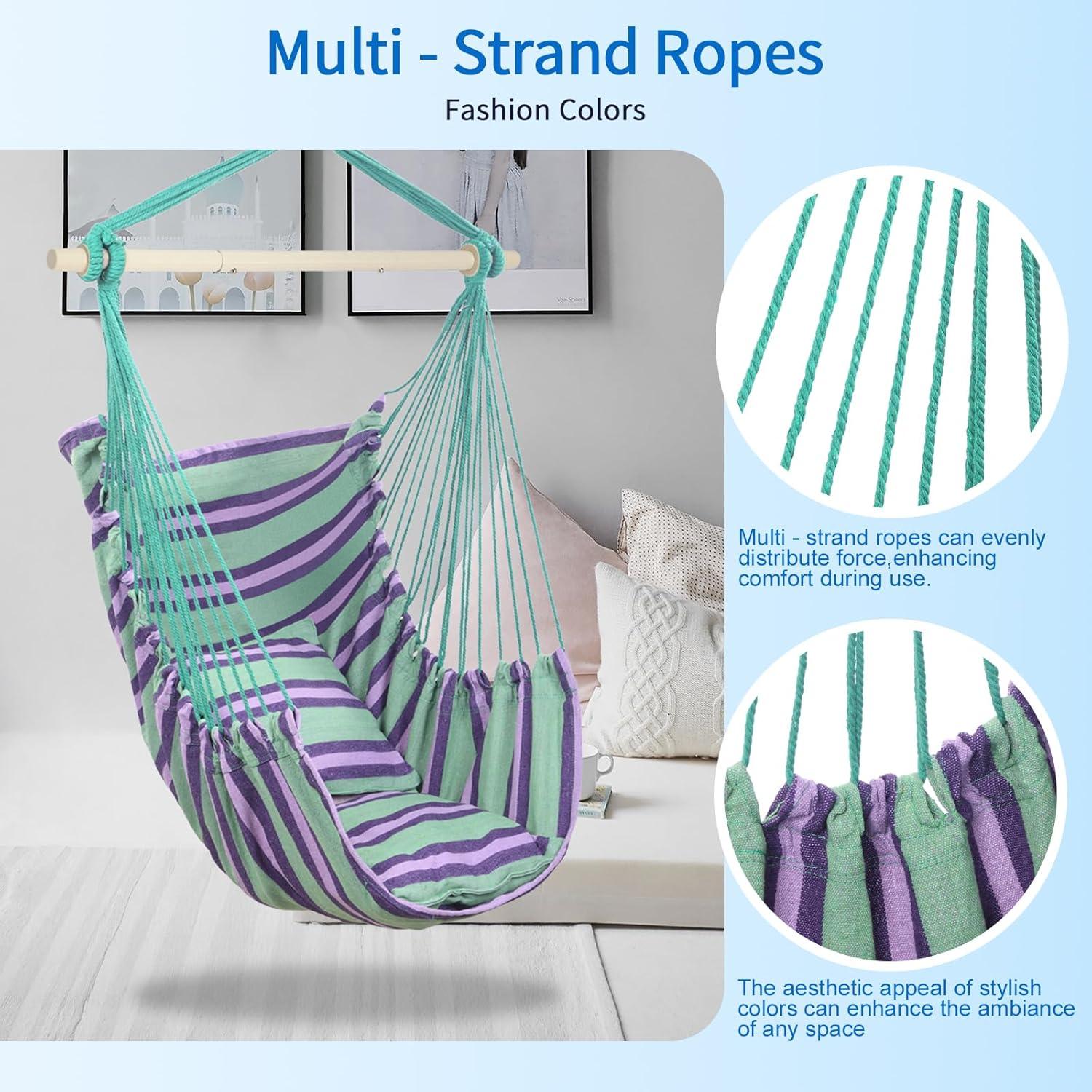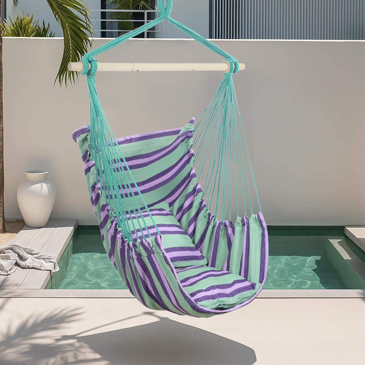 Outvita Hammock Chair Hanging Rope Swing, Galvanized Steel Pole with Non-Slip Ring, Includes 2 Fluffy Pillows, Maximum Weight Capacity 500 lbs for Indoor, Patio, Backyard Hanging, Mix Color Stripe(Green and Purple Stripes)