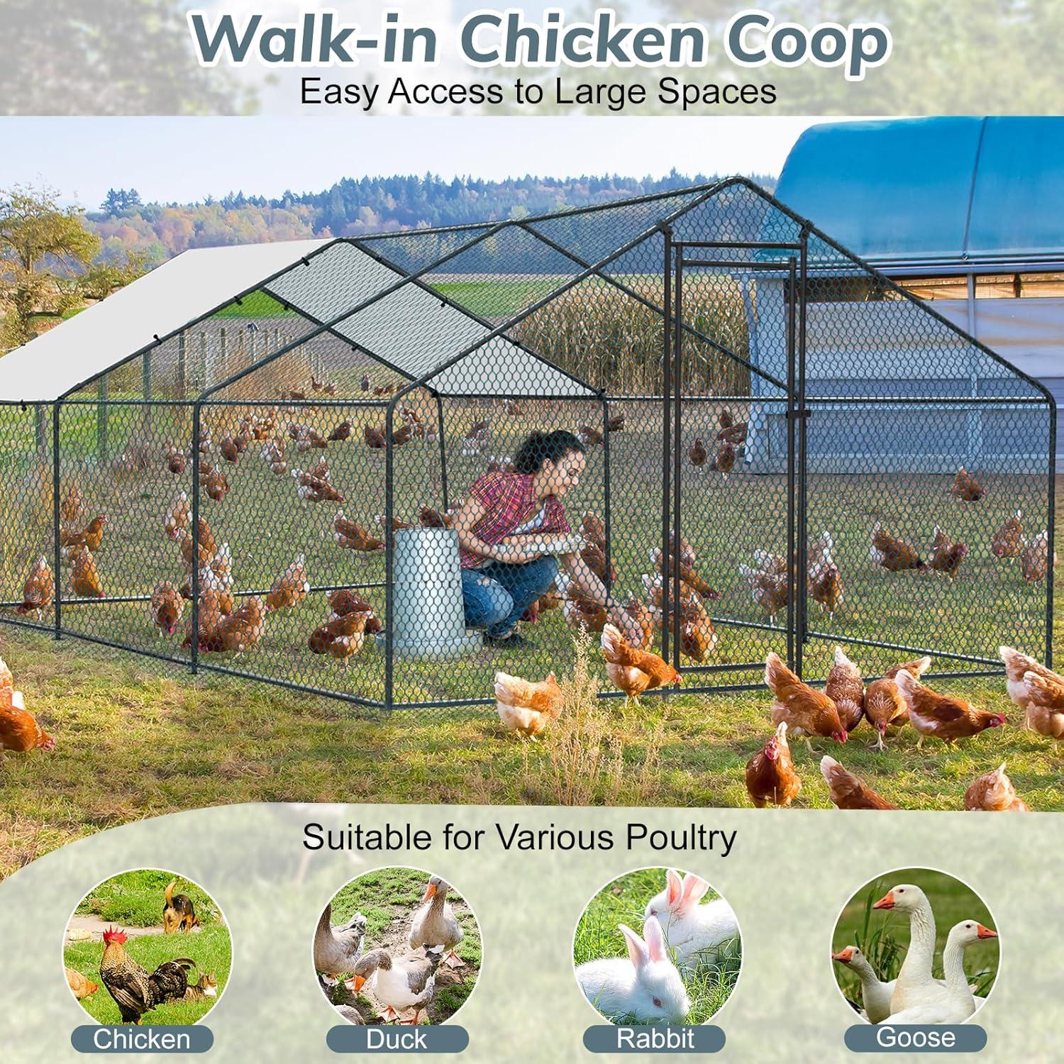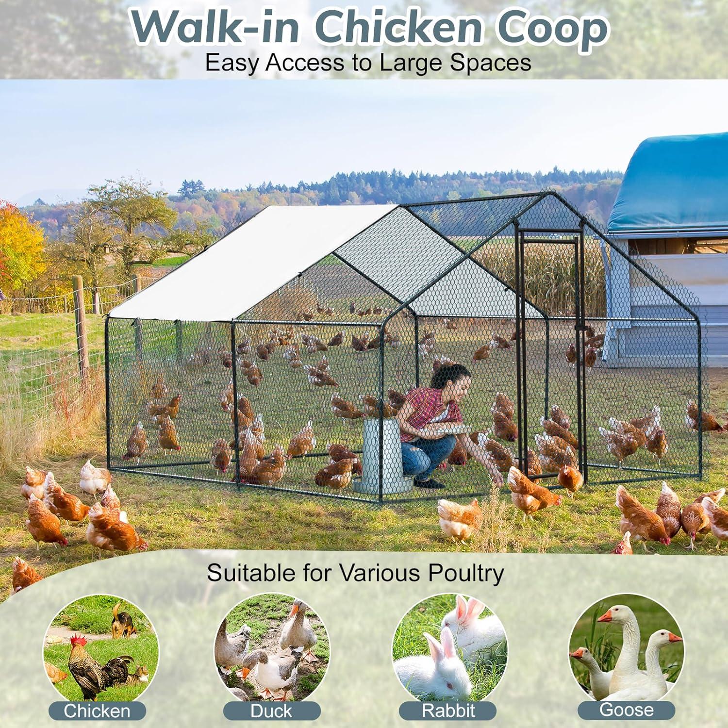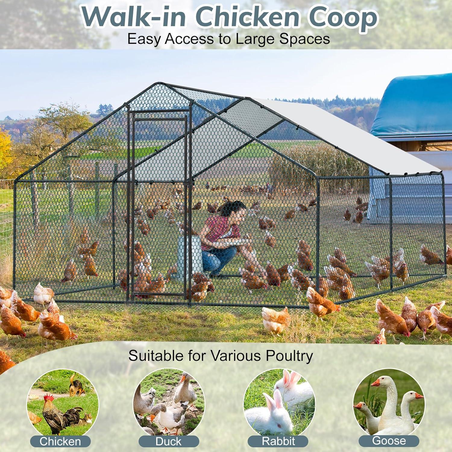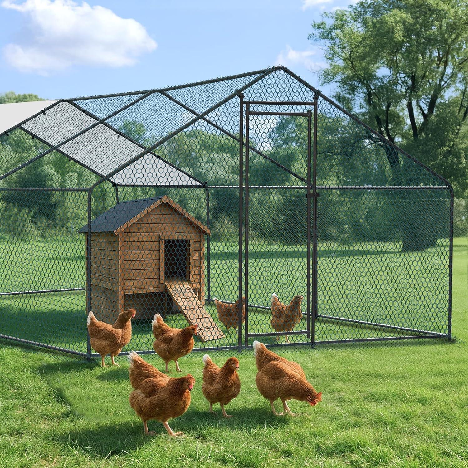 【Large Walk-in Metal Chicken Coop】: This hexagonal metal chicken coop, a spacious chicken house with run, measures 13×11.4×8.6 ft. The 5.4 ft high door eases cleaning and feeding, making this large chicken coop a practical choice among chicken coops for backyards.