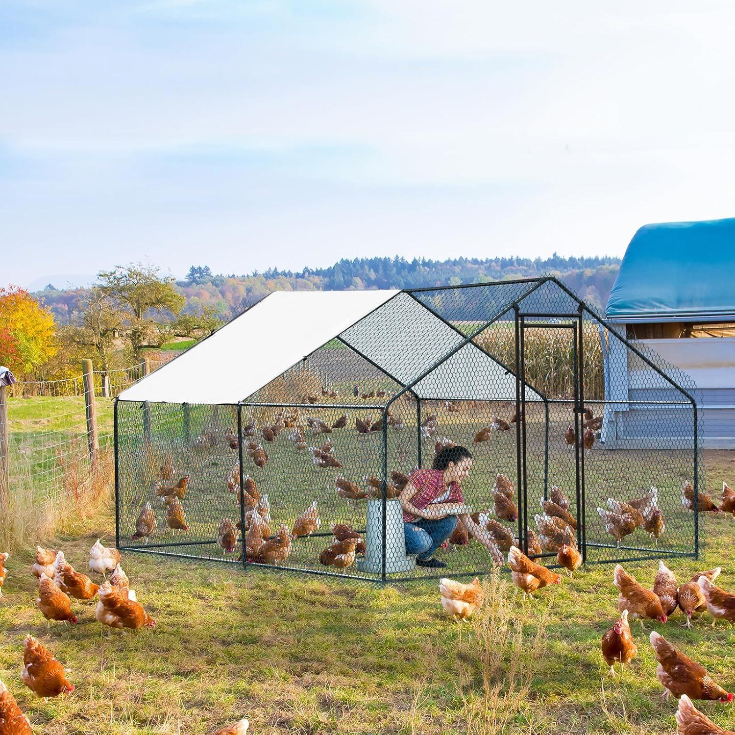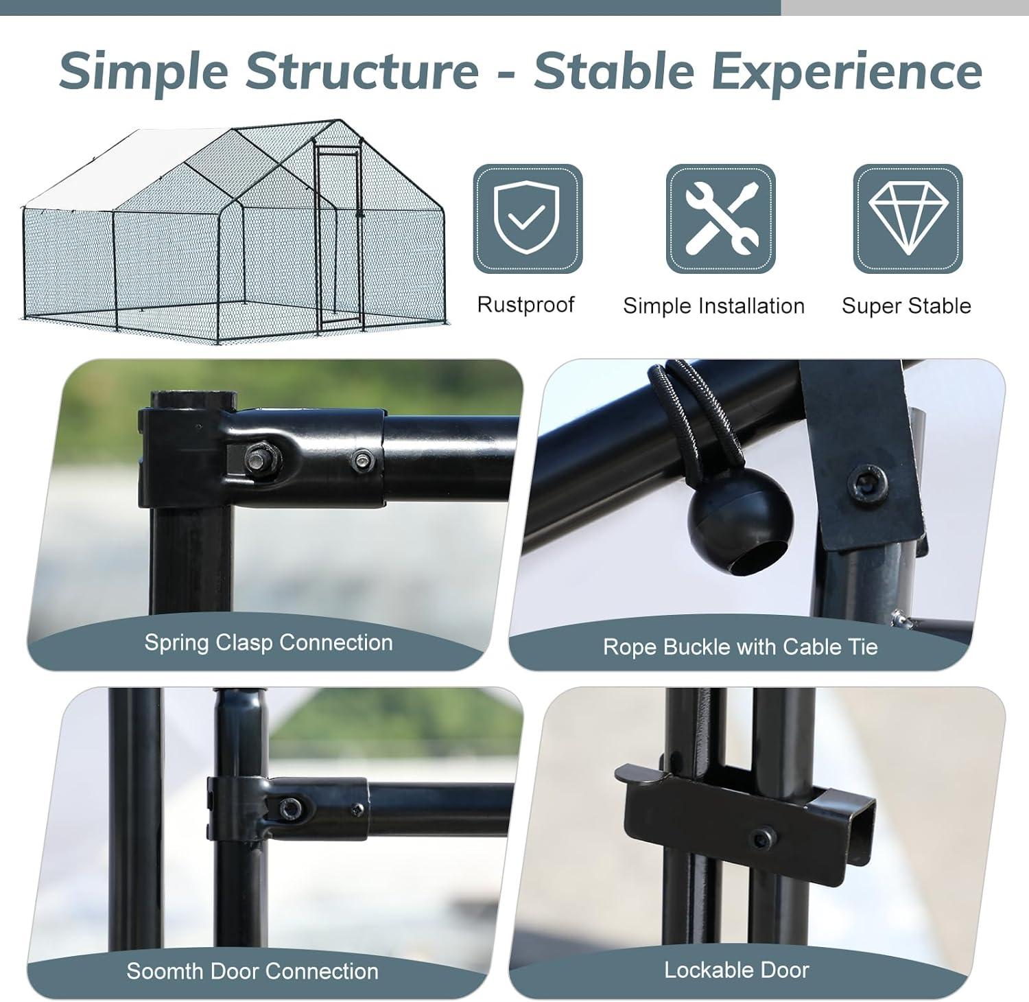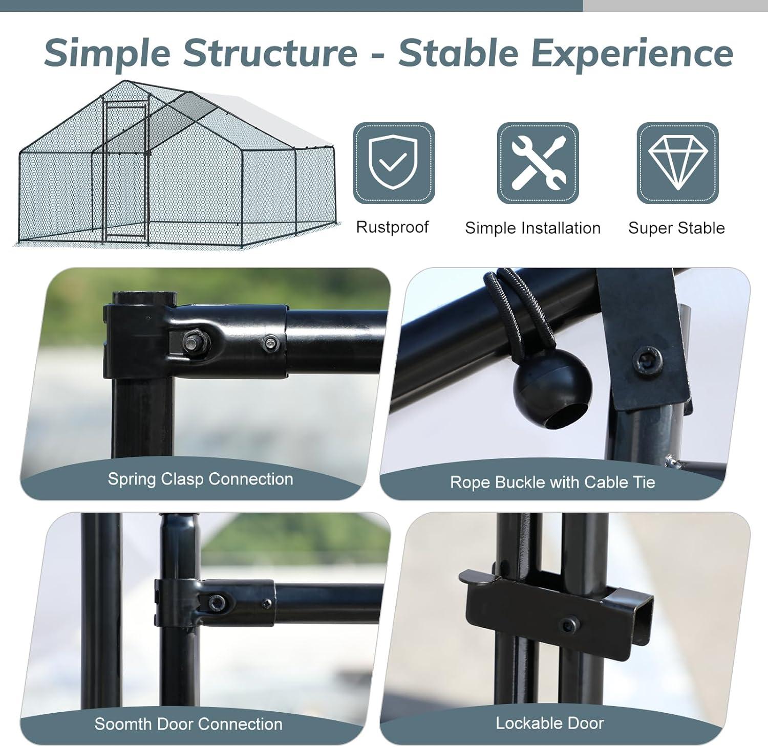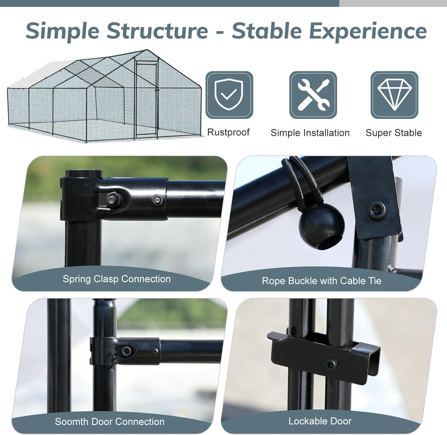 【Sturdy & Stable Metal Chicken Pen Construction】: Made of durable galvanized metal, this metal chicken coop resists rust, peeling and chipping. With solid bases and 6 top beams, the coop ensures great stability even in winds, standing out as a sturdy chicken cage for outdoor use.