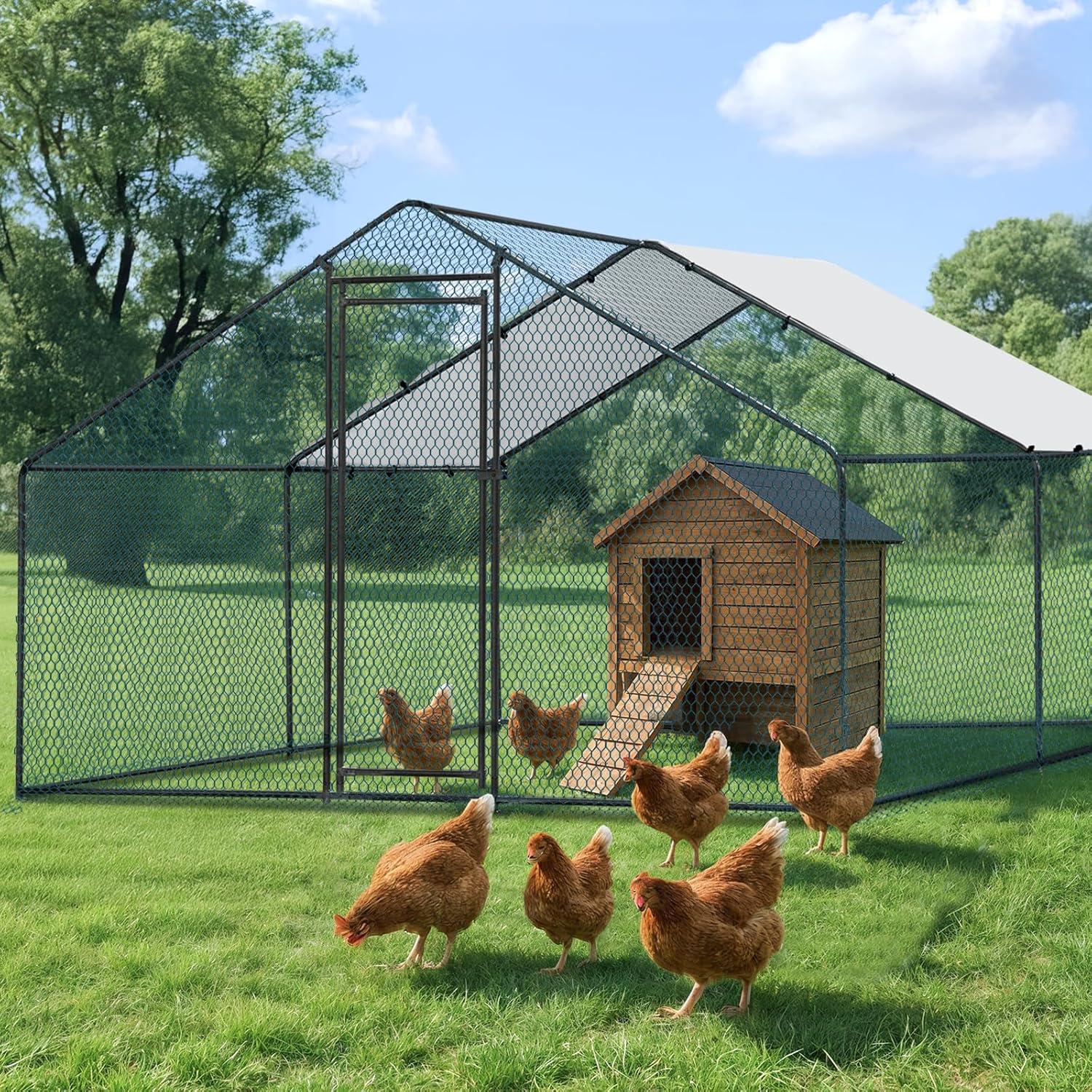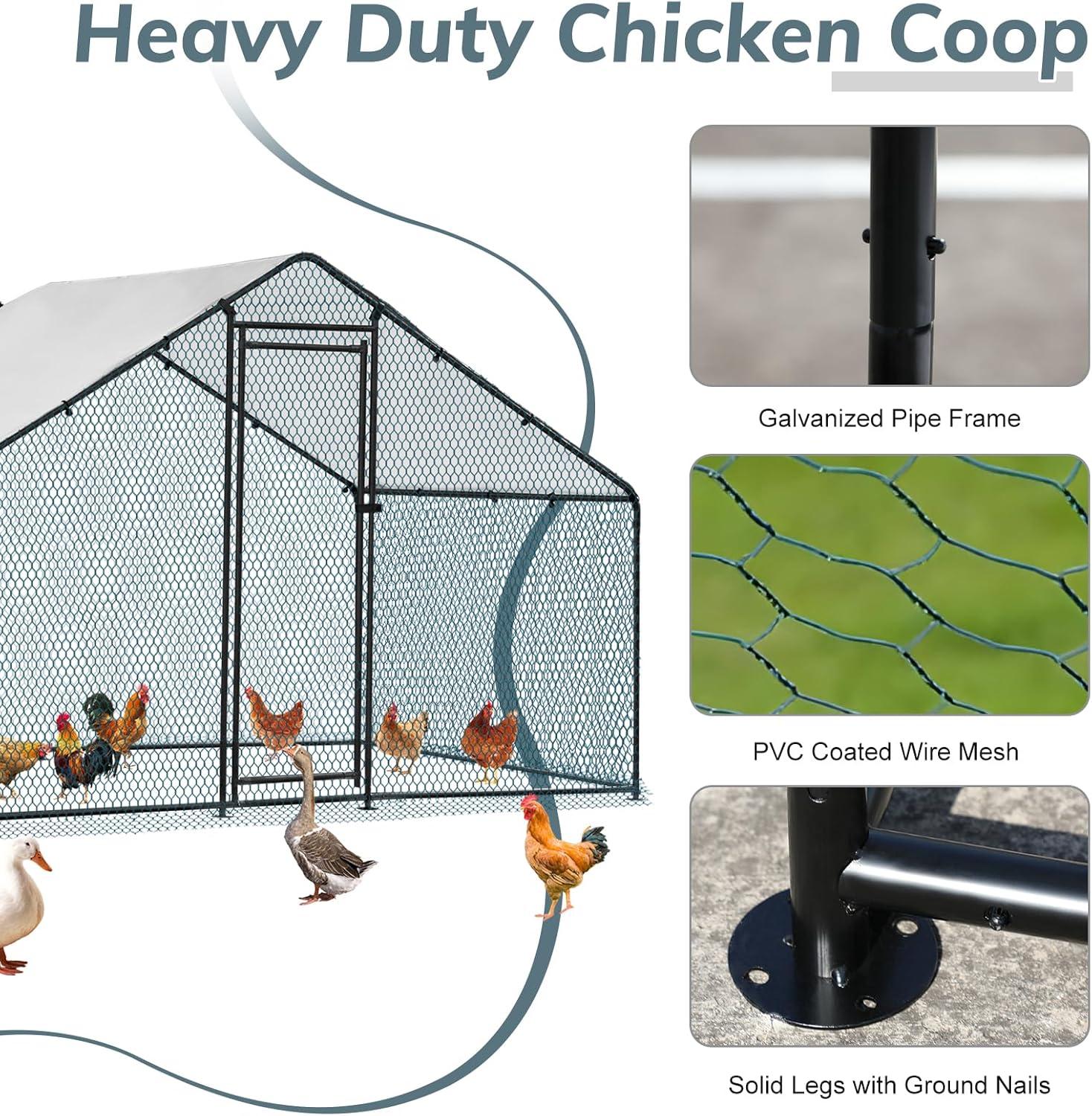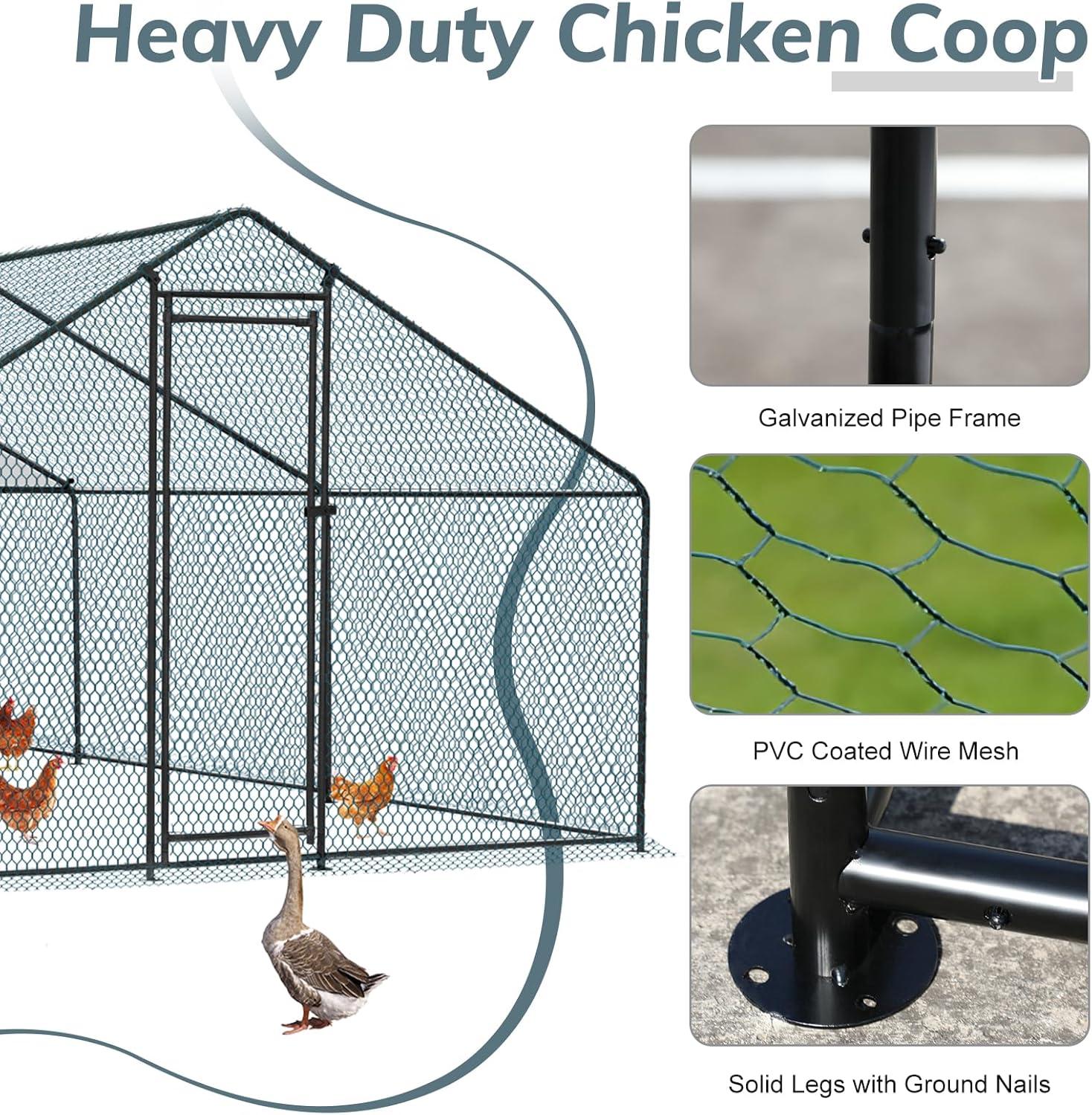 【Sturdy & Stable Metal Chicken Pen Construction】: Made of durable galvanized metal, this metal chicken coop resists rust, peeling and chipping. With solid bases and 6 top beams, the coop ensures great stability even in winds, standing out as a sturdy chicken cage for outdoor use.