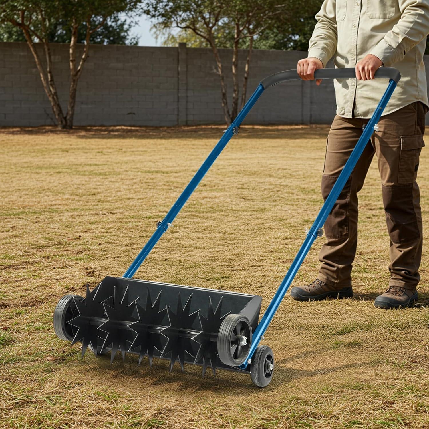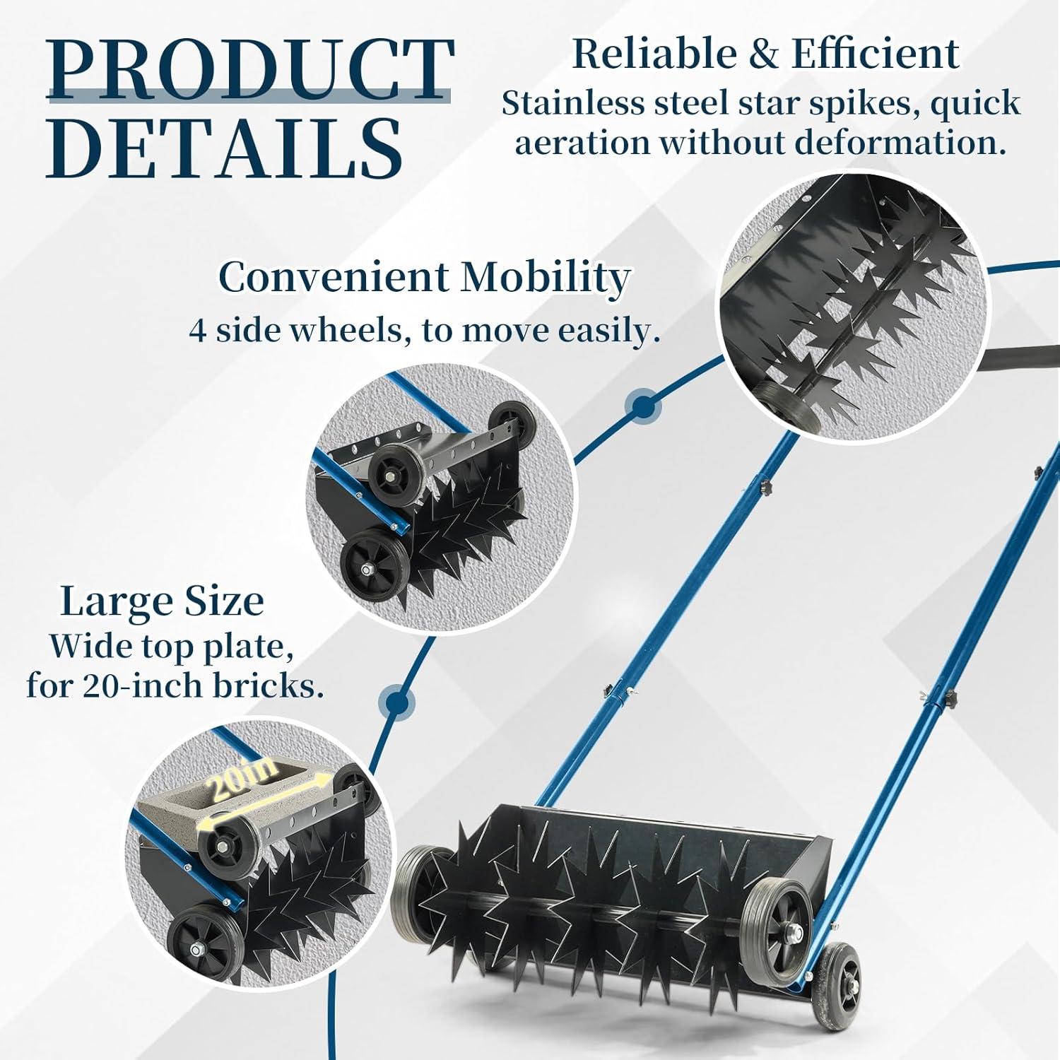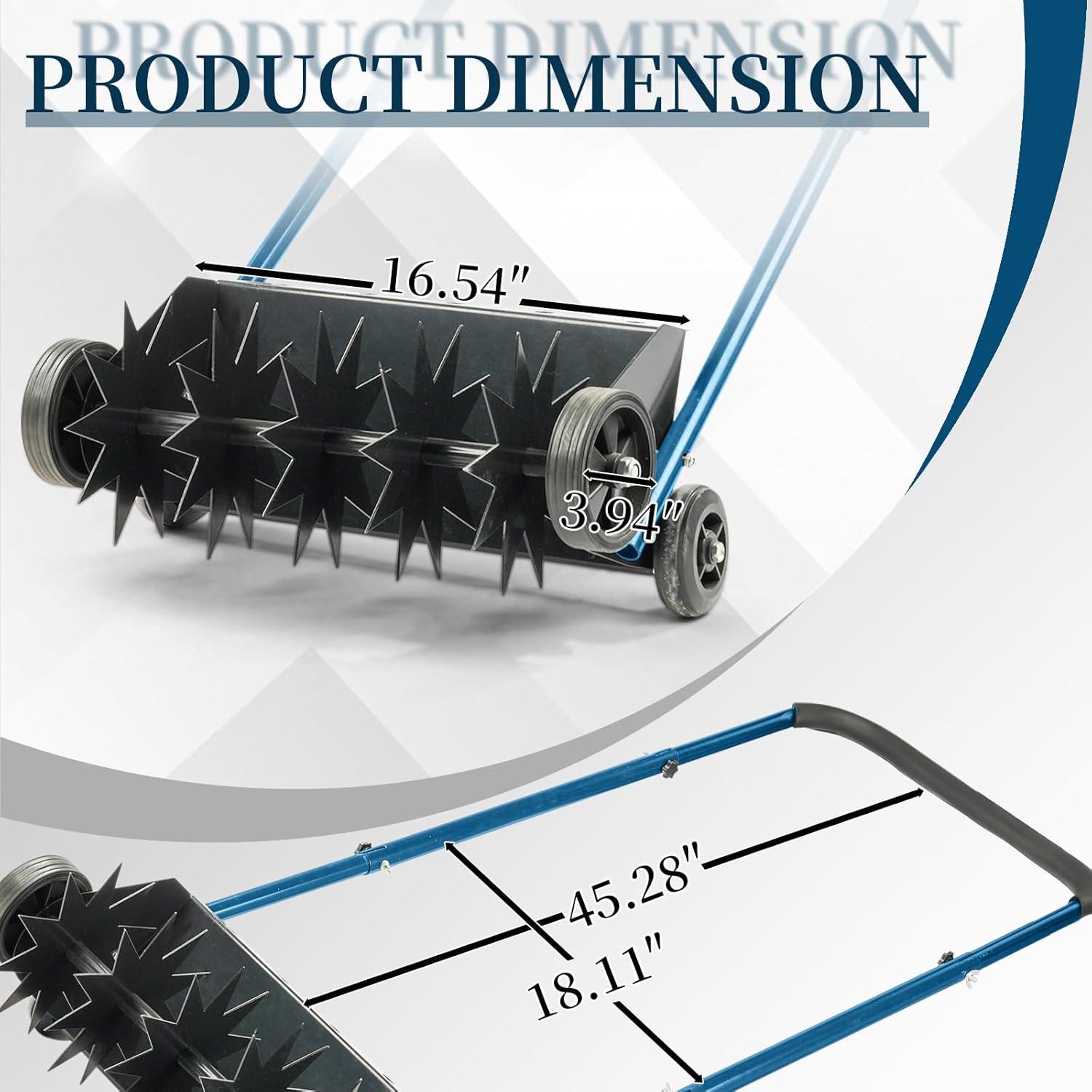 【Easy Assembly & Come with Cleaning Tool】 No complicated steps—assemble in just a few minutes, and the aerator lawn tool is also easy to disassemble for compact storage. The equipped cleaning stick effortlessly clears clogged soil or rocks in hollow tines, and doubles as a handy weeding tool for extra convenience