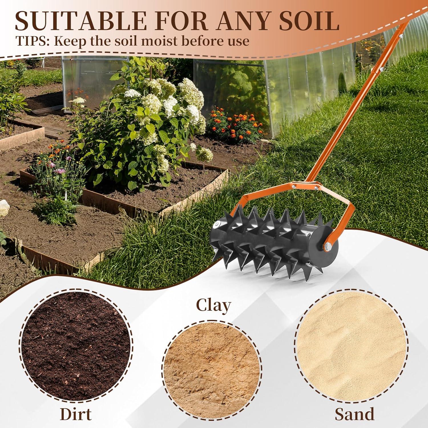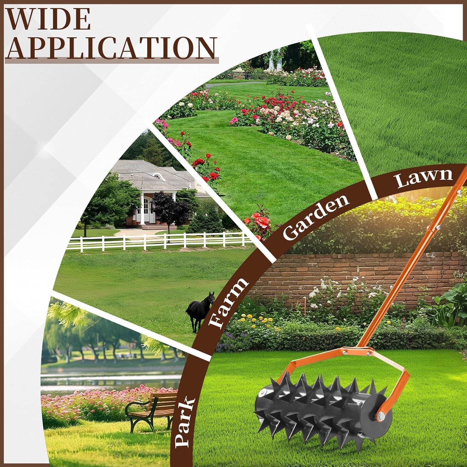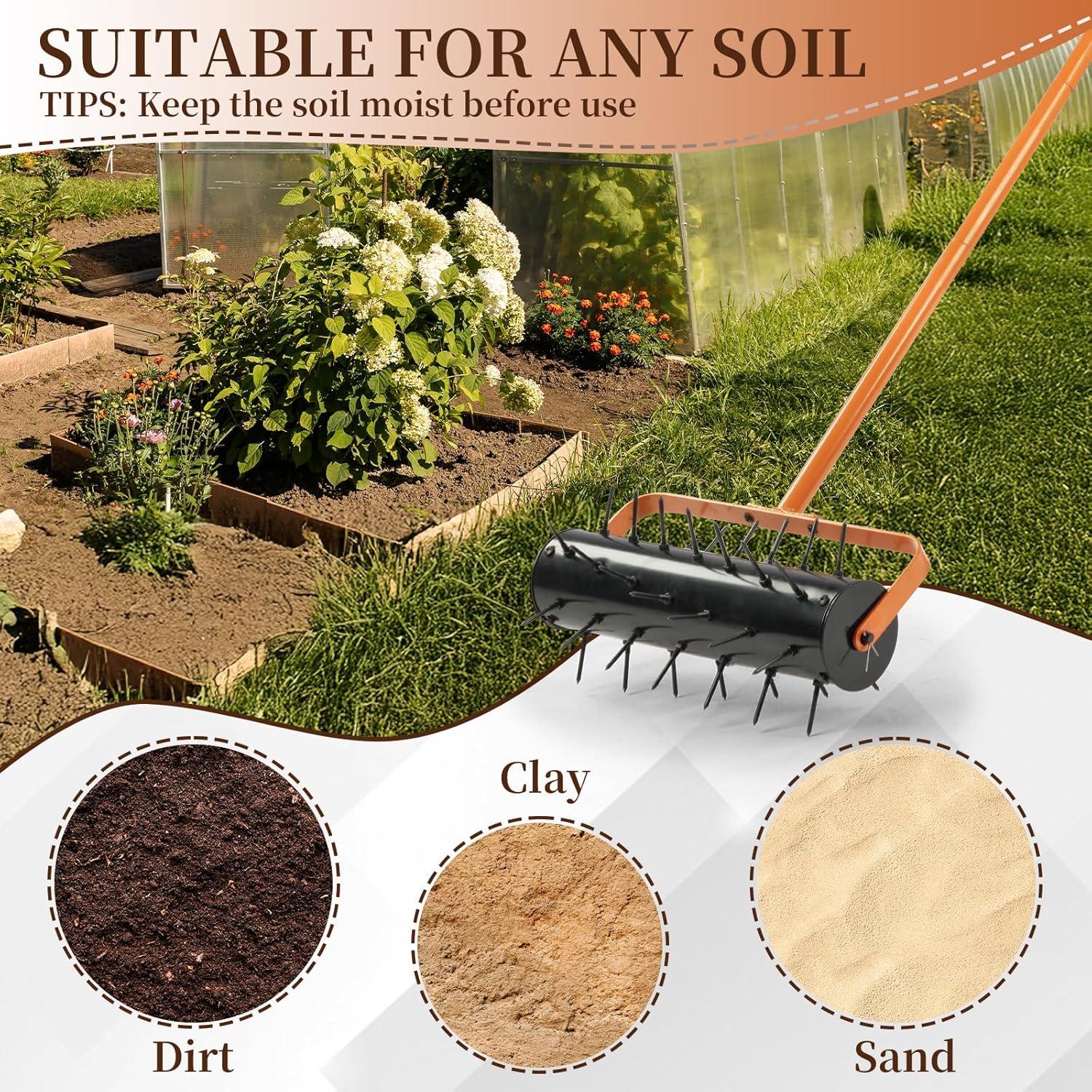 【Built-in Soil Collection Tray】Our manual lawn aerator features a sturdy built-in soil plug tray that collects all extracted soil plugs during aeration, preventing messy scattering across your lawn. No extra time and effort on post-cleanup—keep your lawn neat while aerating, and soil disposal becomes a breeze. The durable solid tray ensures long-lasting performance for years of tidy lawn maintenance