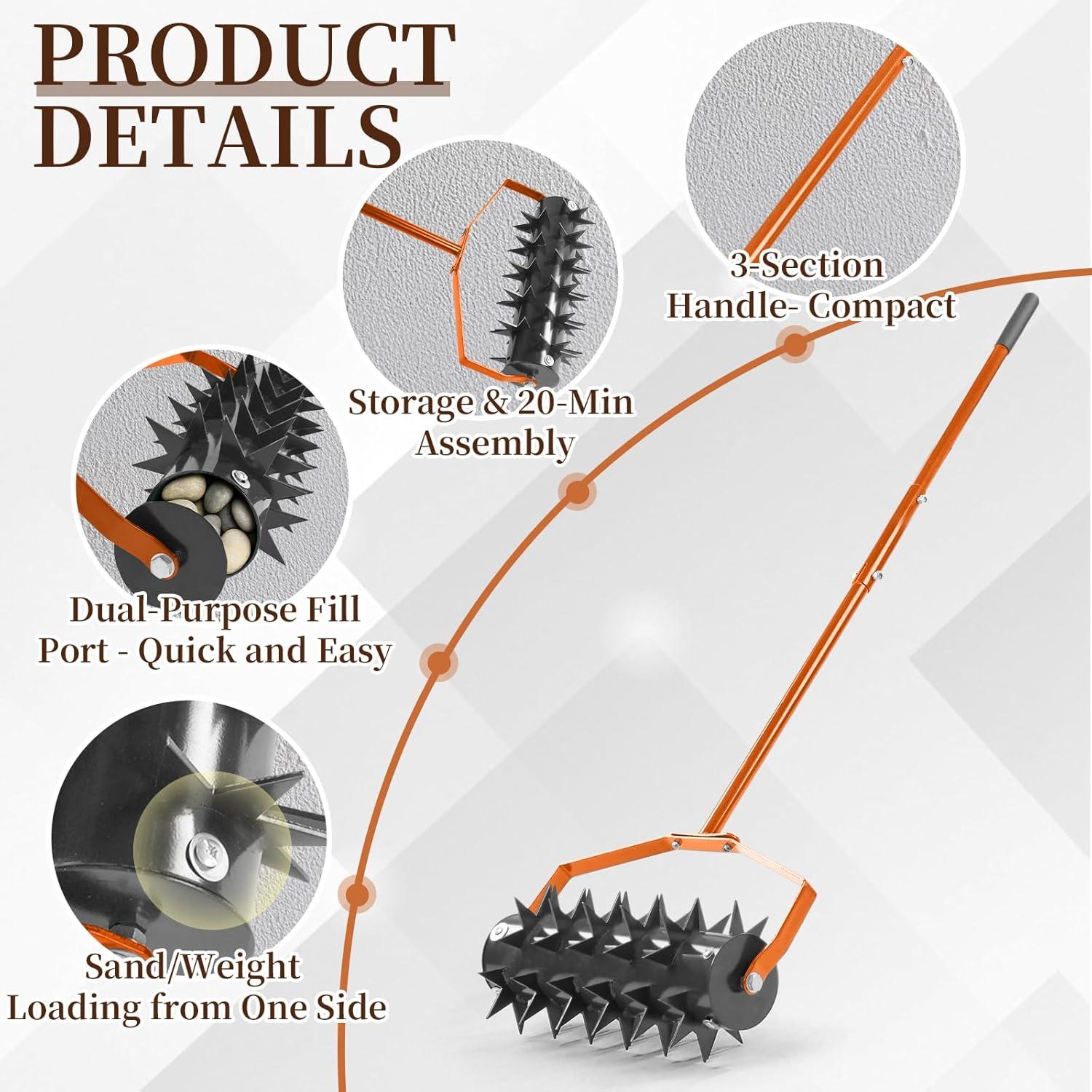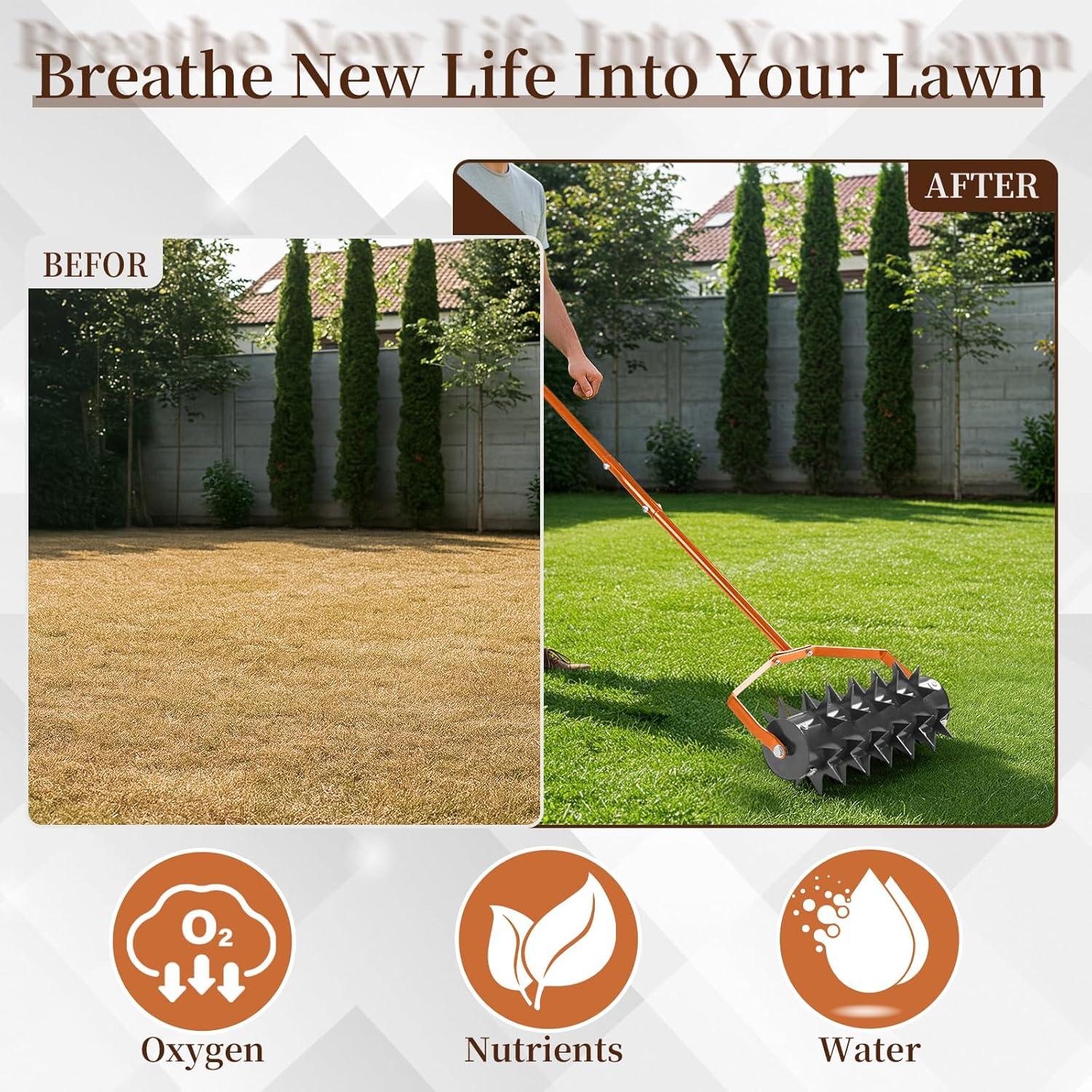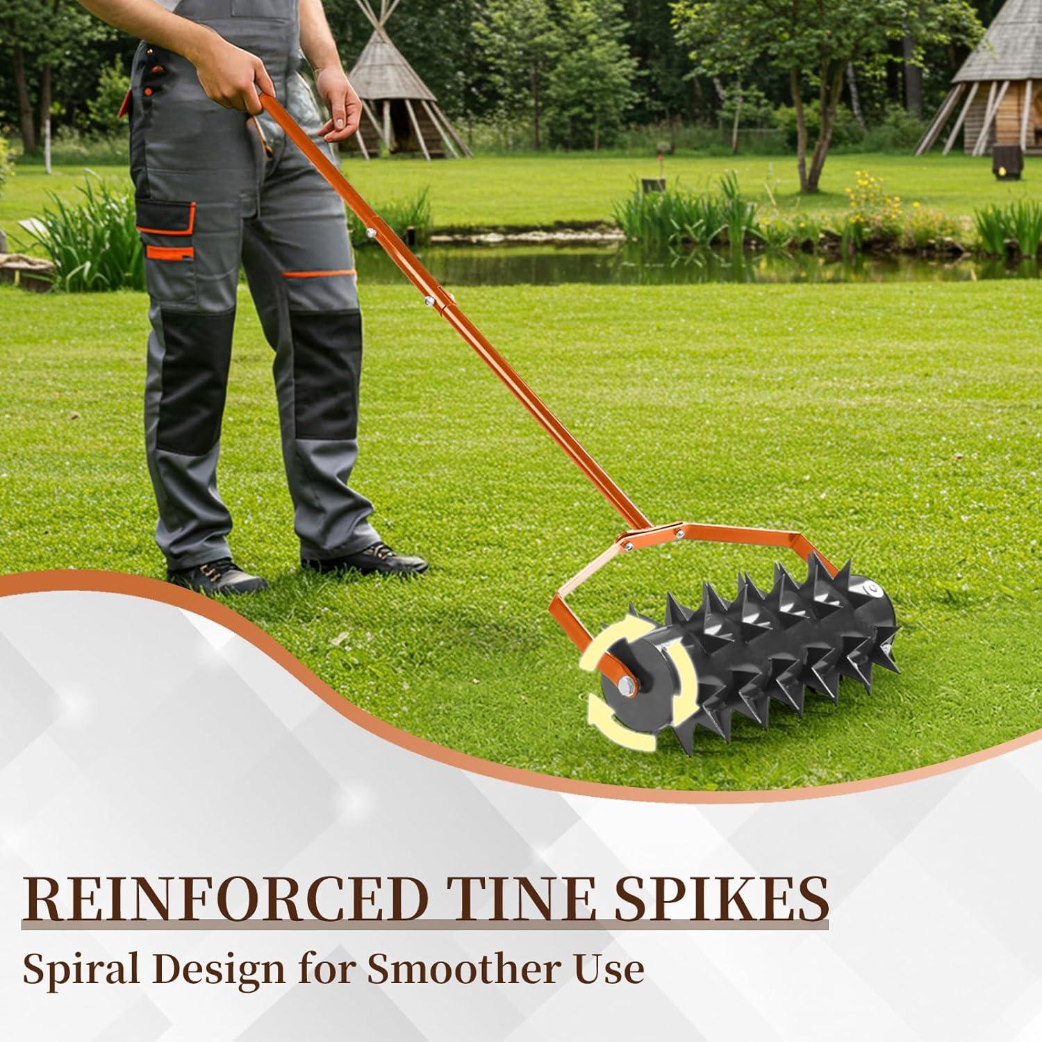 【Built-in Soil Collection Tray】Our manual lawn aerator features a sturdy built-in soil plug tray that collects all extracted soil plugs during aeration, preventing messy scattering across your lawn. No extra time and effort on post-cleanup—keep your lawn neat while aerating, and soil disposal becomes a breeze. The durable solid tray ensures long-lasting performance for years of tidy lawn maintenance