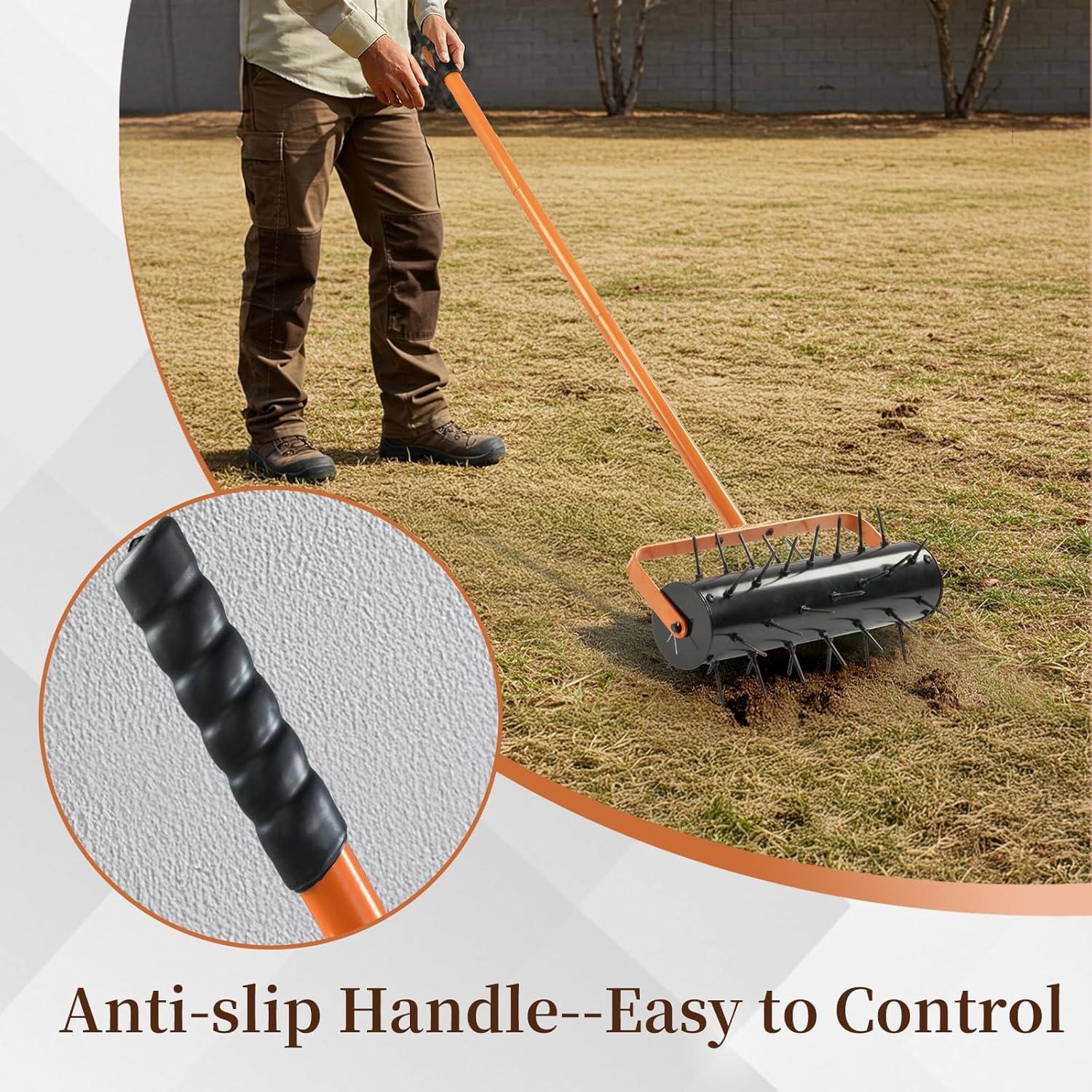 【Ergonomic Bend-Free Design】The 35.43-inch extended handle fits most heights perfectly, letting you aerate without bending or back strain for comfy long-hour gardening. Its T-shaped grip with soft non-slip cushion boosts comfort for continuous use and cuts effort for smooth, effortless aeration; the non-slip rectangular foot bar adds stability to push the aerator into soil with less force.