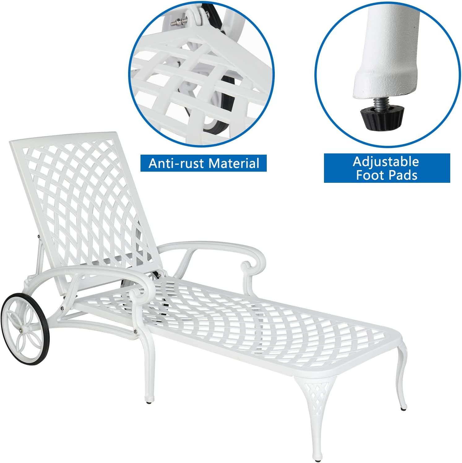 【DURABLE CAST ALUMINUM】This chaise lounge chair is made of cast aluminum material which features durable, weather proof, rust resistance, oxidation prevention, easy maintenance. Strudy legs for larger weight capacity