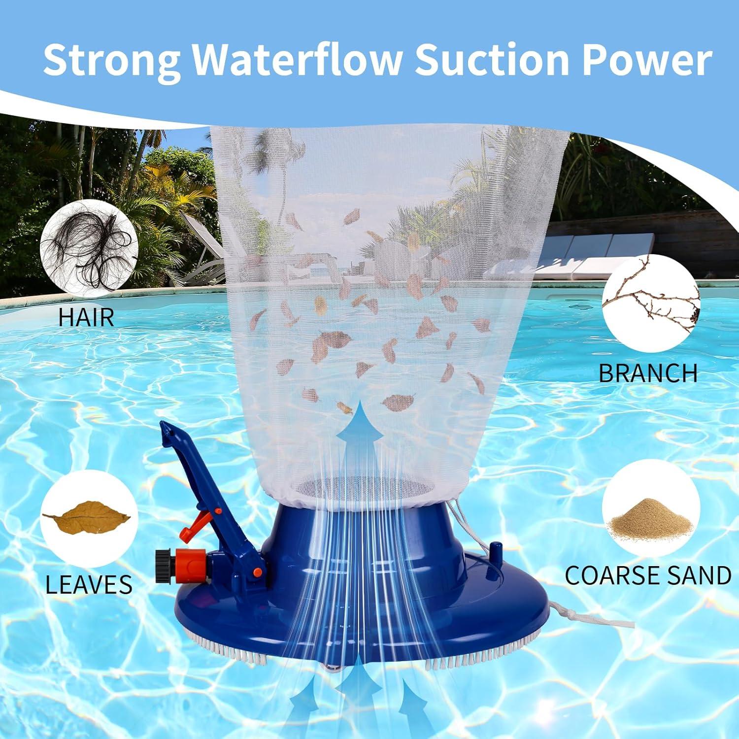 STRONG SUCTION: Pool vacuum head features high-pressure water jets that create powerful suction and help suck leaves into included mesh bag when pool cleaning