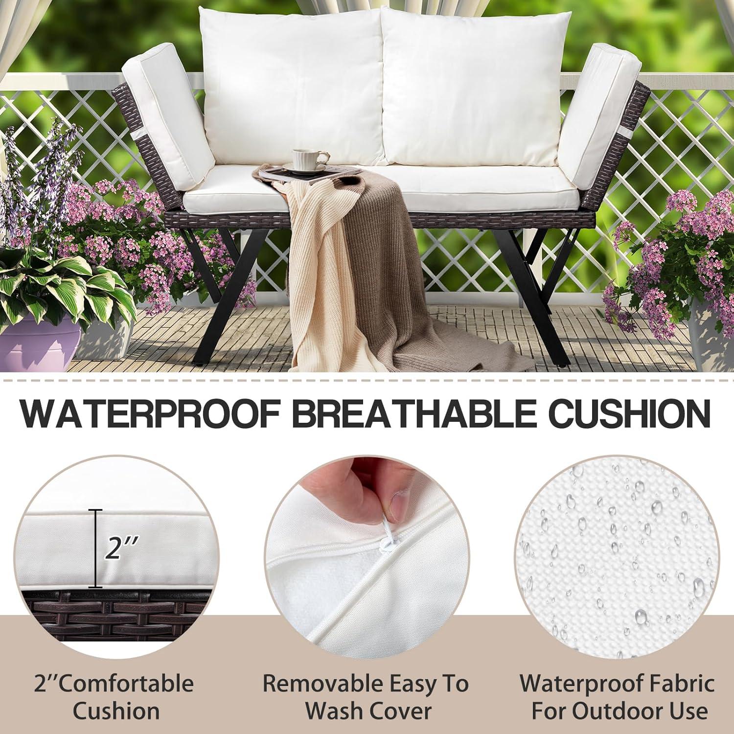 Rattan Material: This outdoor sofa bed is made of high quality rattan, which is tough and Sturdy. The all-weather rattan material makes the sofa bed weatherproof, which can well protect it from UV rays and fading colors. Reinforced joints provide greater durability than standard wicker furniture