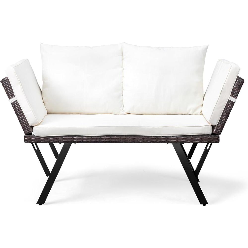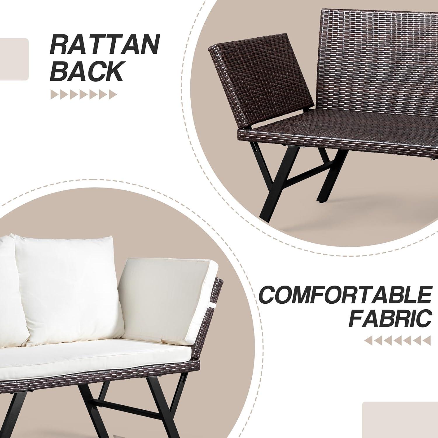 Outvita Outdoor Convertible Couch Sofa Bed, Woven Rattan Patio Furniture Daybed w/Adjustable Armrests, Removable Cushions and Pillows for Porch Pool Balcony