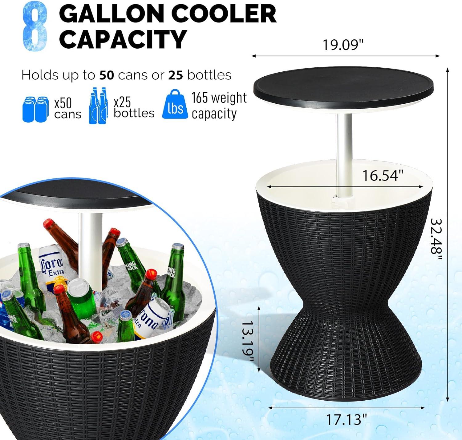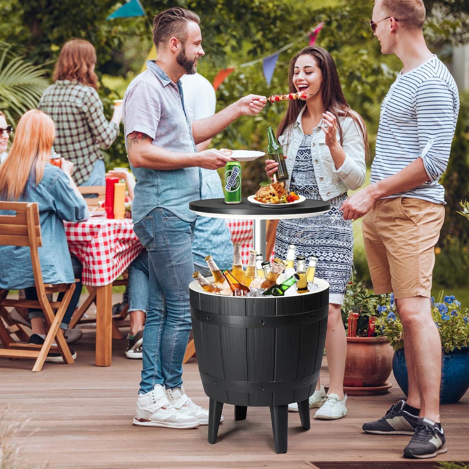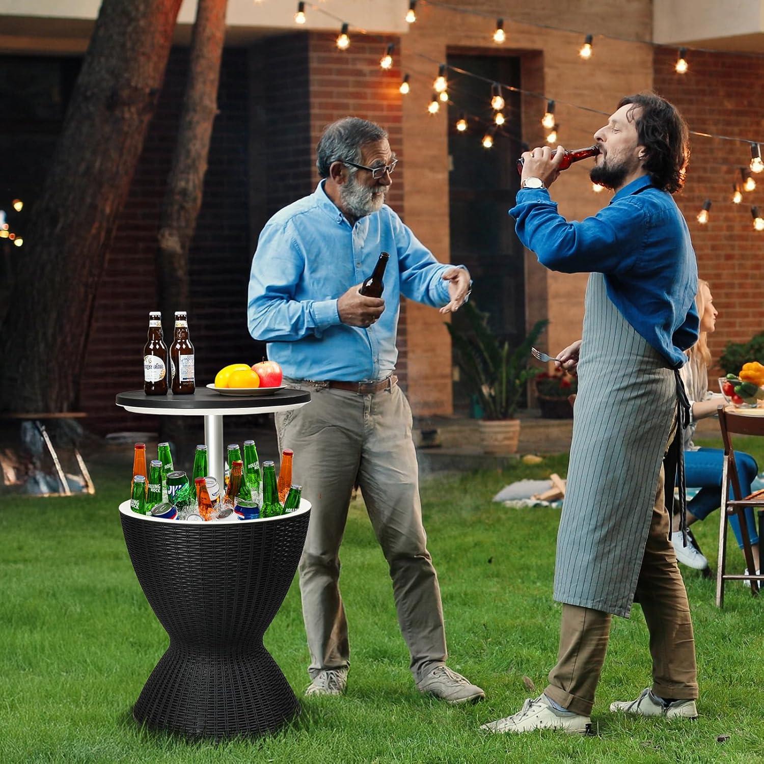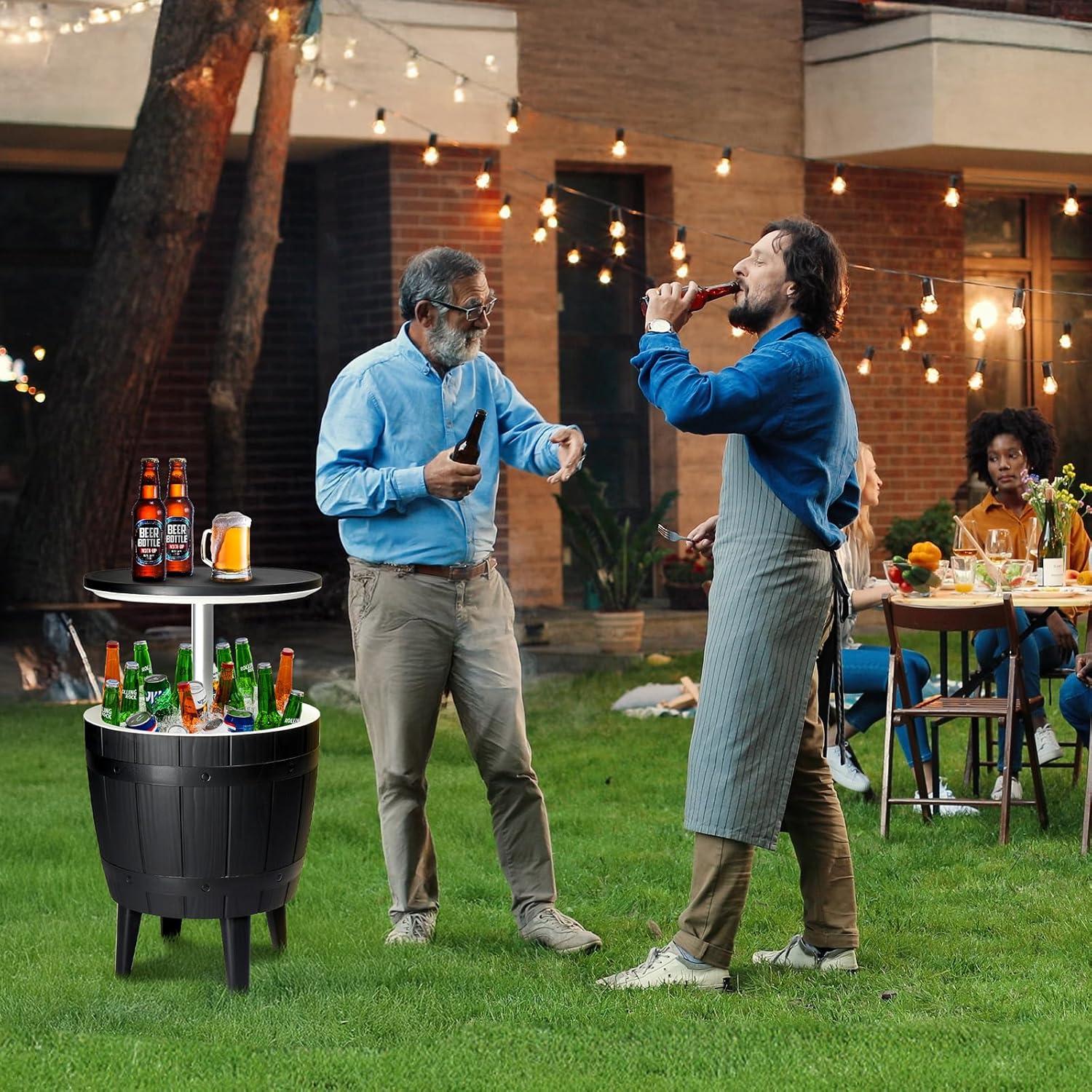 【Generous 10 Gallon Capacity】 The Patio Cooler Table offers ample space for your beverages. The unique lid heightening design allows the bar table to reach a height of 33 inches that makes it easily transforms into a stylish cocktail table, accommodating up to 65 cans or 33 bottles along with ice