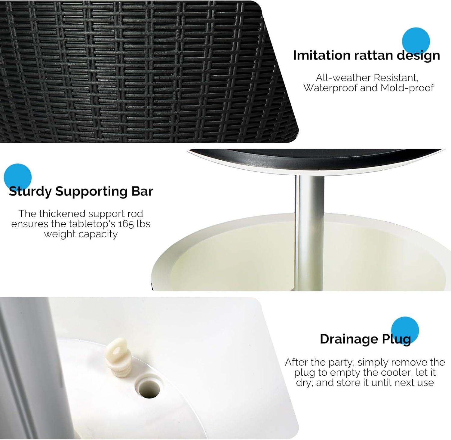 【Durable All-Weather Construction】 Crafted from weather-resistant resin with a stylish tree-like texture, this cooler table is designed to withstand the elements. With an adjustable height that locks securely from 22 to 32 inches and a weight capacity of 110 lbs, it’s both versatile and sturdy