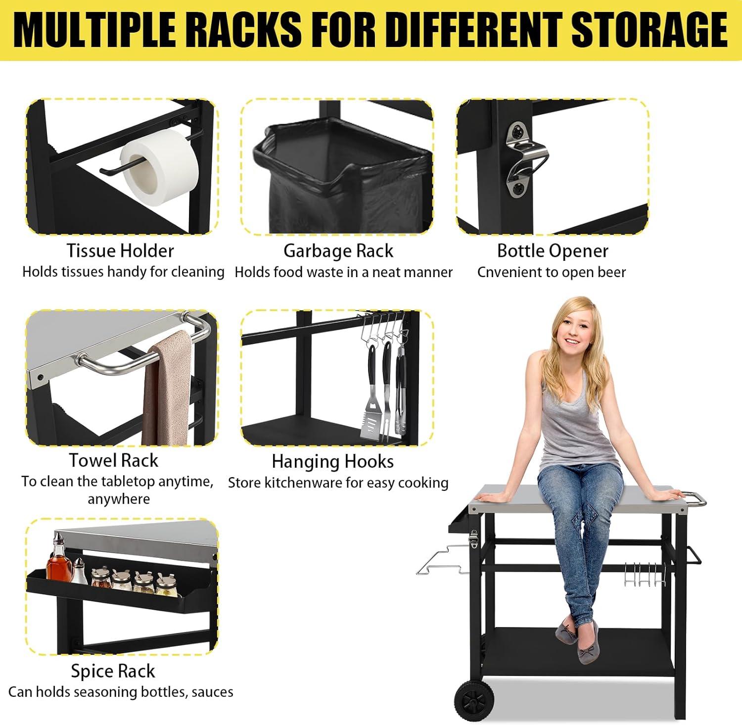 【Large Storage】This grill table has two big storage parts, giving you plenty of space for added convenience when organizing and transporting your items. In addition, there has three tool hooks, side spice holder , paper tissue holder, towel rack, garbage rack, bottle opener, etc.