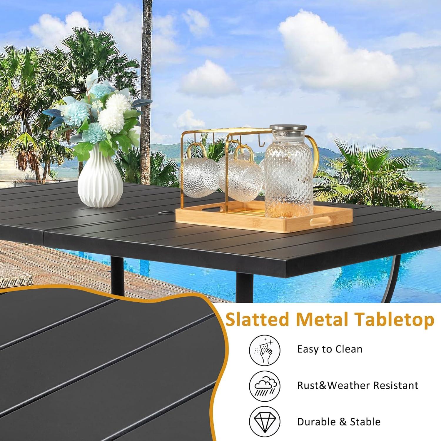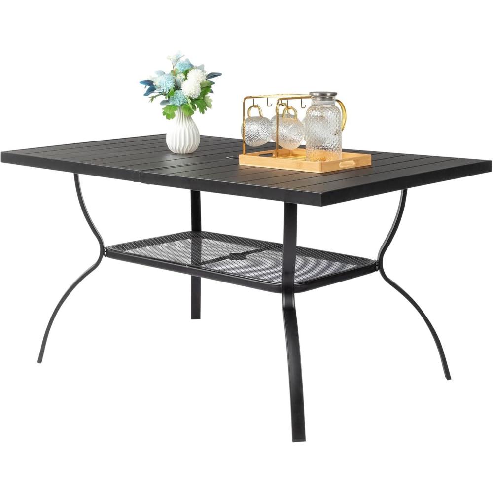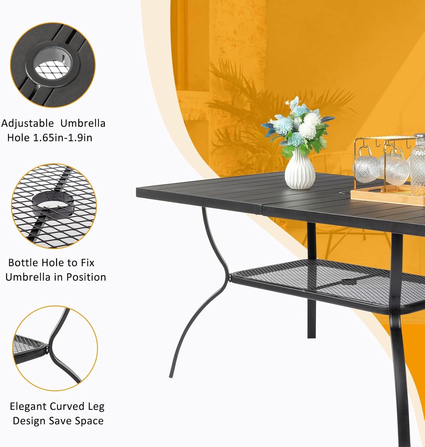 【Dimension & Peculiarity】This rectangular metal outdoor table is 58.1″L x 35.4″W x 28.5″H. It's spacious and comfortable enough for 6 person family's dinner. Diameter of umbrella hole: 1.65”-2.55″.You can resize the hole by switching the lid, so you can add an appropriate umbrella.