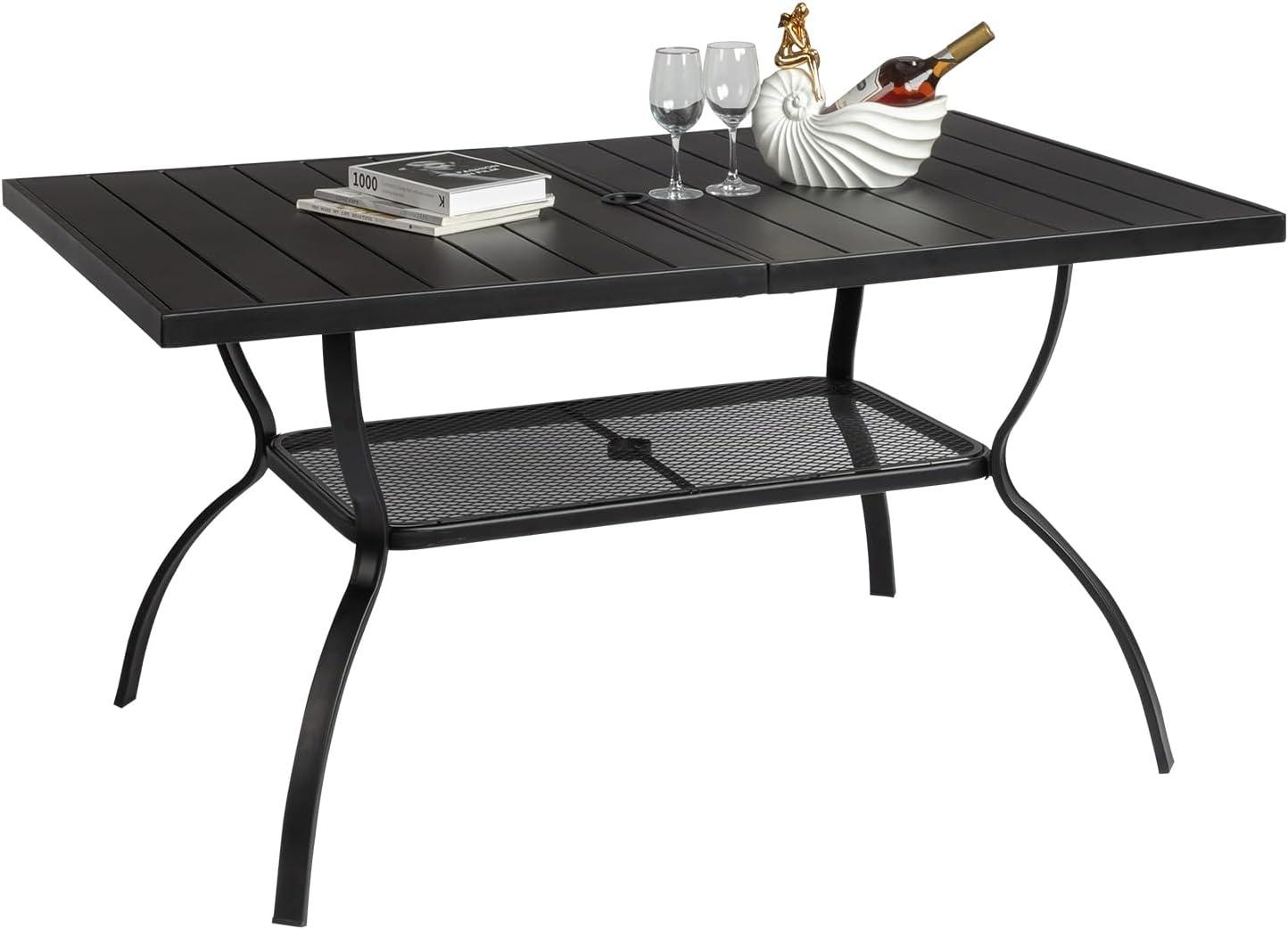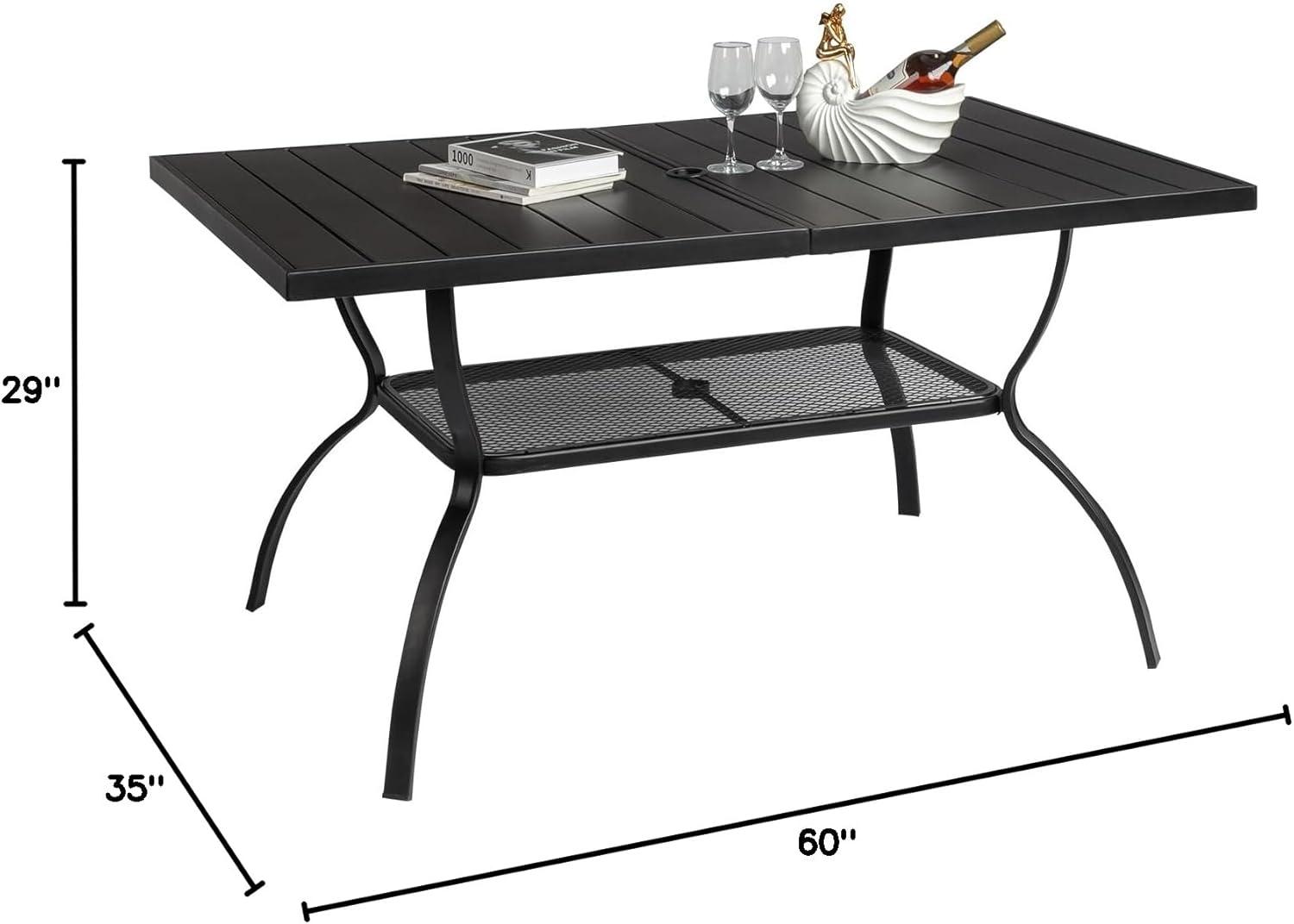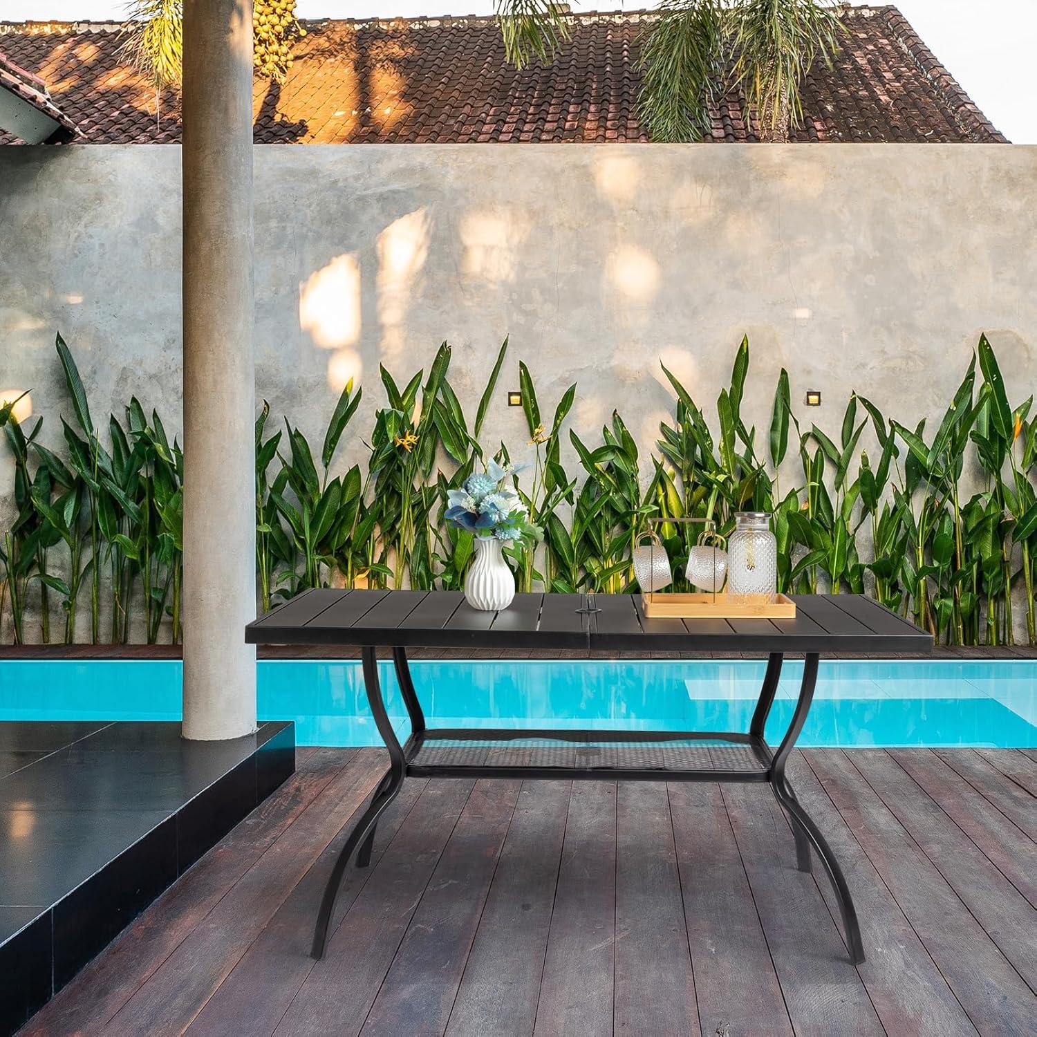 【Dimension & Peculiarity】This rectangular metal outdoor table is 58.1″L x 35.4″W x 28.5″H. It's spacious and comfortable enough for 6 person family's dinner. Diameter of umbrella hole: 1.65”-2.55″.You can resize the hole by switching the lid, so you can add an appropriate umbrella.