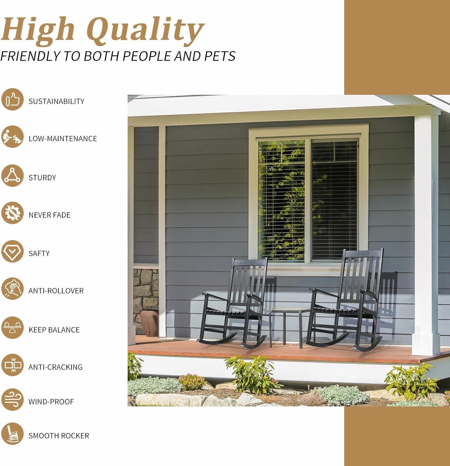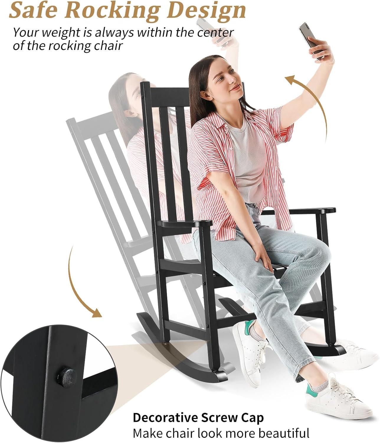 【Ergonomic Design】This patio rocking chair is designed with slat structure, which effectively promotes the heat dissipation and offers you the optimal sitting experience. In addition, high backrest, large armrests, scientific swaying arc, can bring you the perfect swaying enjoyment