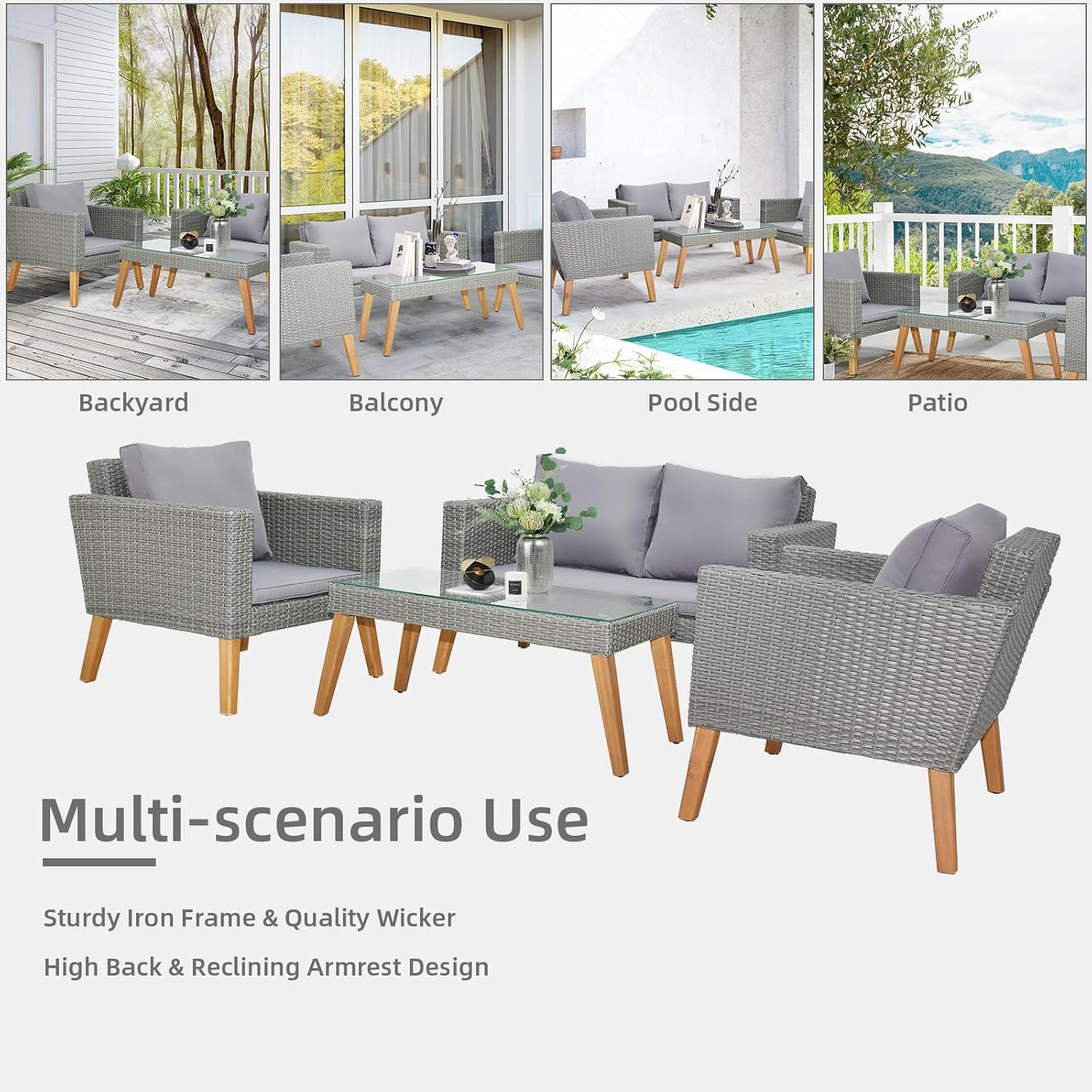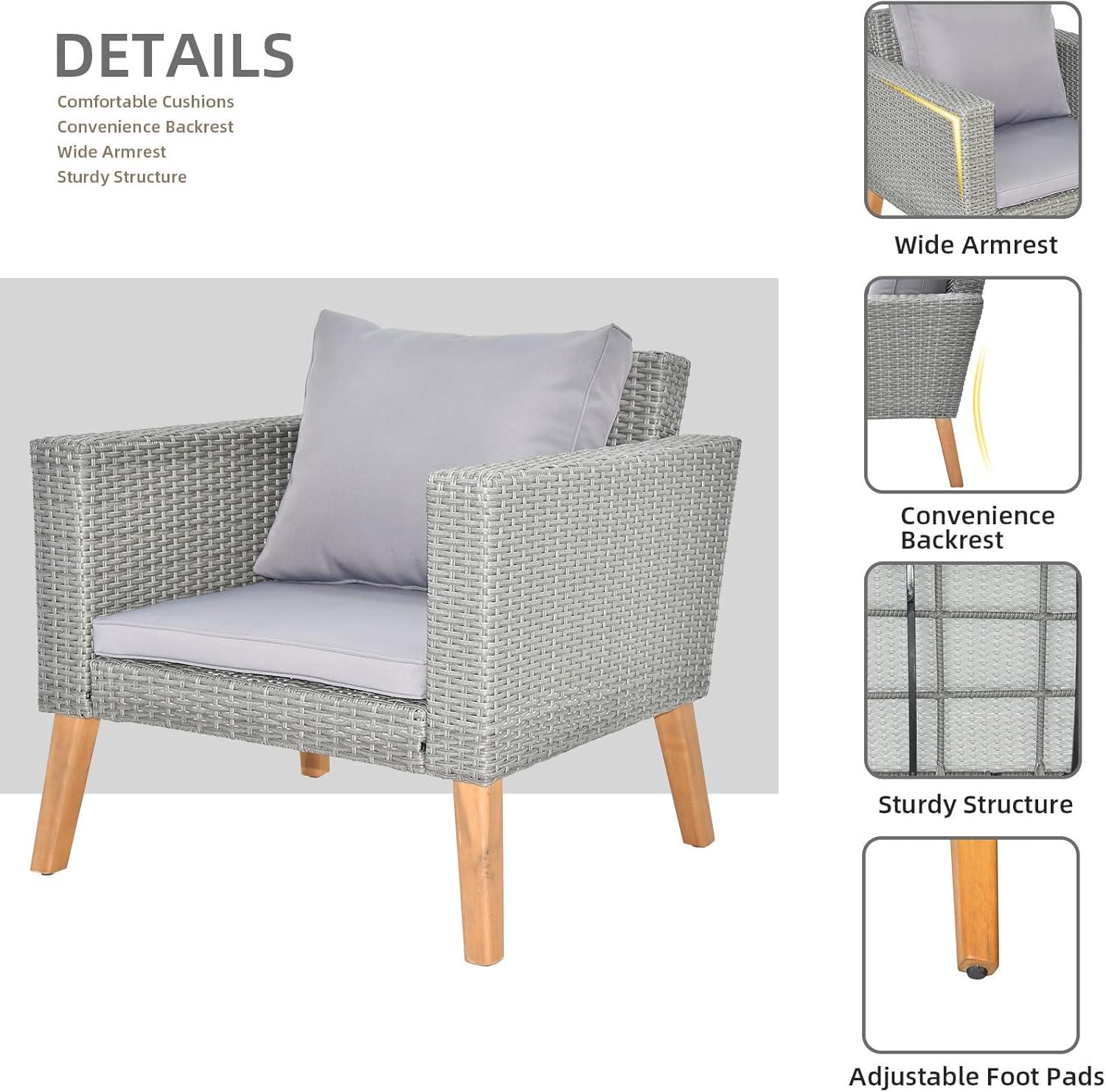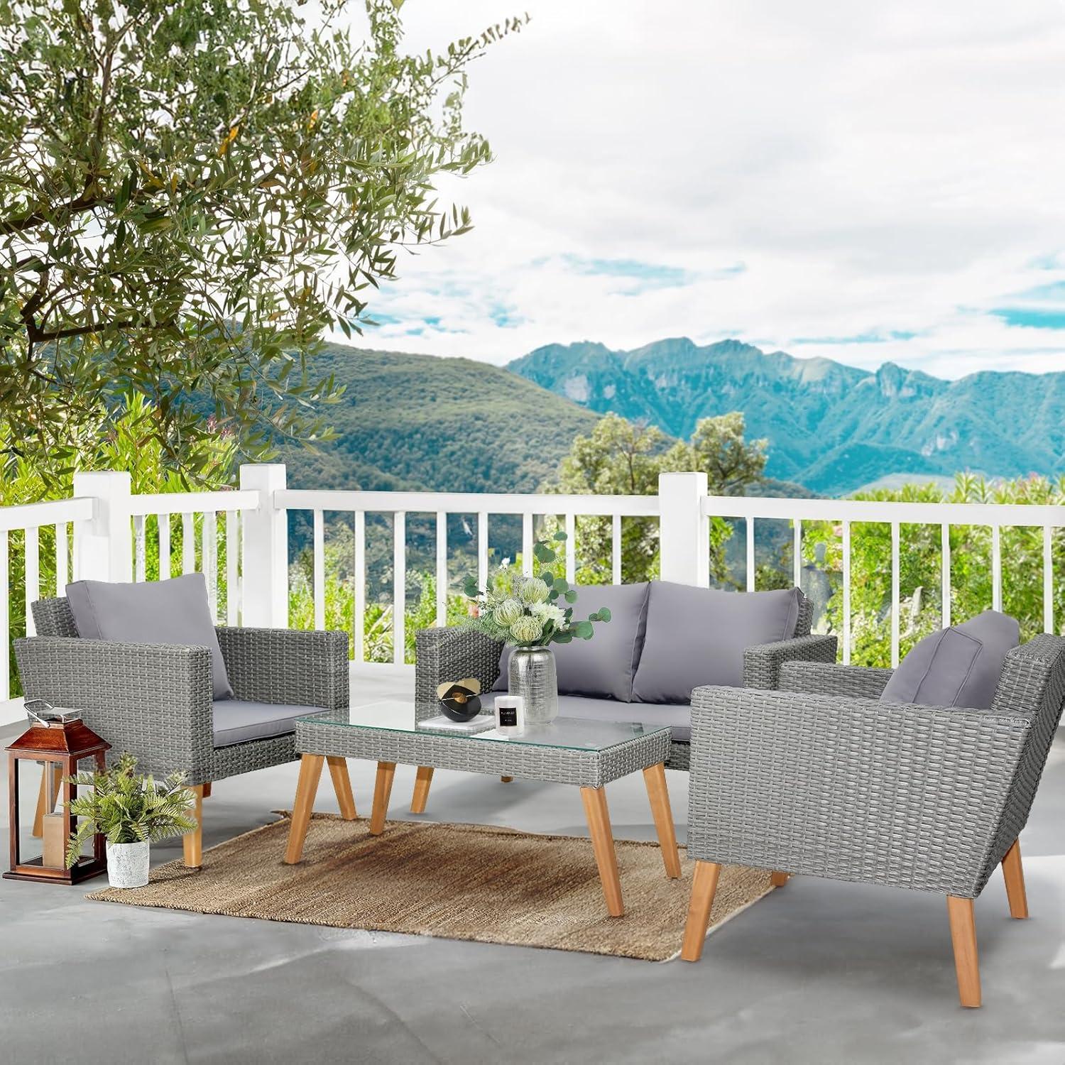 Outvita Patio Furniture 4pcs Outdoor Conversation Sofa Set with Acacia and Rattan Coffee Table, Loveseat and Single Chair for Backyard Garden Terrace Balcony