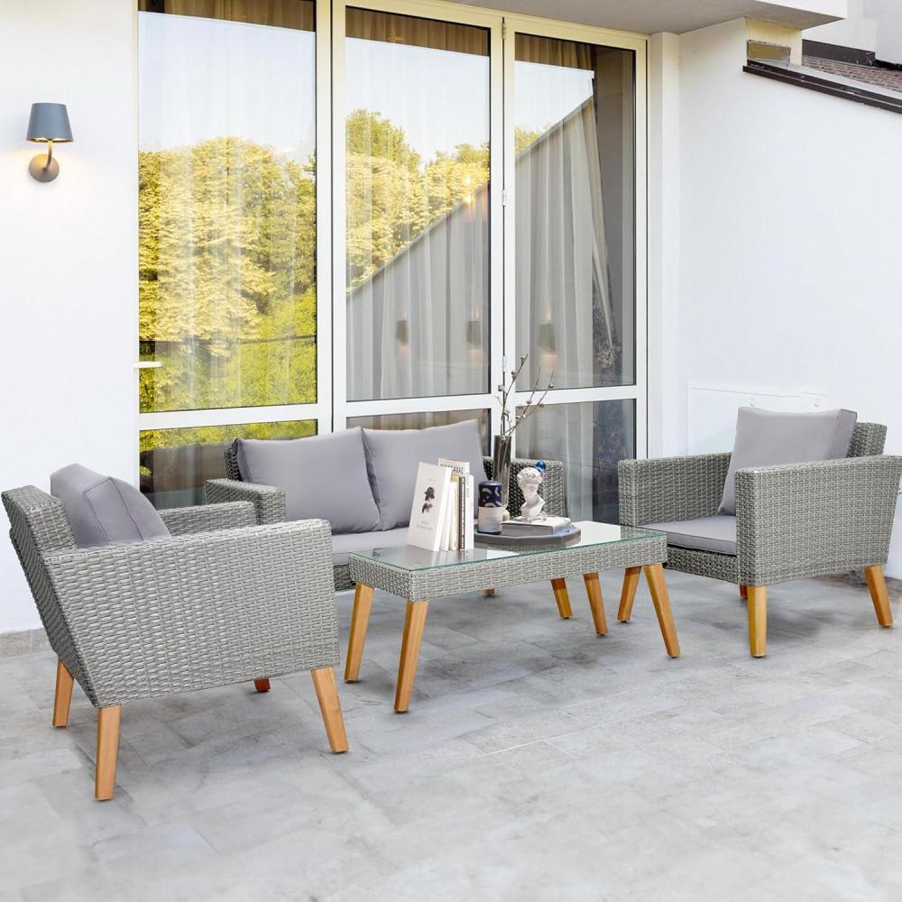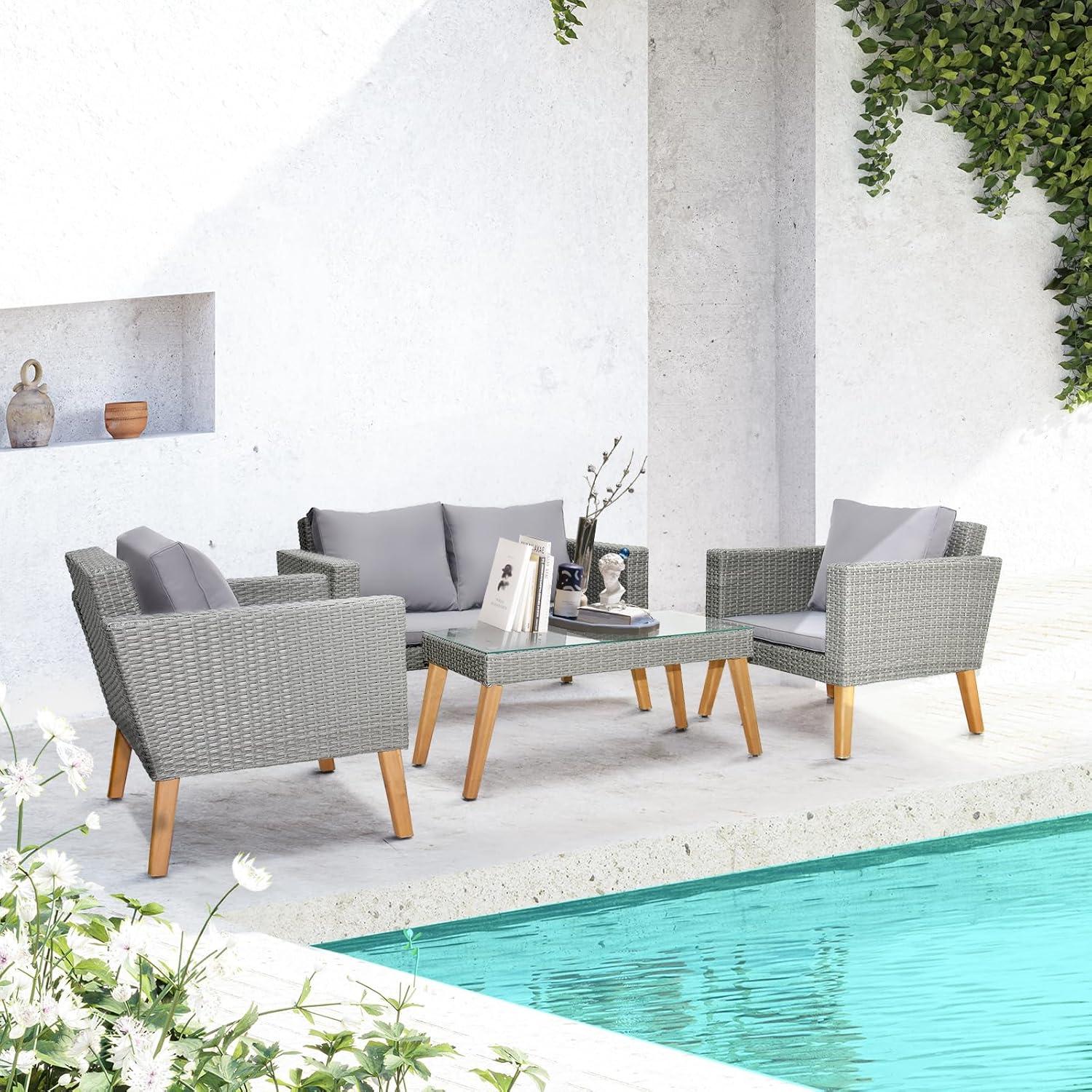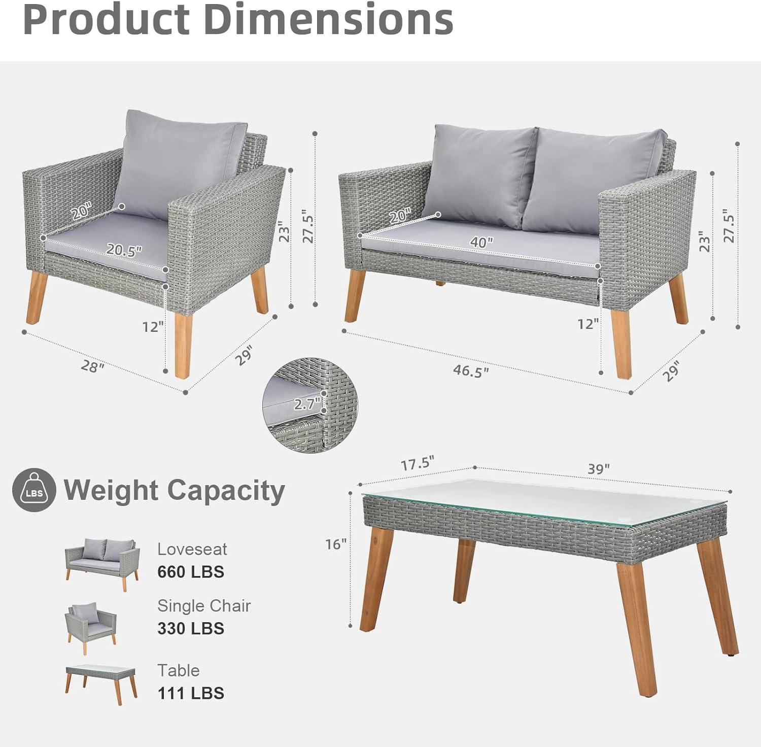 Outvita Patio Furniture 4pcs Outdoor Conversation Sofa Set with Acacia and Rattan Coffee Table, Loveseat and Single Chair for Backyard Garden Terrace Balcony