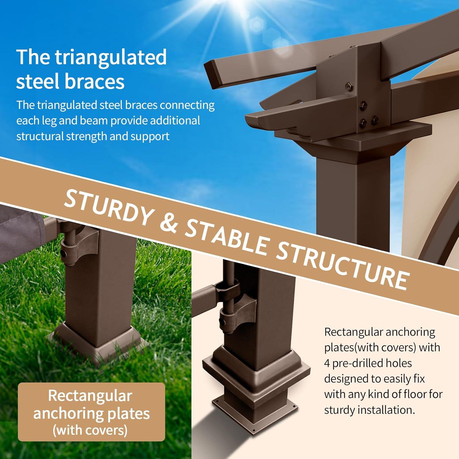 【HIGH QUALITY GAZEBO】Waterproof 180 grams of polyester fabric can withstand UV rays without fading so that you can use this outdoor pergola no matter when rainy or sunny day. Rectangular anchoring plates with 4 pre-drilled holes designed to easily fix with any kind of floor for sturdy installation.