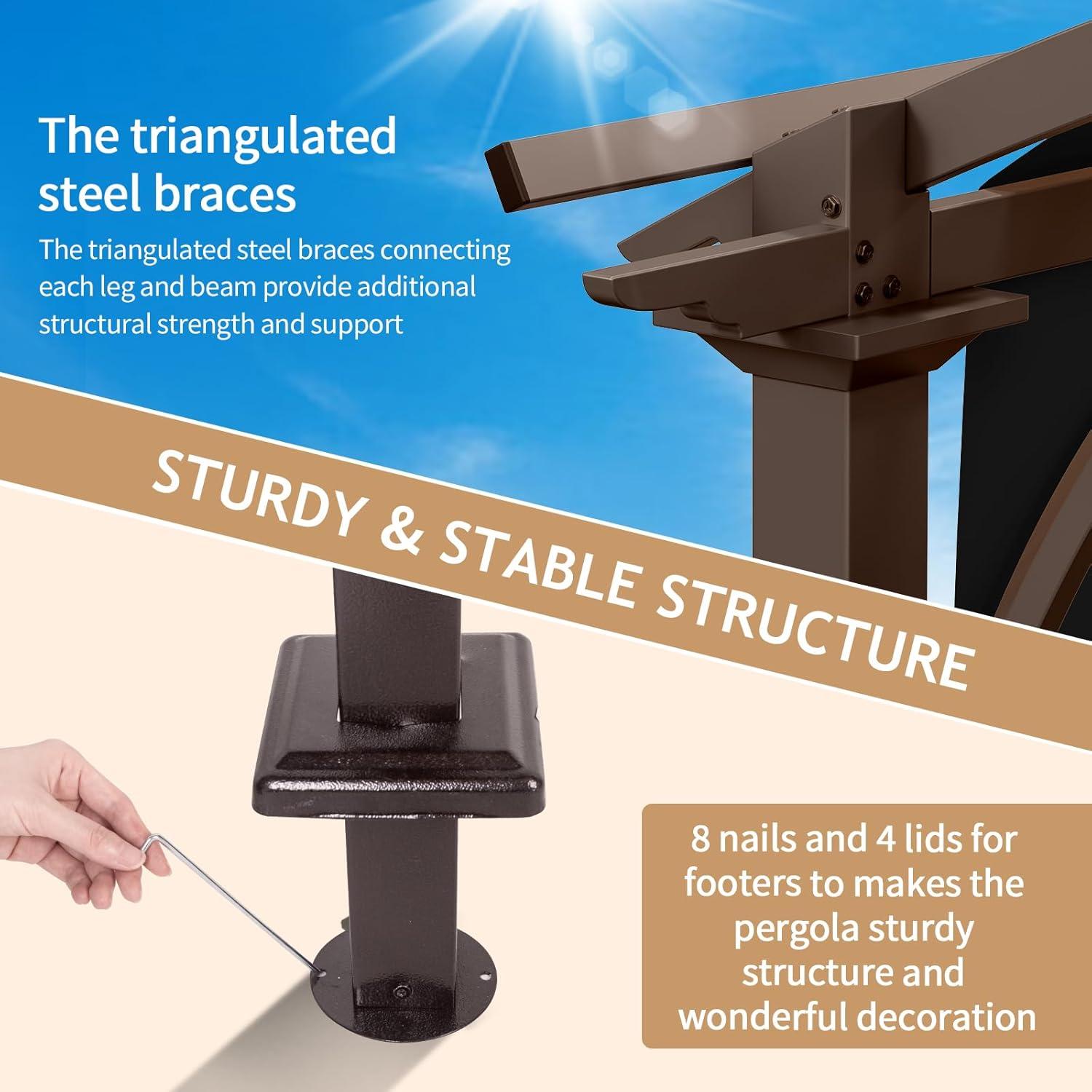 【FIRM CONSTRUCTION】High grade powder-coated iron frame with triangular shelf adds super stability to the patio arched pergola and more durable for long time using at outdoor. And 8 ground nails make the assembled tent more stable and wind resistant.
