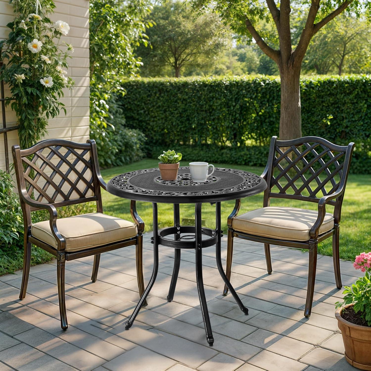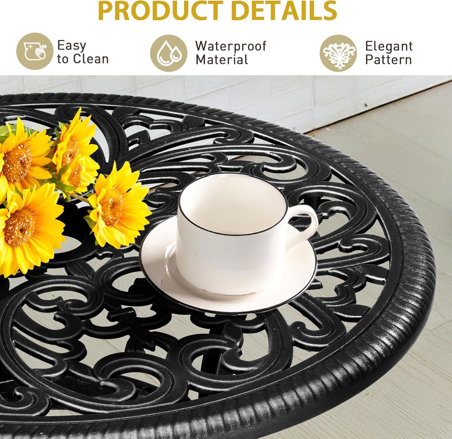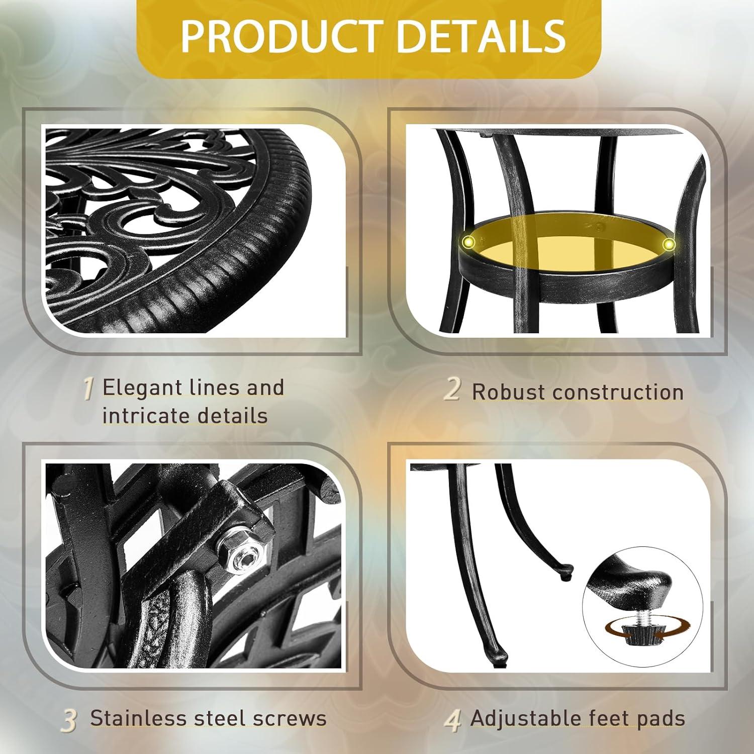 PREMIUM CAST ALUMINUM: Crafted from high-quality cast aluminum, this round bistro table is built to withstand the elements. With exceptional durability, weather resistance and rust-proof features, it ensures long-lasting outdoor enjoyment with minimal maintenance required