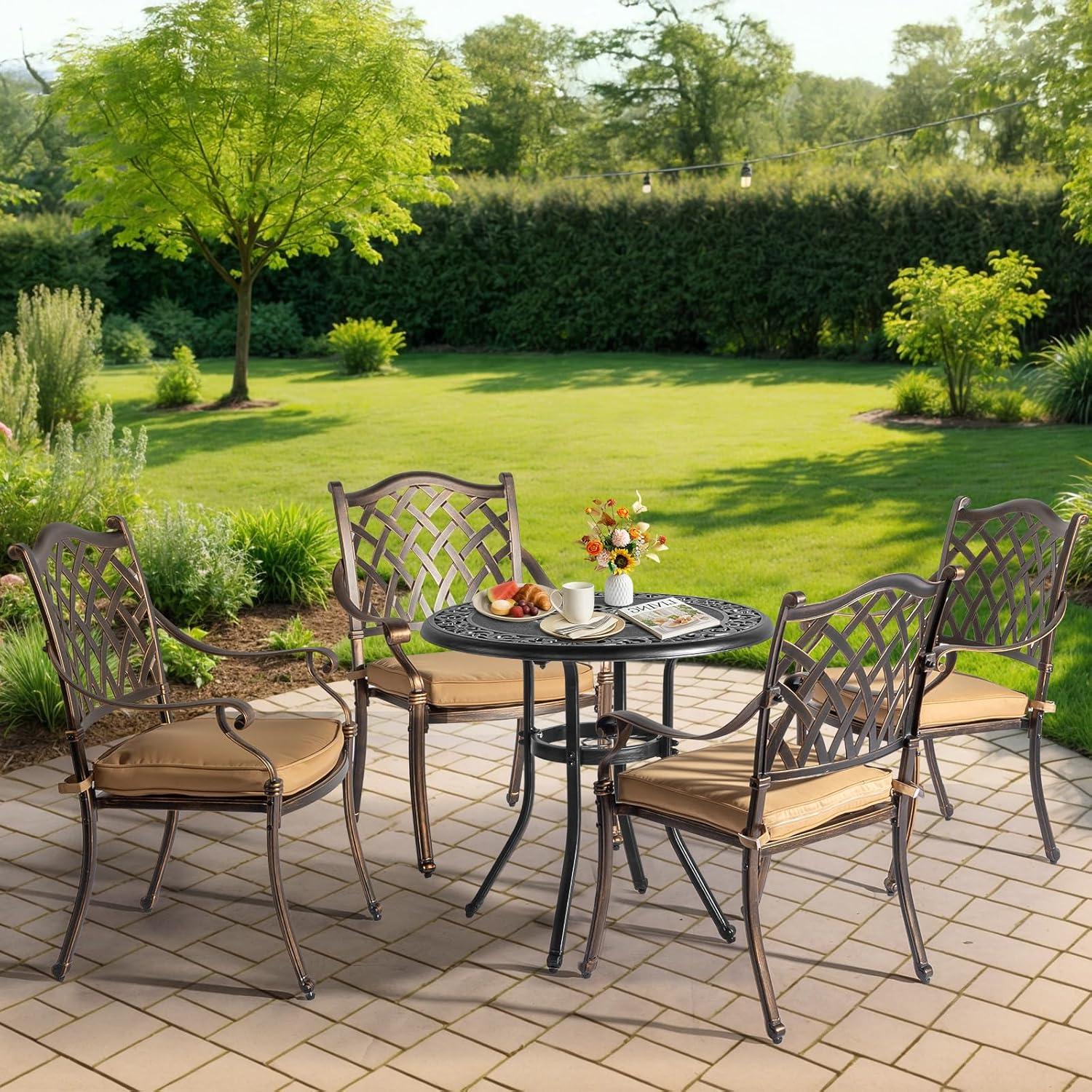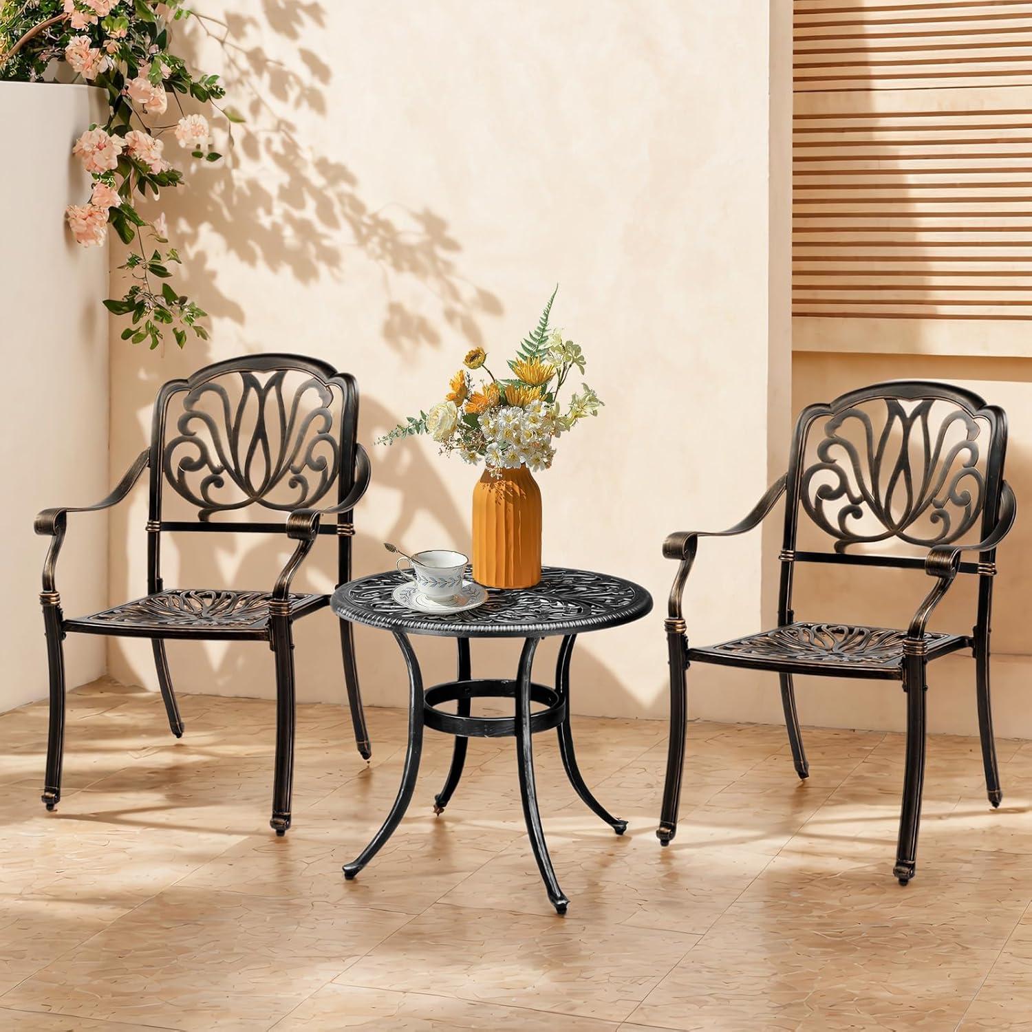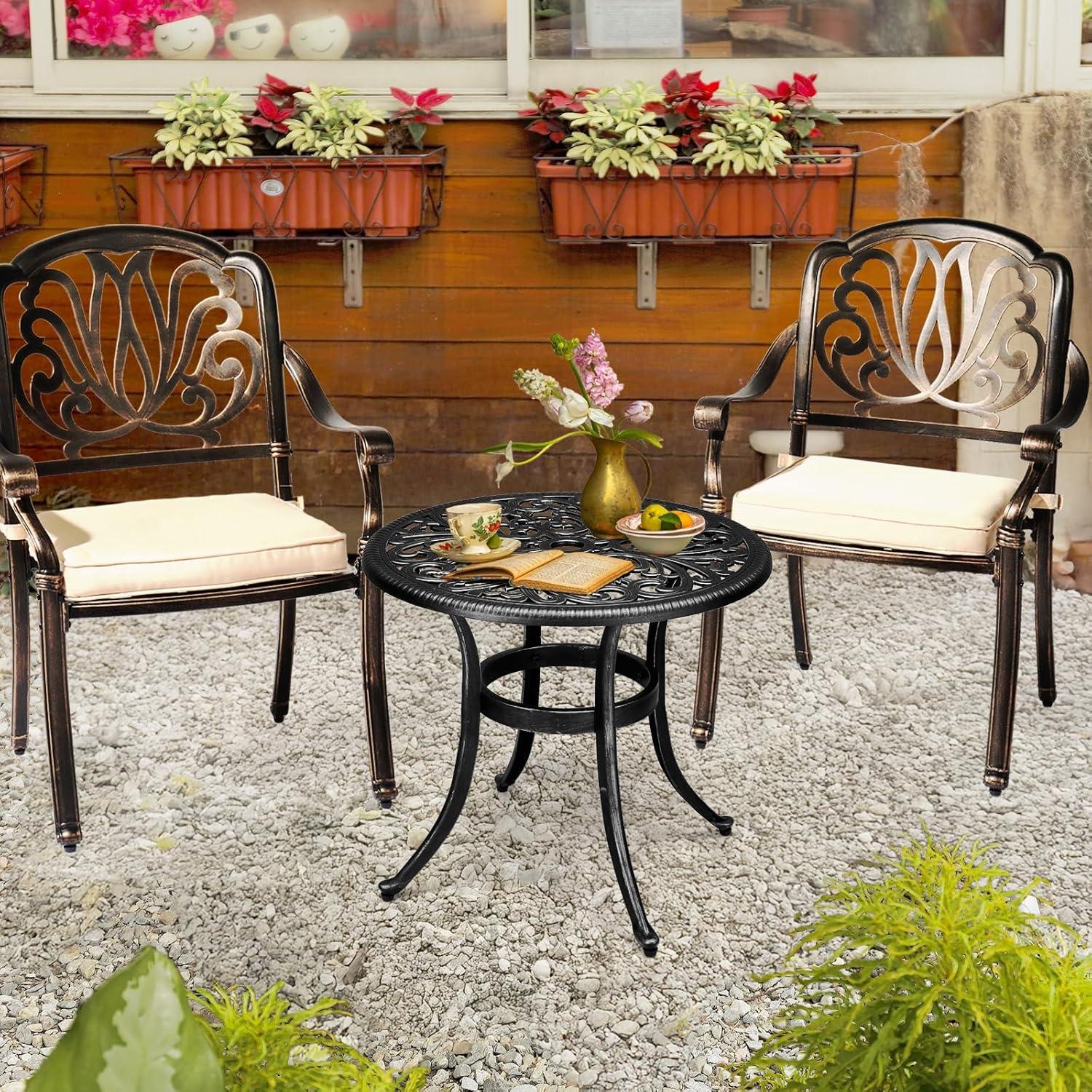 PREMIUM CAST ALUMINUM: Crafted from high-quality cast aluminum, this round bistro table is built to withstand the elements. With exceptional durability, weather resistance and rust-proof features, it ensures long-lasting outdoor enjoyment with minimal maintenance required