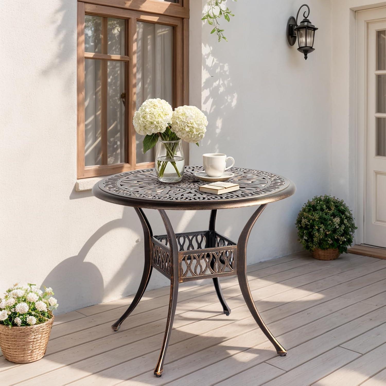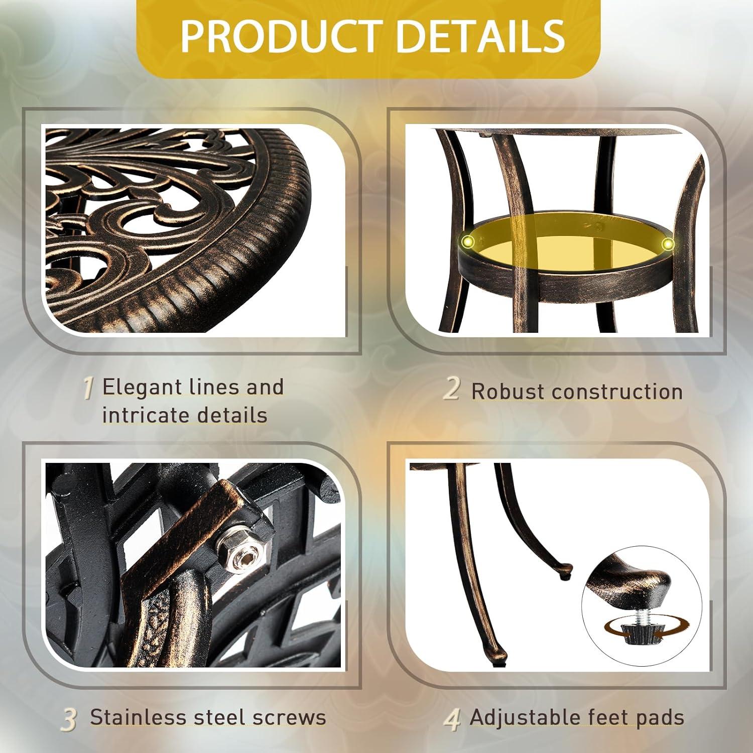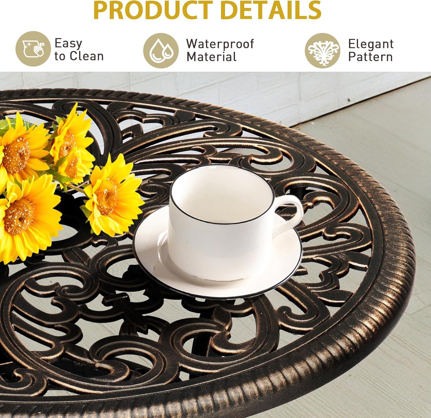 PREMIUM CAST ALUMINUM: Crafted from high-quality cast aluminum, this round bistro table is built to withstand the elements. With exceptional durability, weather resistance and rust-proof features, it ensures long-lasting outdoor enjoyment with minimal maintenance required