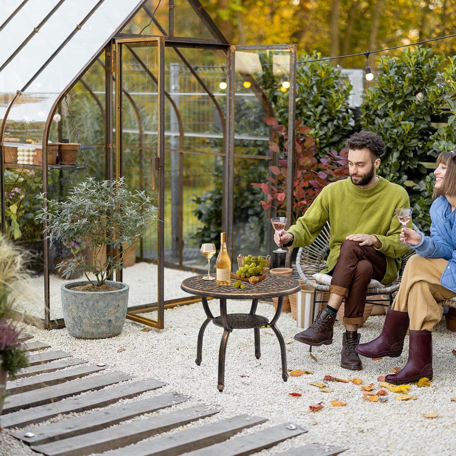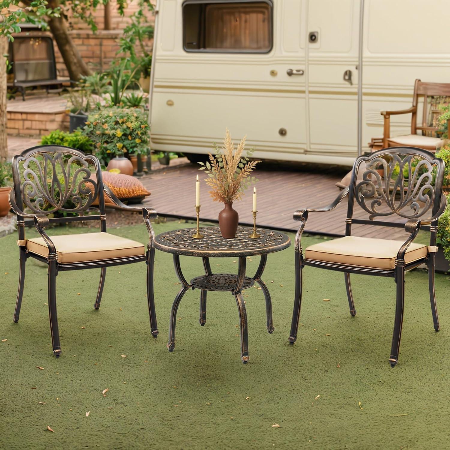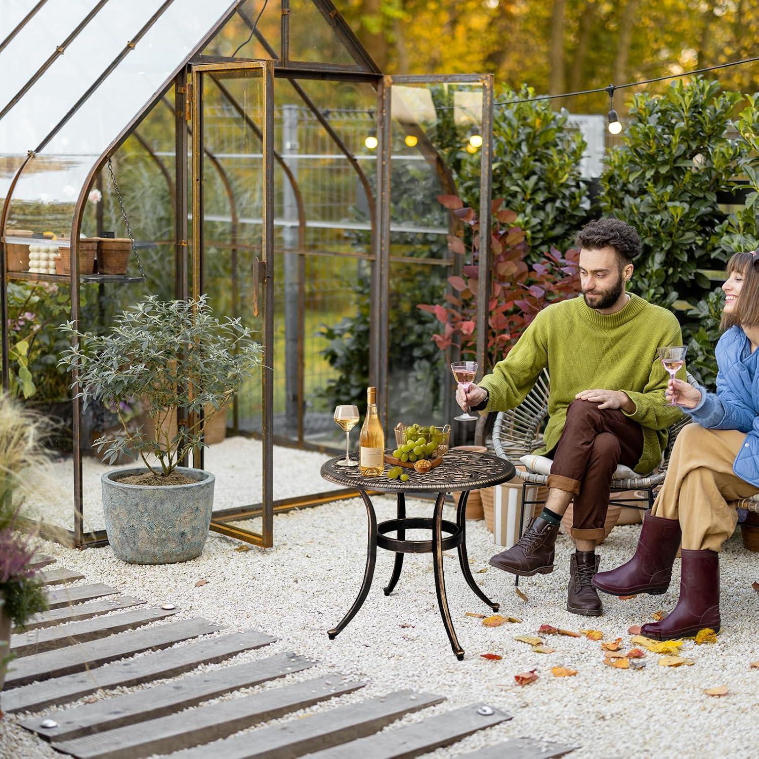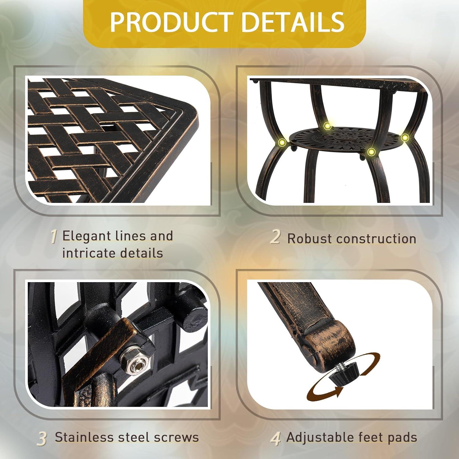 PREMIUM CAST ALUMINUM: Crafted from high-quality cast aluminum, this round bistro table is built to withstand the elements. With exceptional durability, weather resistance and rust-proof features, it ensures long-lasting outdoor enjoyment with minimal maintenance required