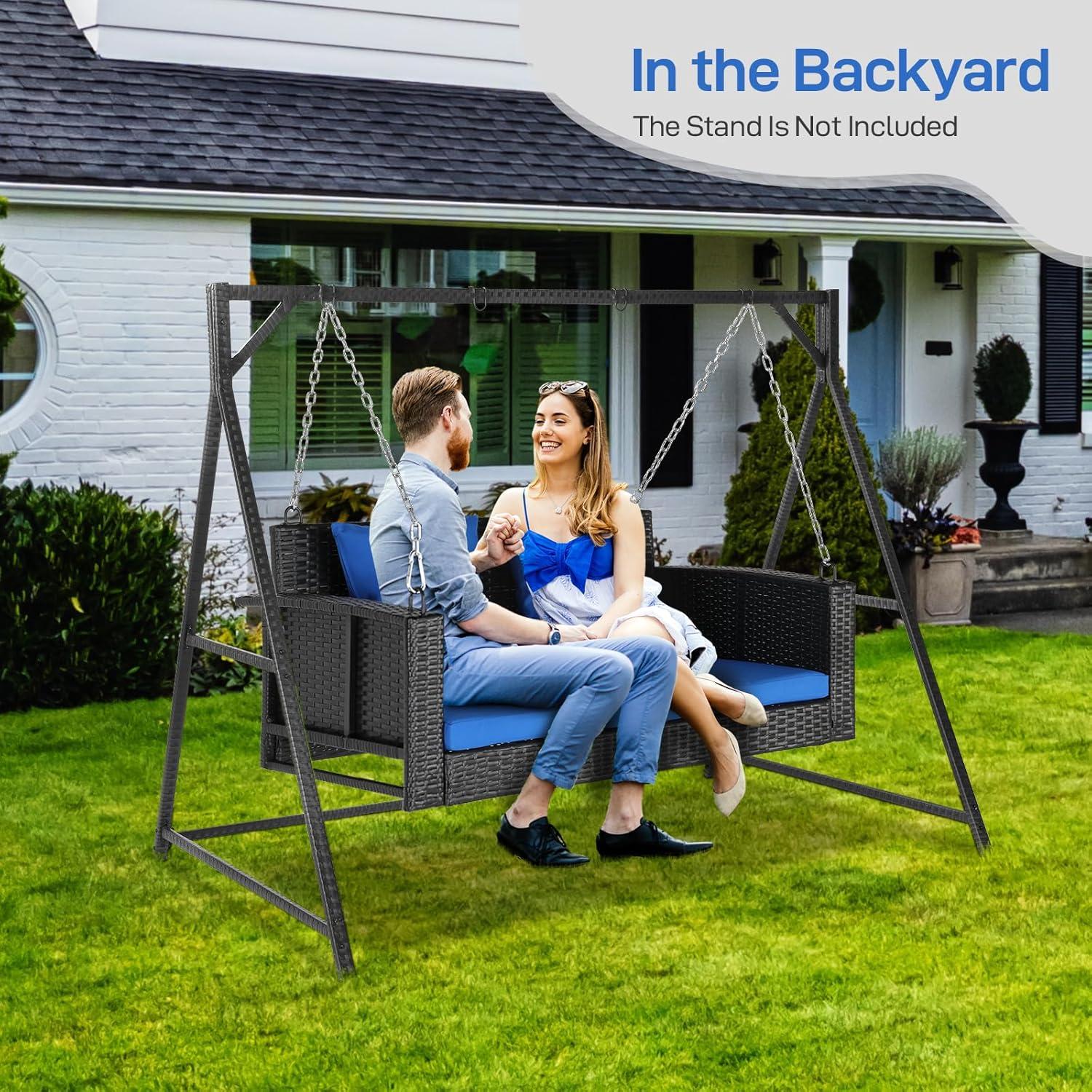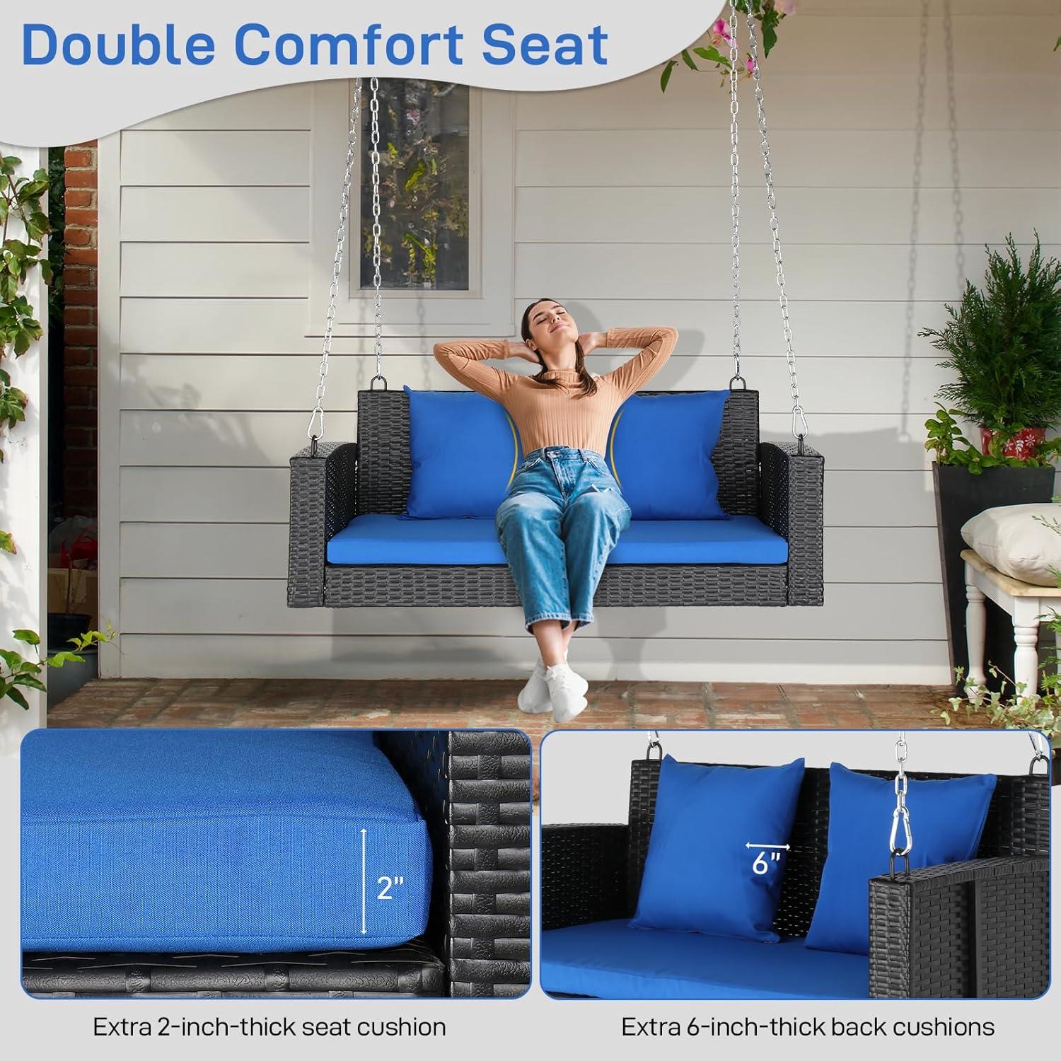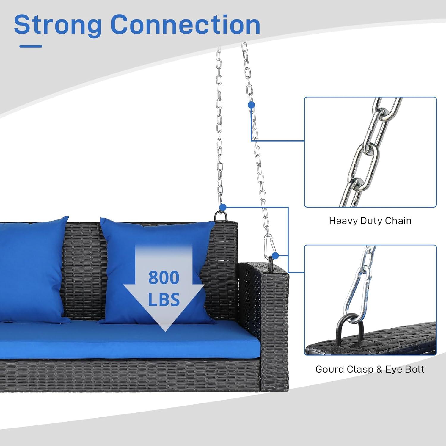 Outvita Porch Swing, 5FT Hanging Outdoor Porch Swings for Adults, Wicker 3 Person Patio Swing, with Cushion, Pillow and Chain for Garden, Backyard, Weight Capacity - 1000lbs(Black & Blue)