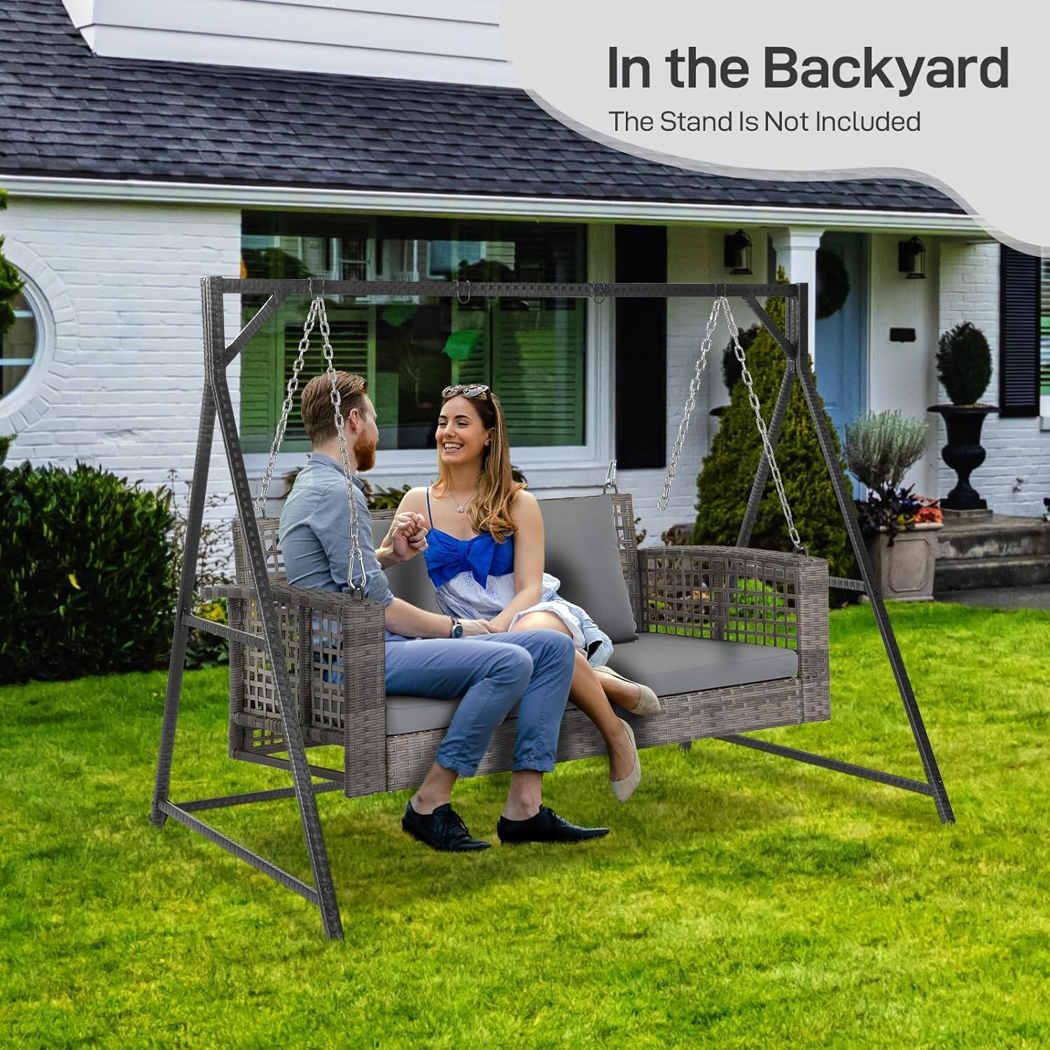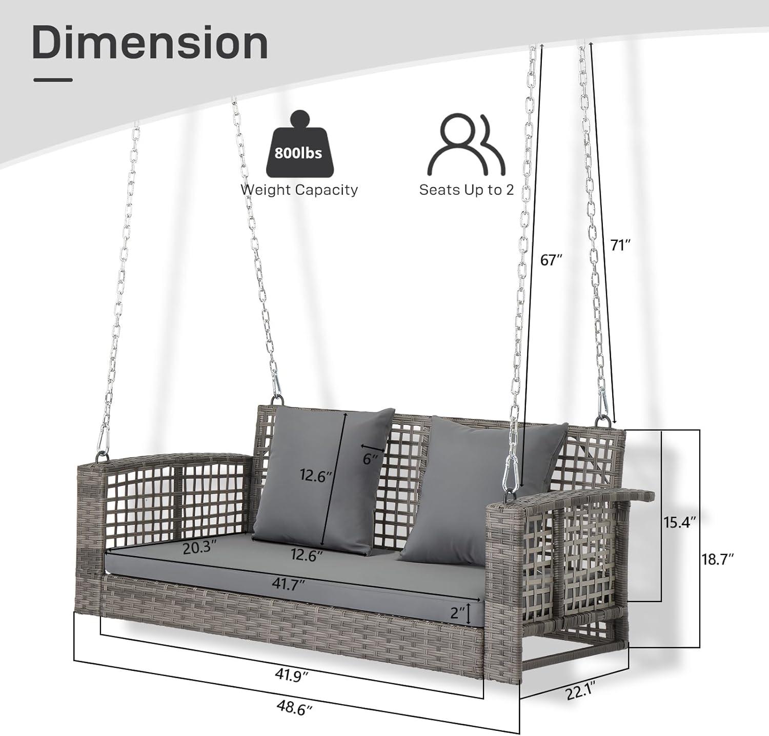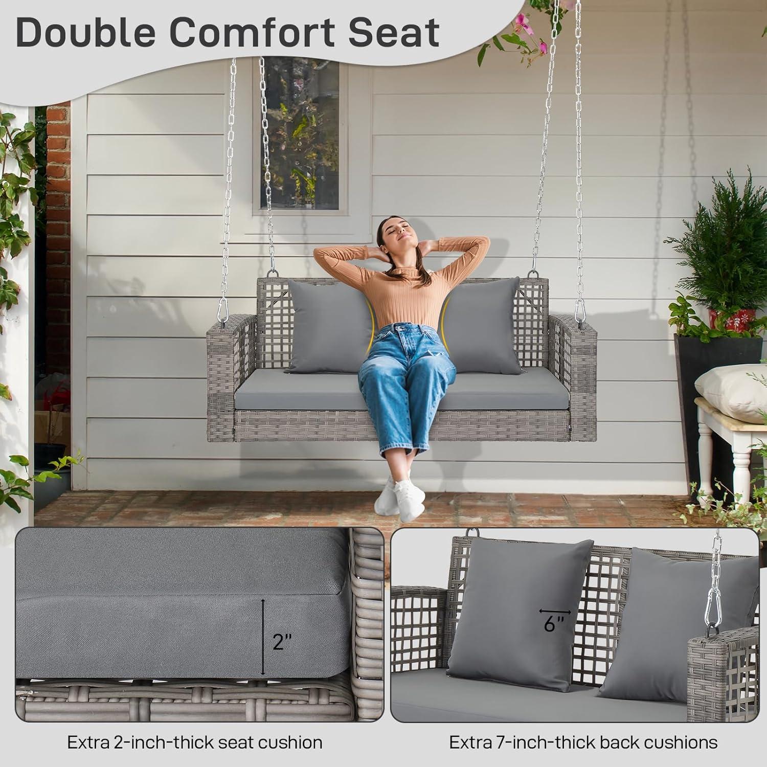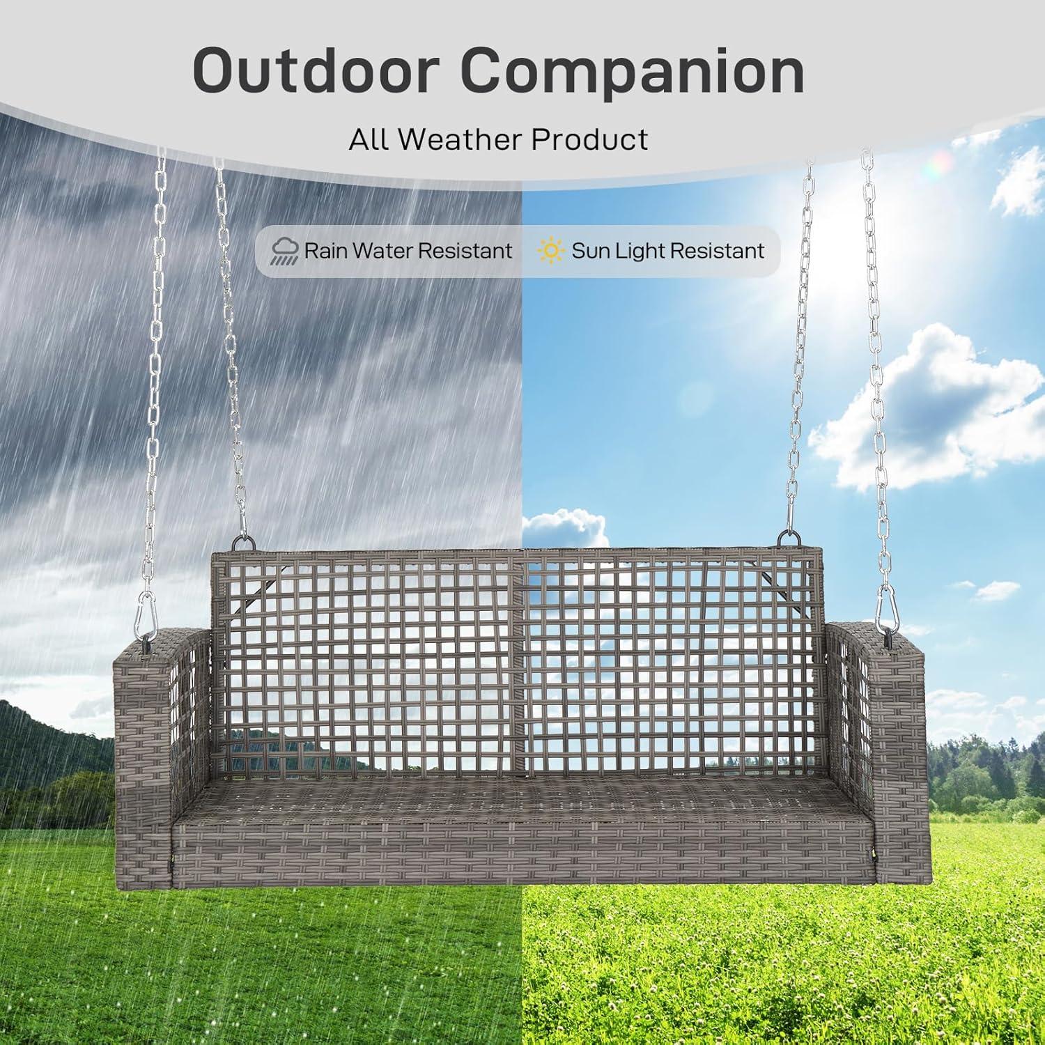 【Premium Materials】 The surface of the front porch swing is made of PE rattan, known for its smooth surface, durable and easy cleaning, suitable for outdoor use. Constructed from tempered steel with a rust-resistant coating, the outdoor swing frame ensures long-lasting durability.