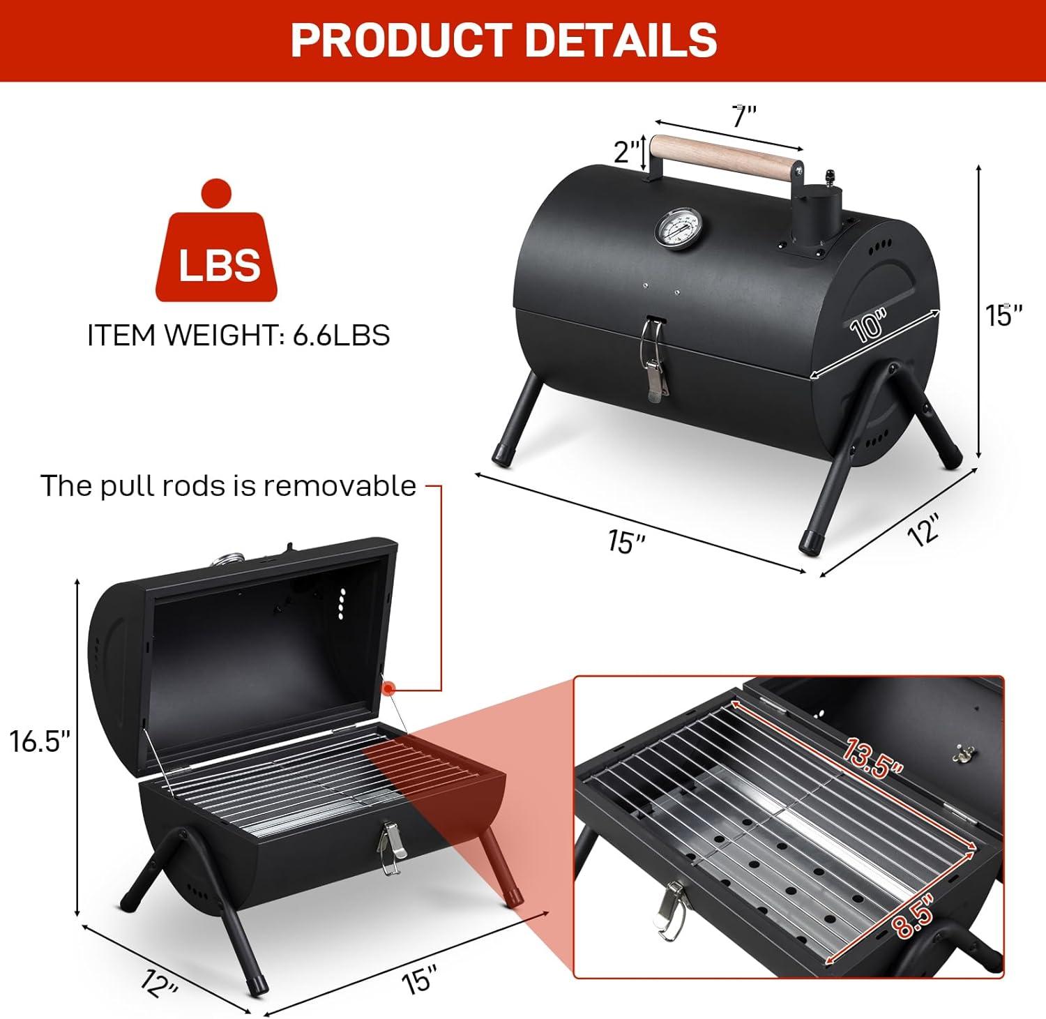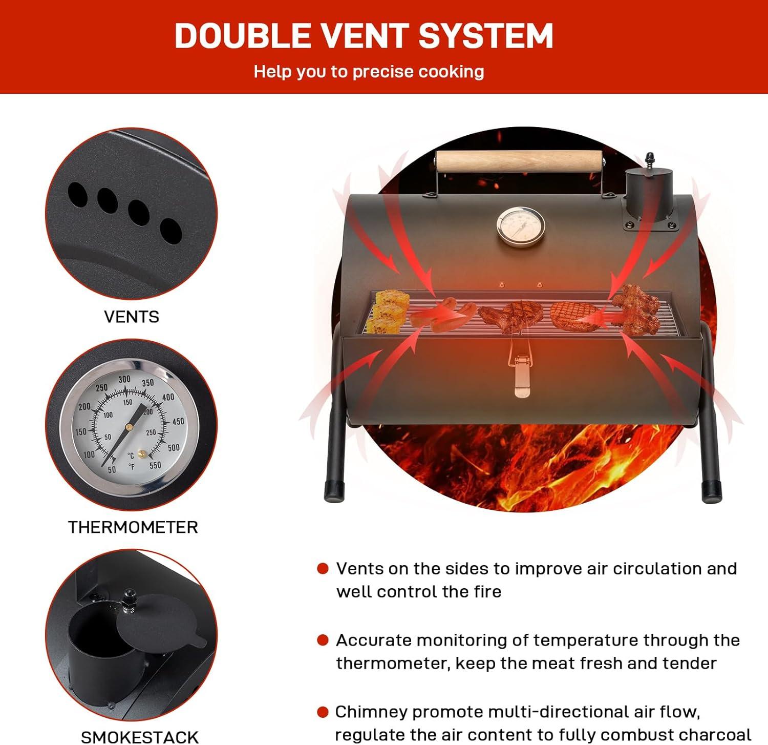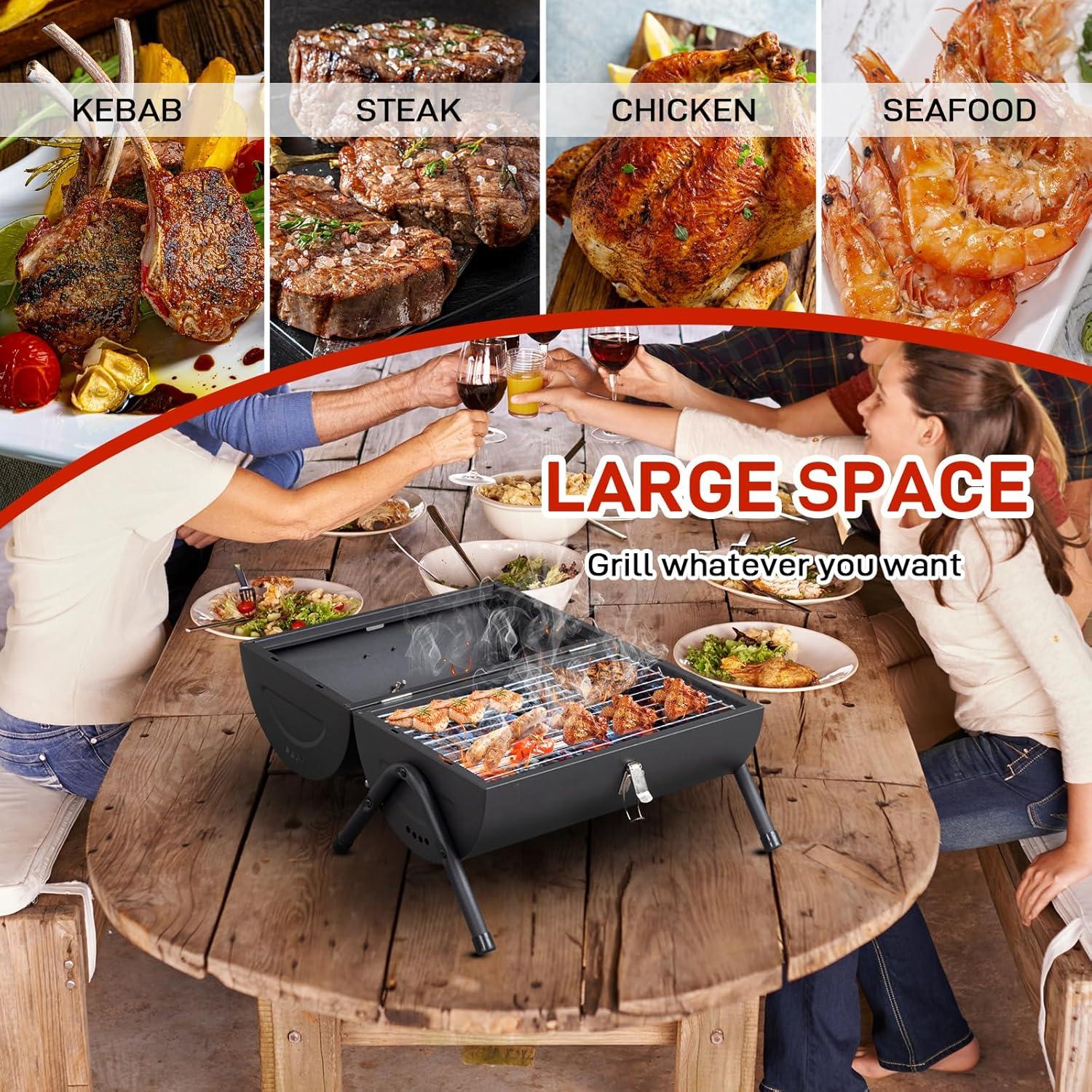 【Sturdy Stainless Steel】The durable charcoal grill is made of rust-resistant stainless steel. Designed with anti-slip foot and A-frame construction with extra support bar to ensure the stability and safety of the portable bbq charcoal grill during the grilling.