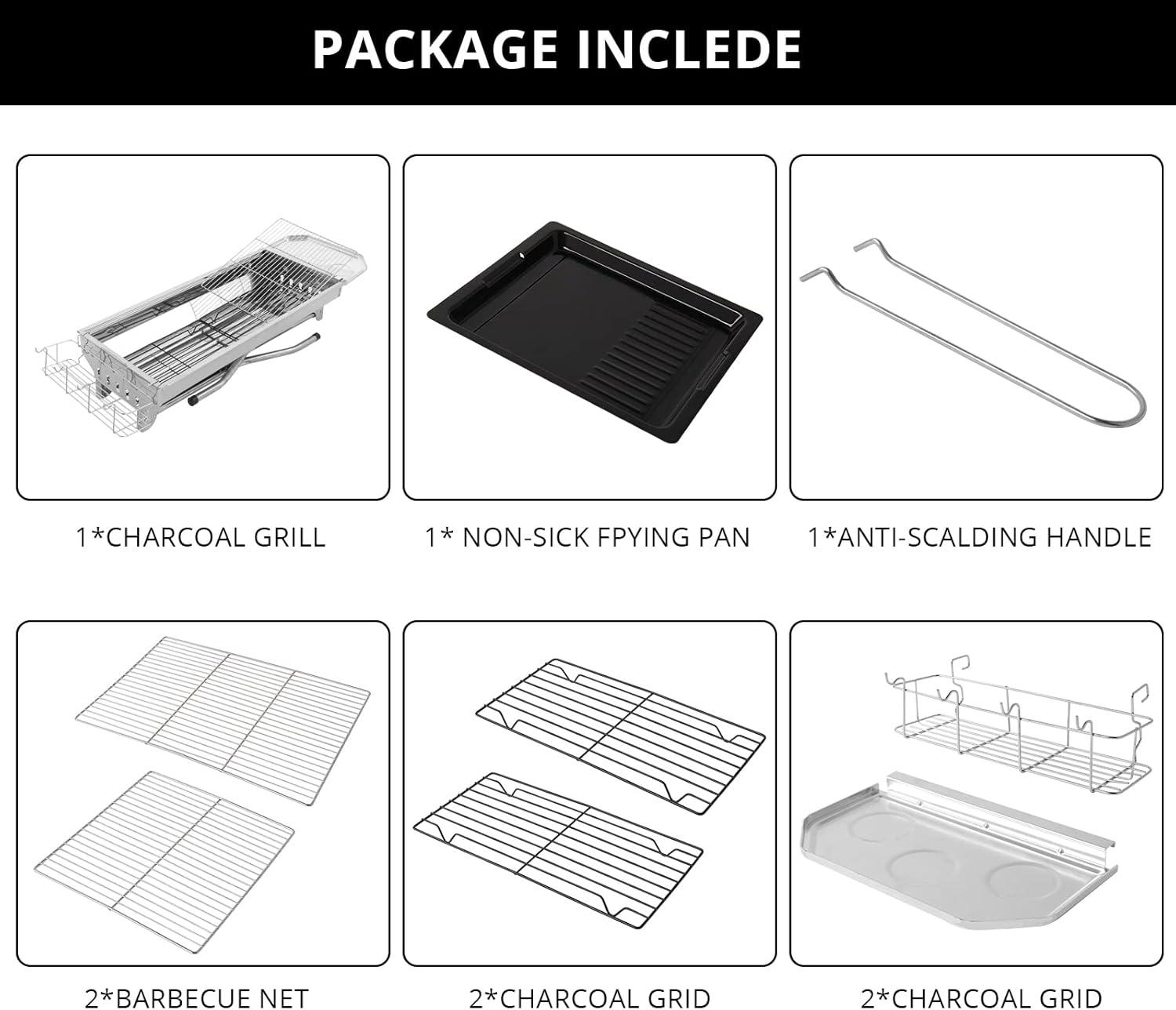 【Sturdy Stainless Steel】The durable charcoal grill is made of rust-resistant stainless steel. Designed with anti-slip foot and A-frame construction with extra support bar to ensure the stability and safety of the portable bbq charcoal grill during the grilling.