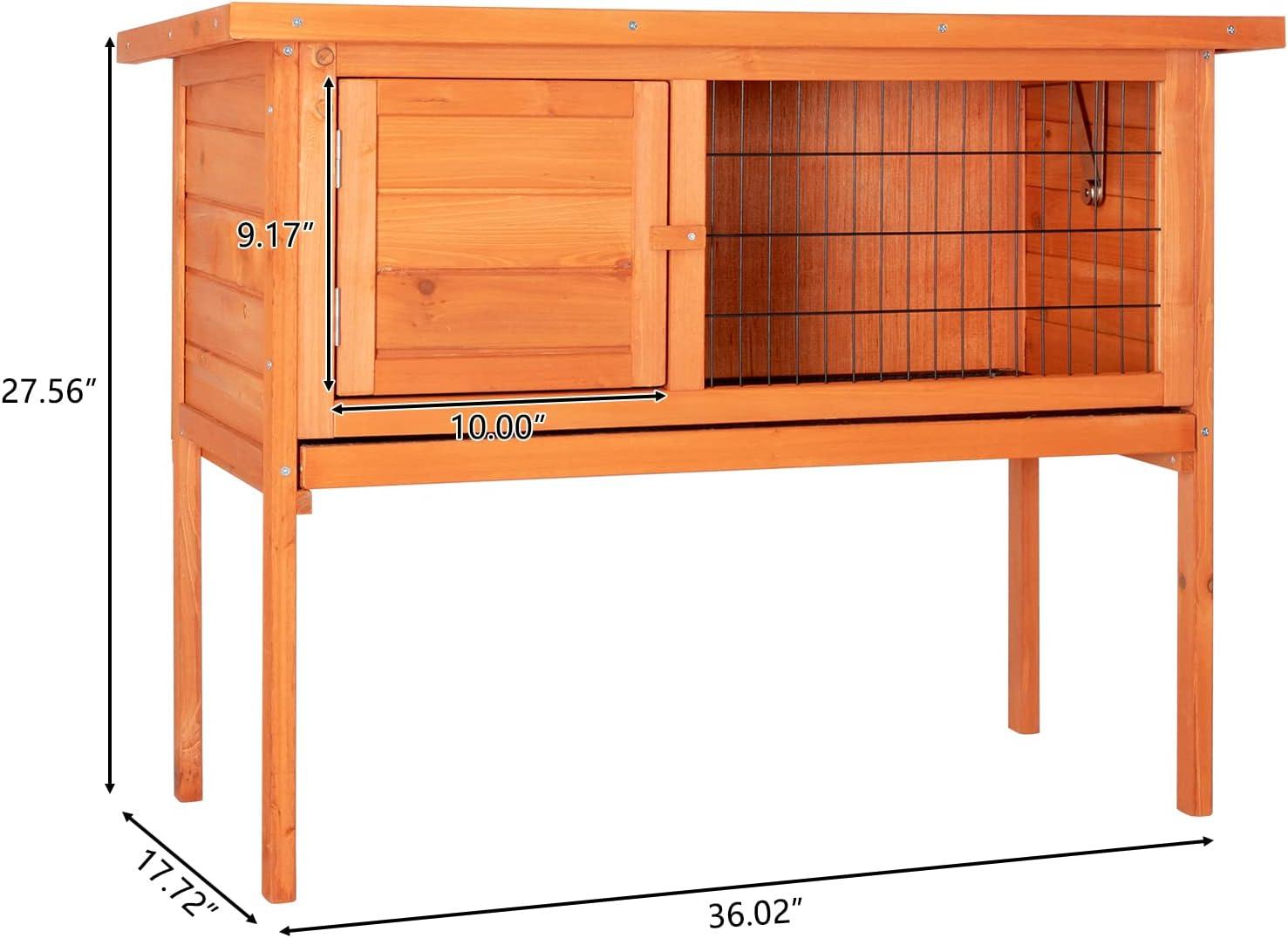 【Small Rabbit Hutch Information】Chicken cage overall dimensions is 36.02″L × 17.72″W× 27.56″H. And the door dimensions is 9.75″ W x 9.75″ H.