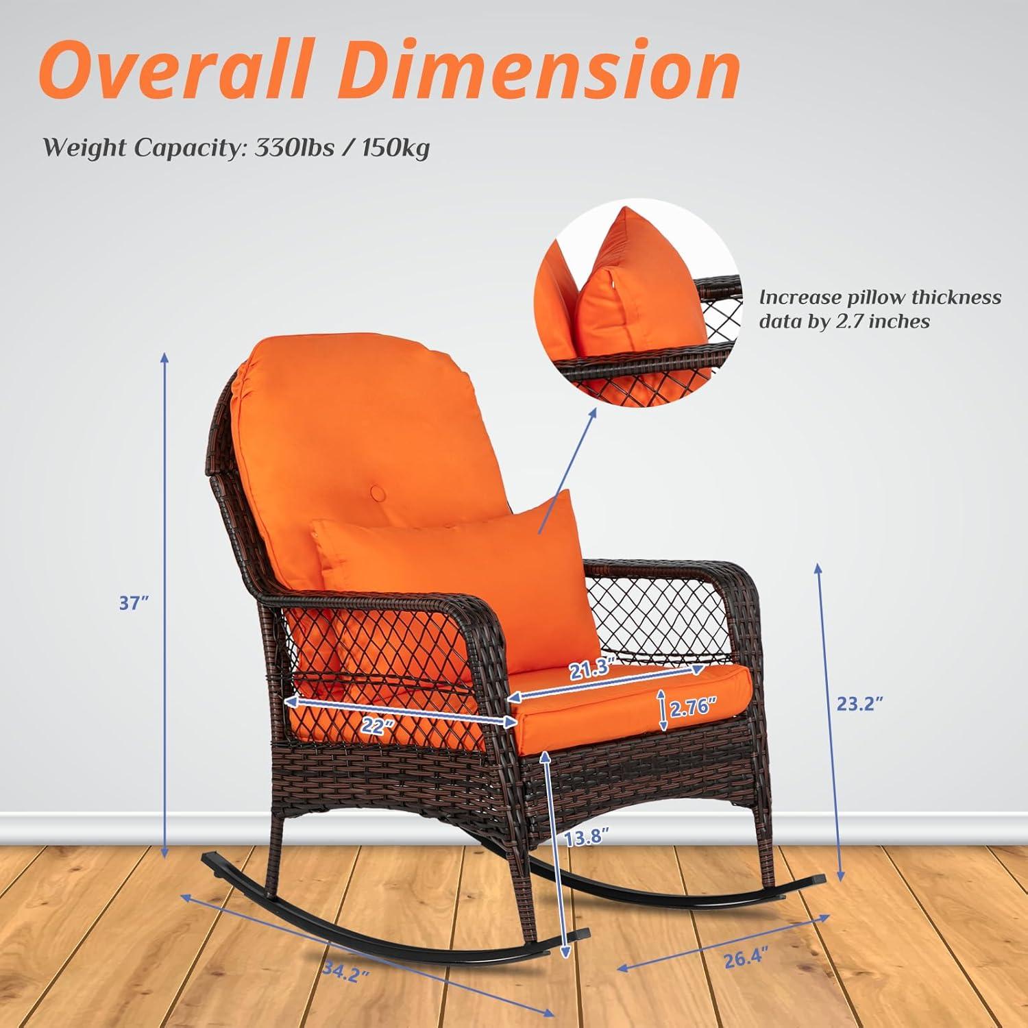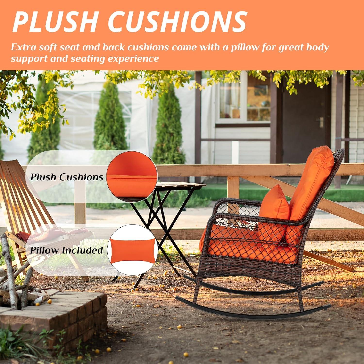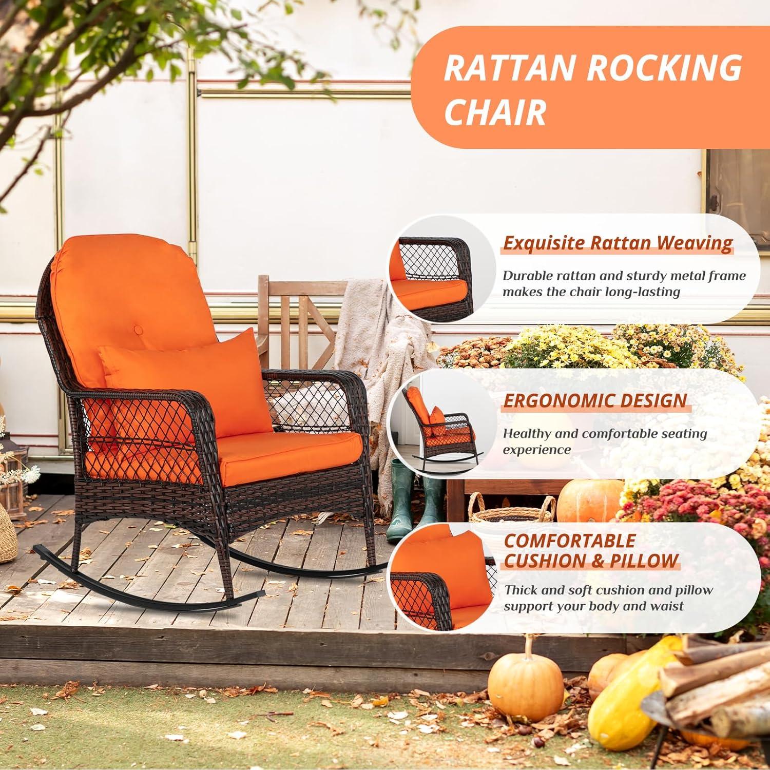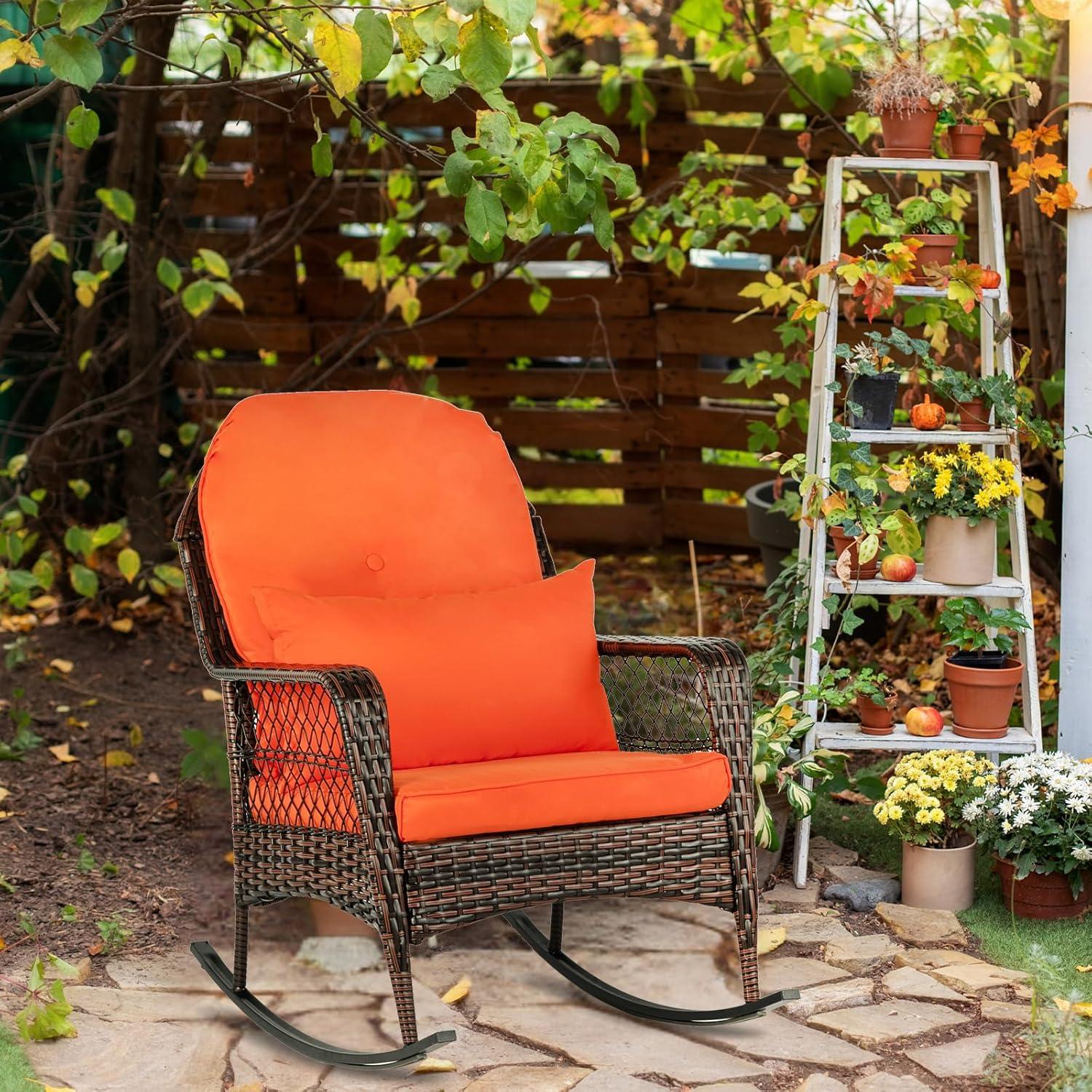Outvita Rocking Chair, Outdoor PE Rattan Rocking Chair with Soft Orange Cushion and Pillow for Patio, Porch, Poolside, Living Room