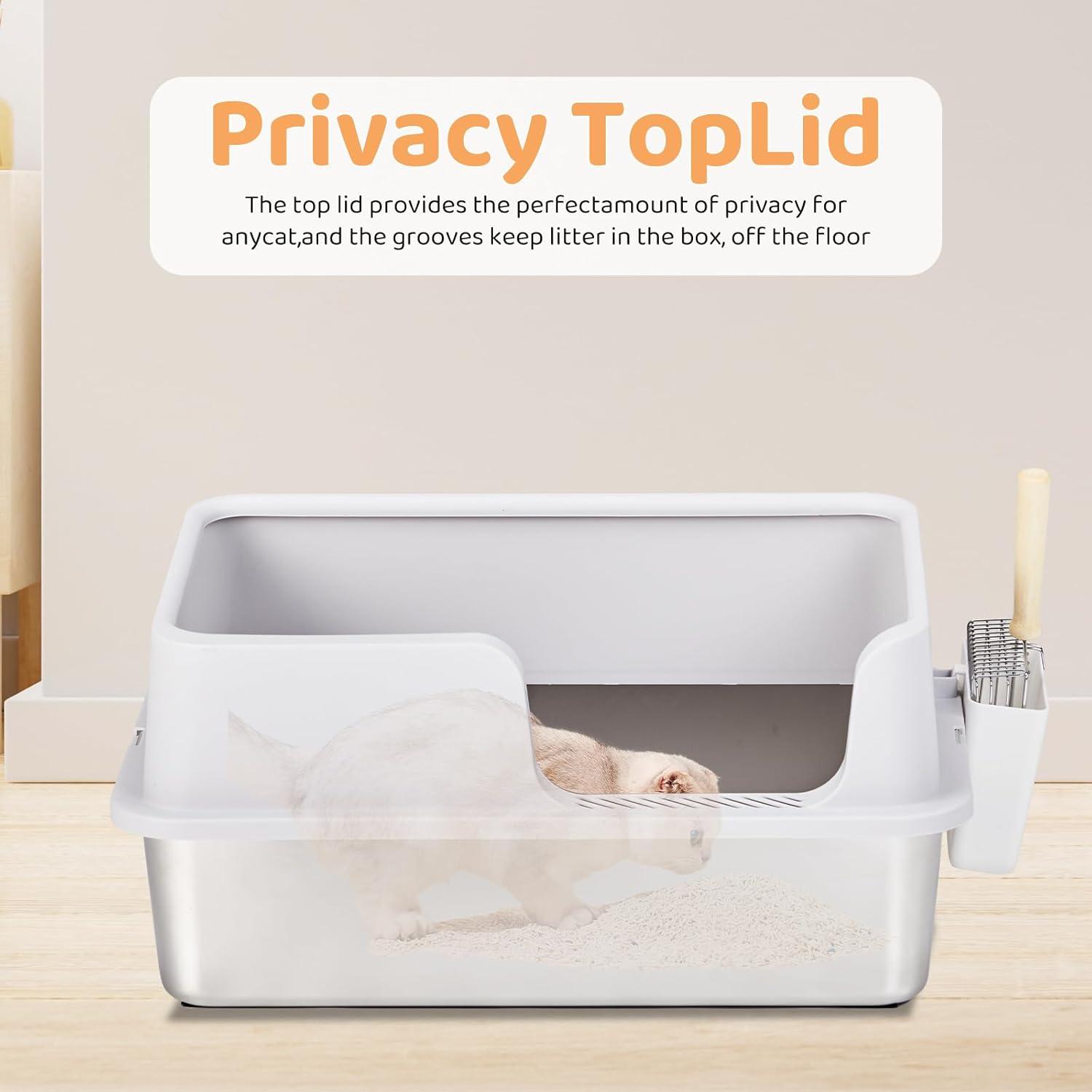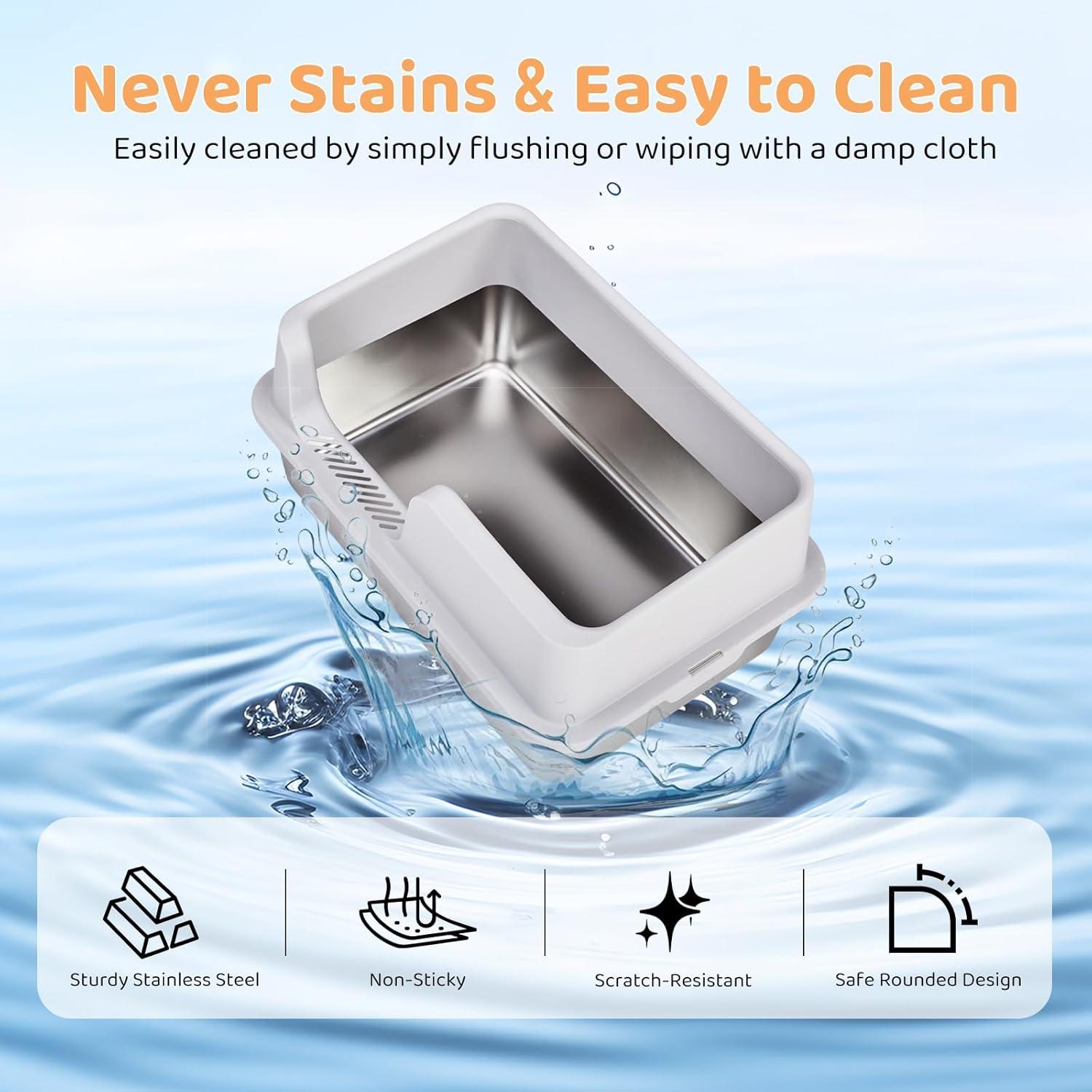 Effortless Cleaning: Our metal cat litter box comes with a cat litter scoop. The smooth stainless steel surface ensures that litter residue and smells are wiped away with minimal effort. What's more, the stainless steel material does not absorb odors or retain stains.