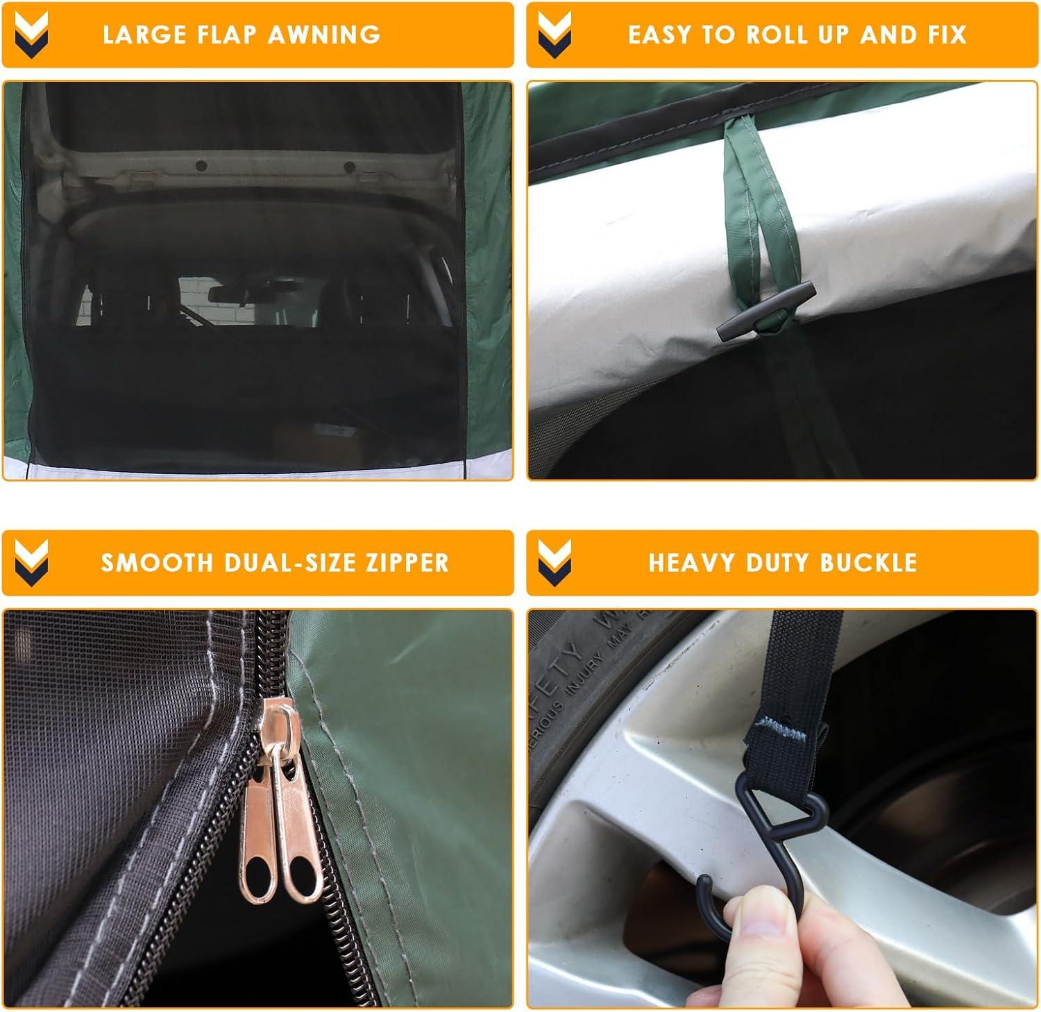 【Extra Space & Privacy】The glamping tent comes with an expandable awning to create a shaded space for the tailgate. The car awning can hold a camping table and chairs for 2-4 person to eat or play together. The mesh screen provides ventilation while keeping mosquitoes out. In addition, the awning can also be used as a cover and closed for privacy.