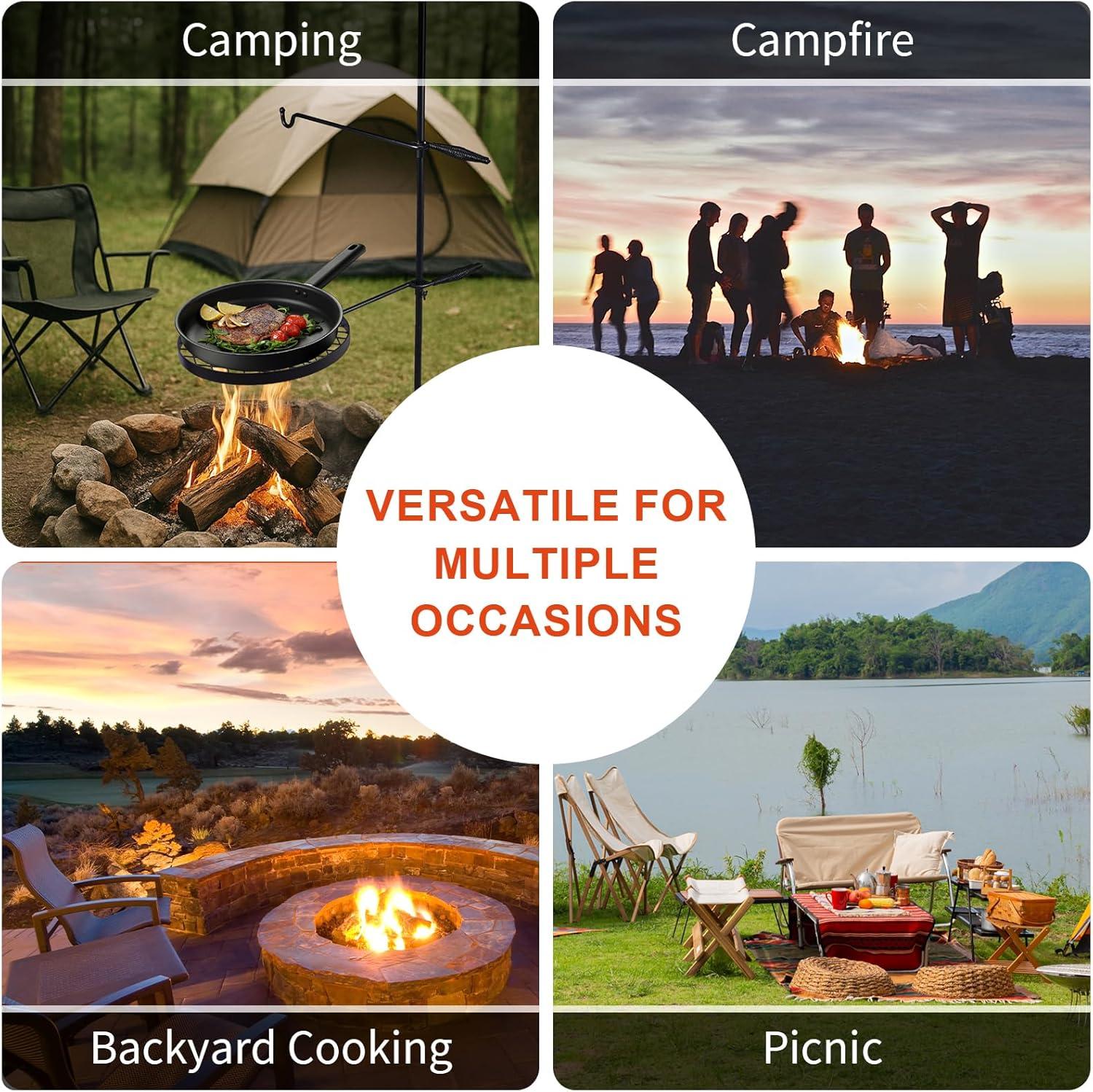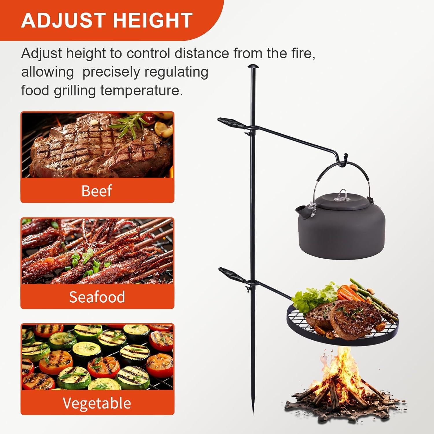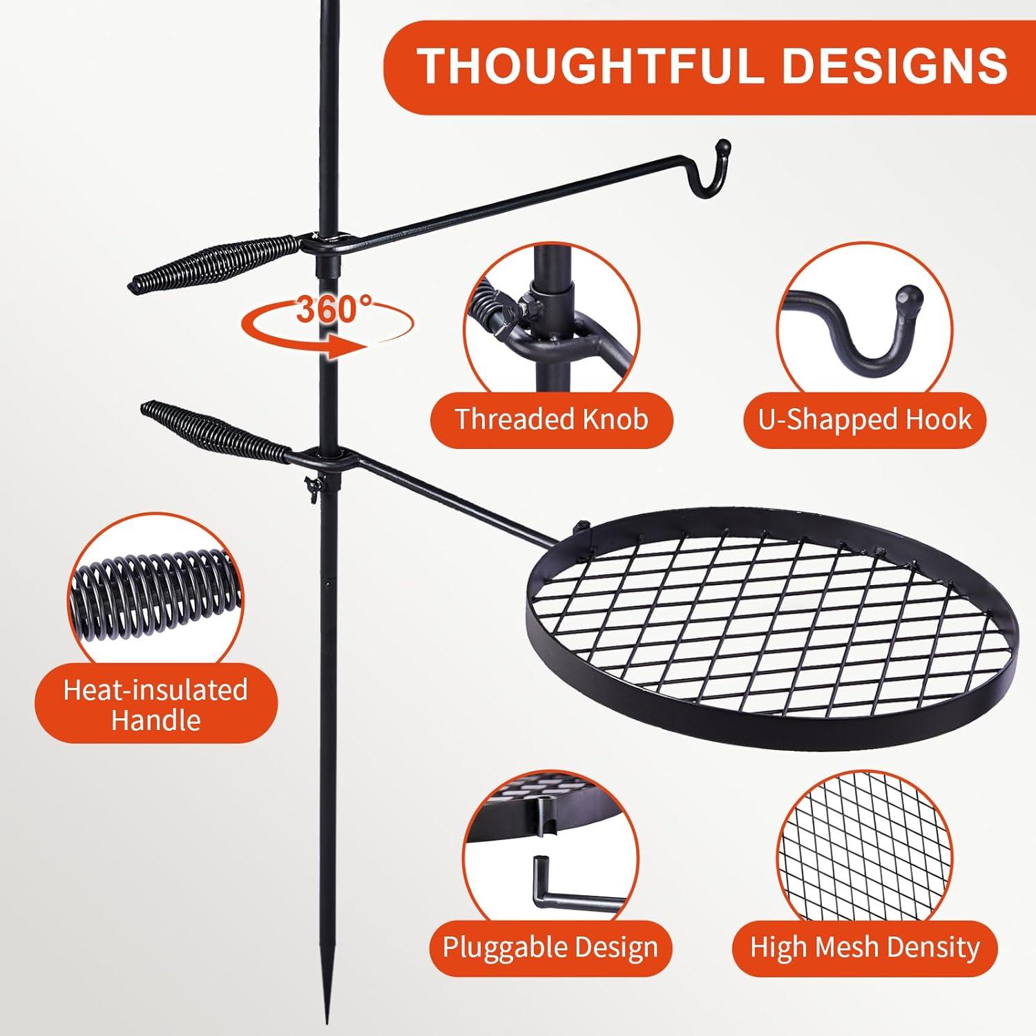 【Versatile Cooking Options】Includes a swivel grill grate for direct grilling or holding pans, plus a hanger rod perfect for kettles or Dutch ovens—ideal for all types of open fire cooking