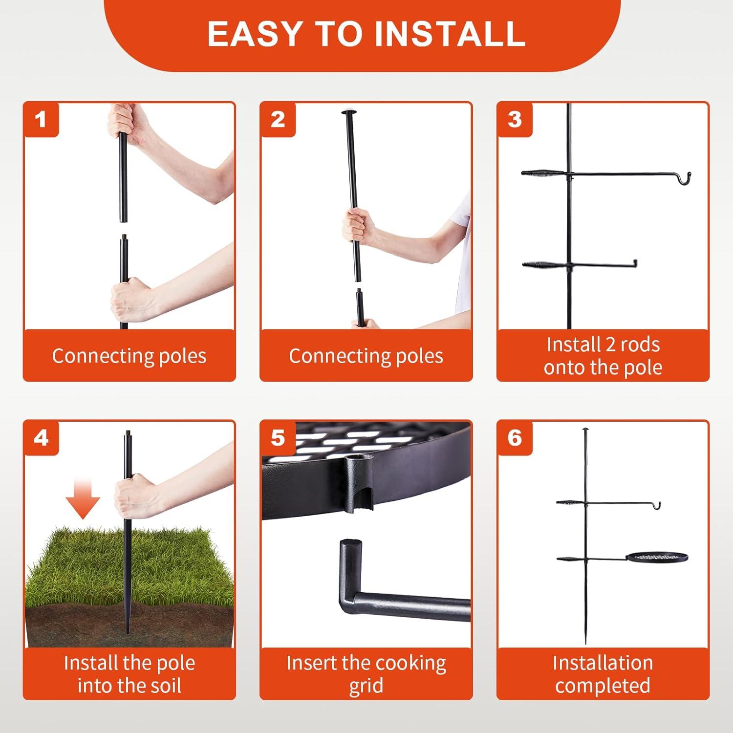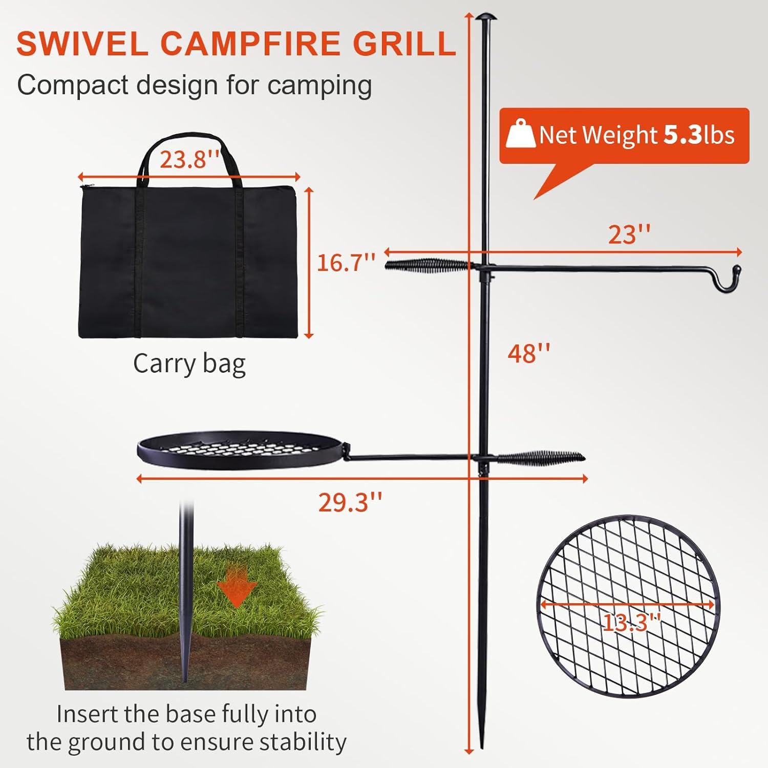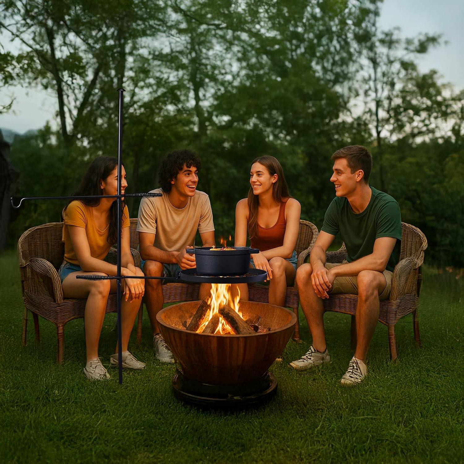 【Versatile Cooking Options】Includes a swivel grill grate for direct grilling or holding pans, plus a hanger rod perfect for kettles or Dutch ovens—ideal for all types of open fire cooking