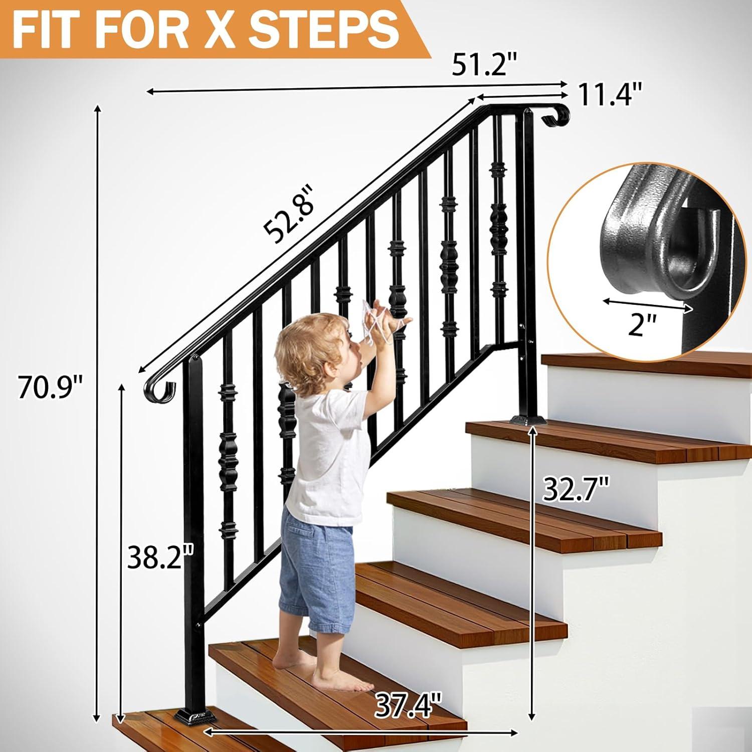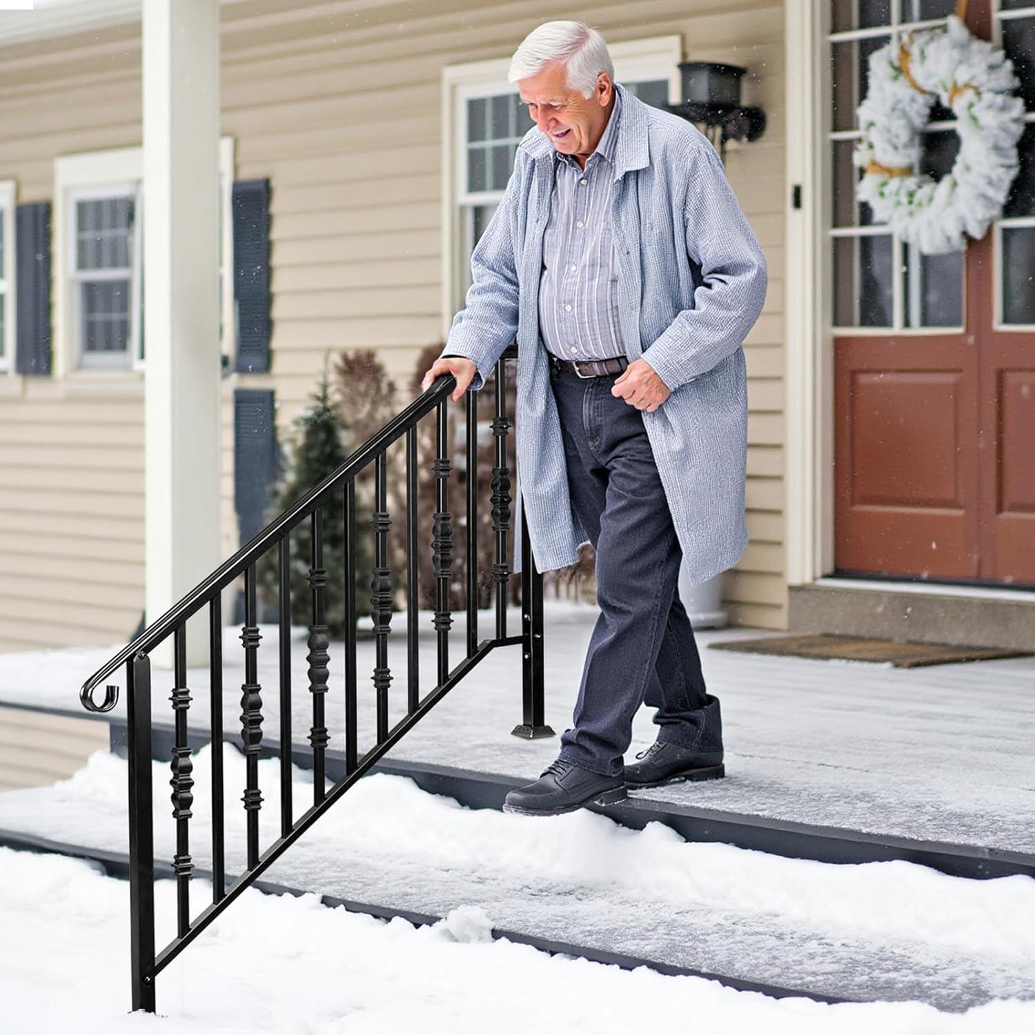 Sturdy & Weather-Resistant: Crafted from premium galvanized iron, this handrail ensures exceptional stability and durability, easily enduring harsh outdoor elements like rain and snow. The thick black powder coating enhances its longevity by minimizing scratches and discoloration.