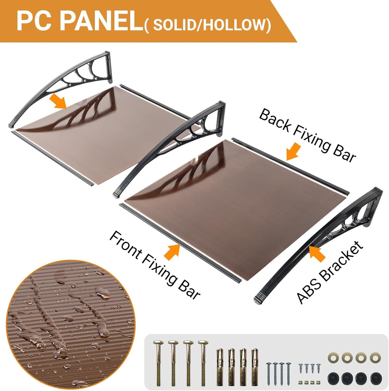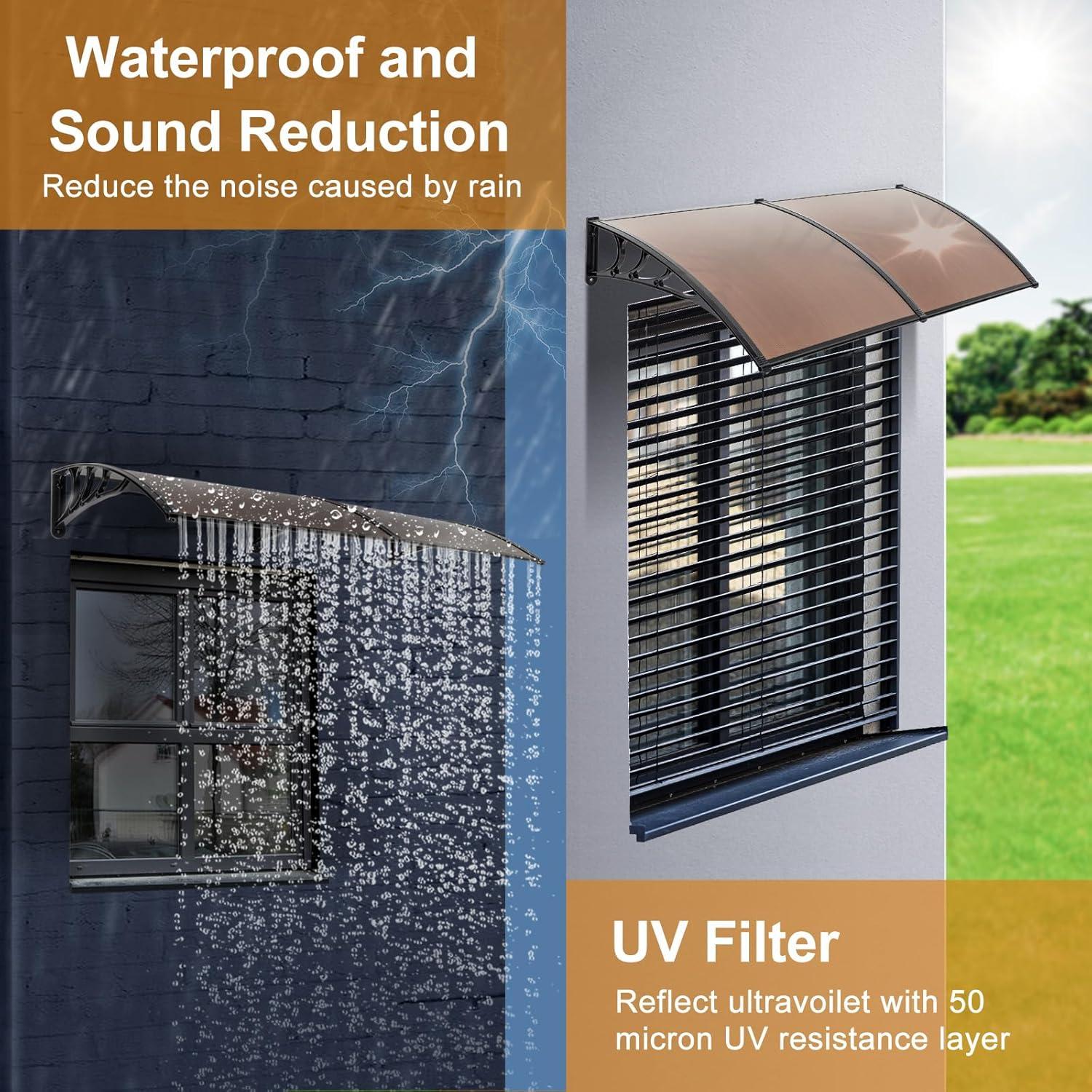 【DURABLE MATERIALS】 – Patio door window awning canopy is made of a 5mm clear hollow polycarbonate panel, ABS firm bracket and aluminum bar, this awning resists rusting and corrosion from the elements. Upgraded one piece seamless surface, no water leaking, looks sleek, lightweight but sturdy.