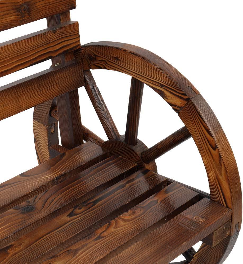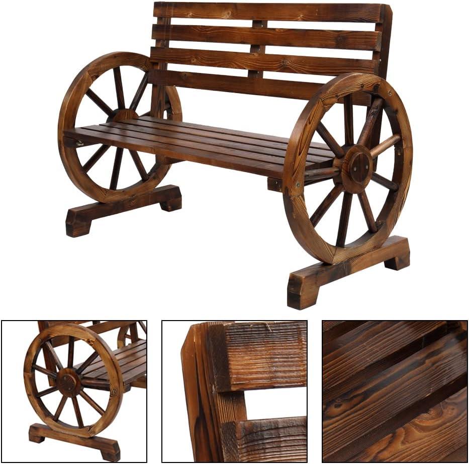 【STABLE STRUCTURE】This garden wagon wheel bench is made of 100% fir wood and handled with burn finish to resist corrosion and water, making this outdoor rustic bench more durable and longer lasting. Our wooden wagon wheel bench is made from FSC-Certified wood. The construction is strong enough to hold up to 550 pounds, providing a solid seating area year after year