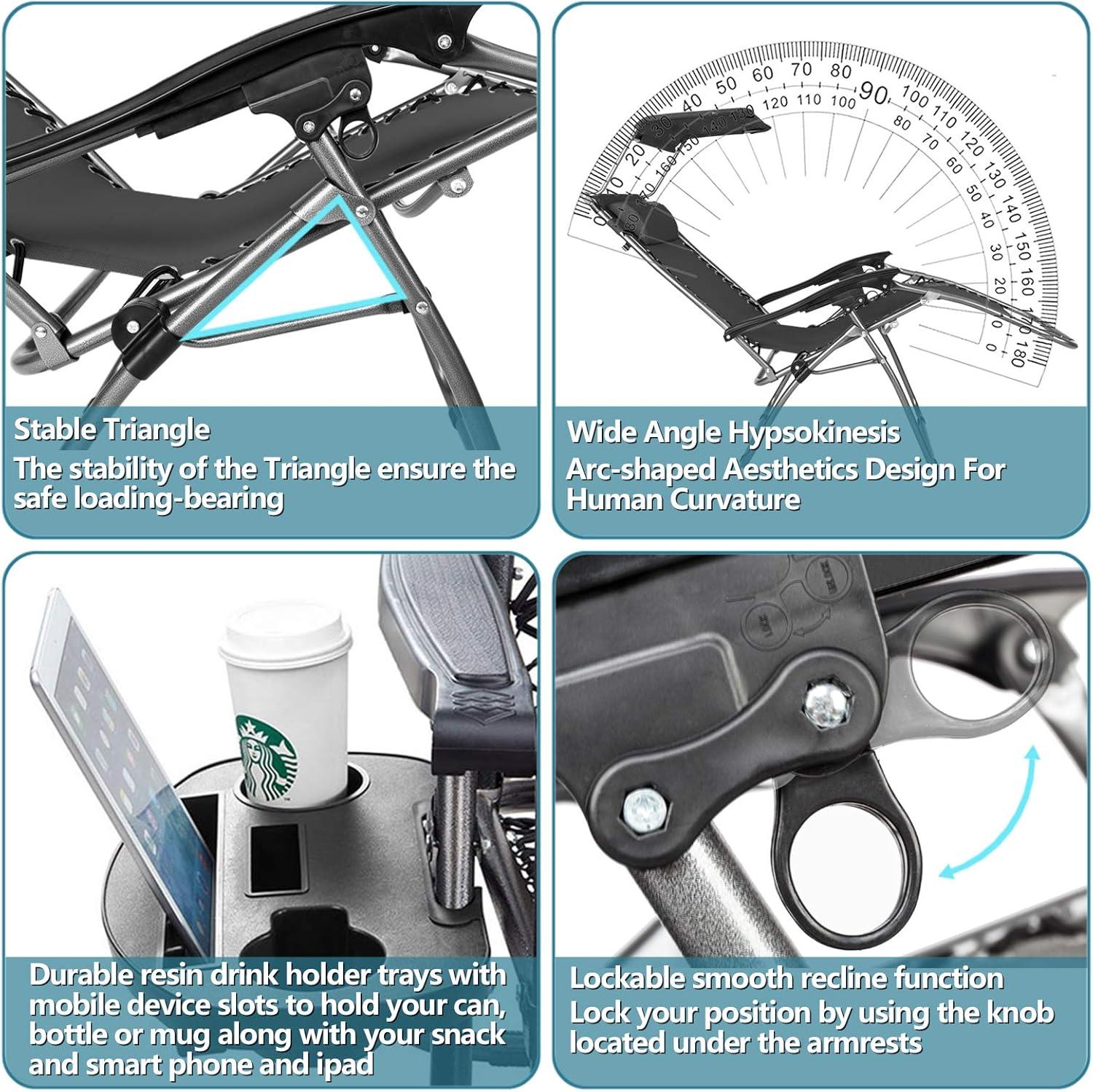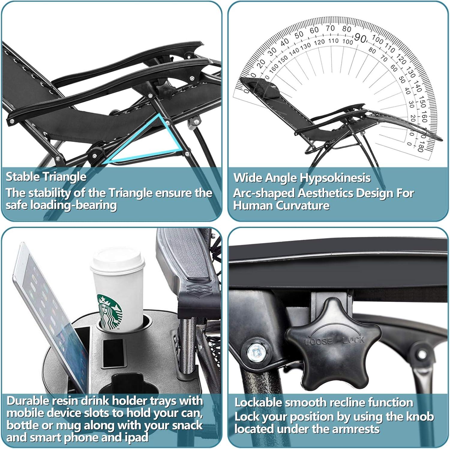 【LOCKABLE RECLINE DESIGN】The foldable lounge chair can be effectively locked in ergonomic zero-gravity position by adjusting the twist knob. Supportive slanted high backrest and armrest relieve pressure on the neck and shoulders, providing a comfortable sitting position